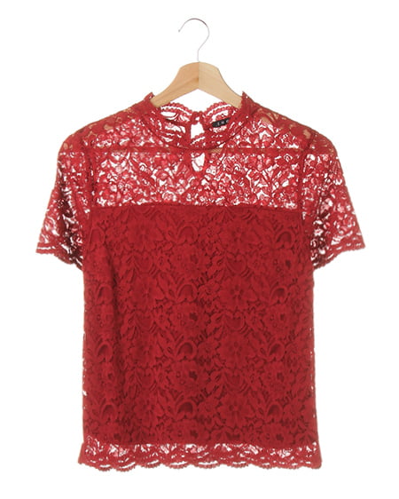 全面レースで仕上げたトップスは衿、袖、裾にスカラップデザインを取り入れることでガーリーな雰囲気に。プチハイネックでクラシカル要素もプラスしています。バスト上からショルダーにかけて肌が透けて見えるのが◎。身頃部分には裏地が付いているのも嬉しいポイントです。ふんわりスカートに合わせて着こなすのがおすすめ。