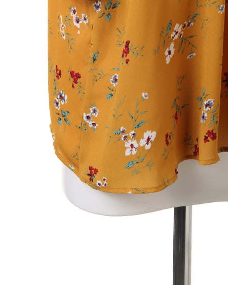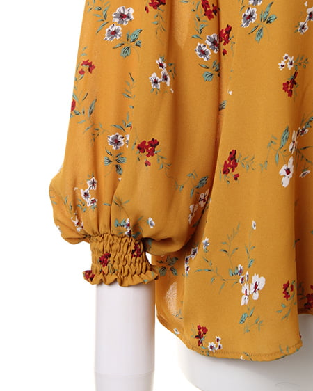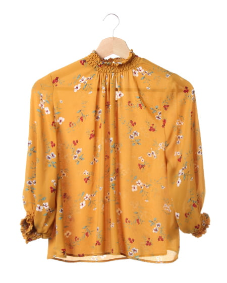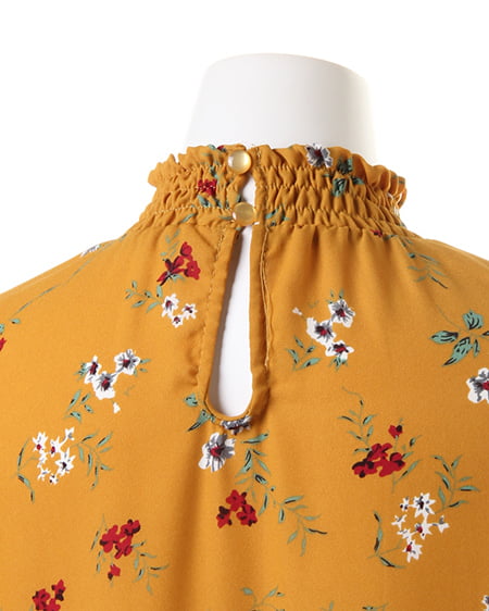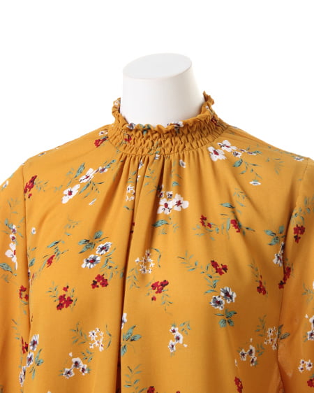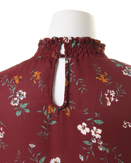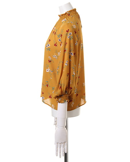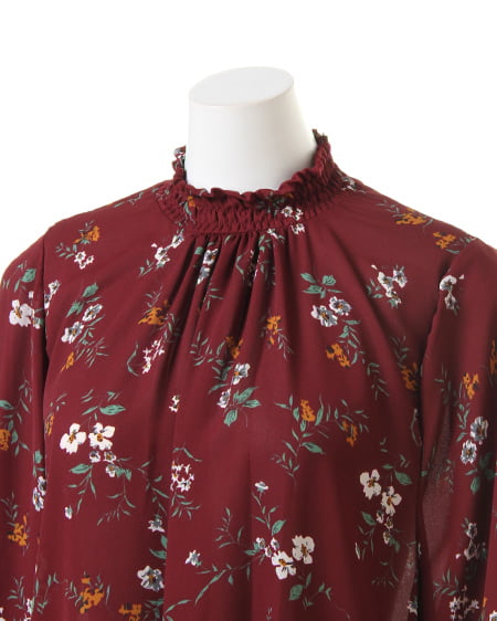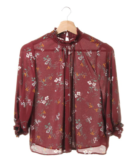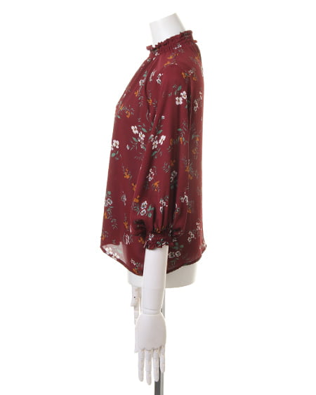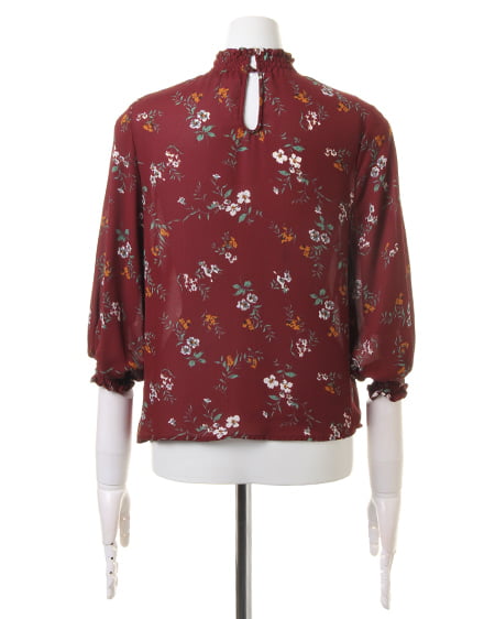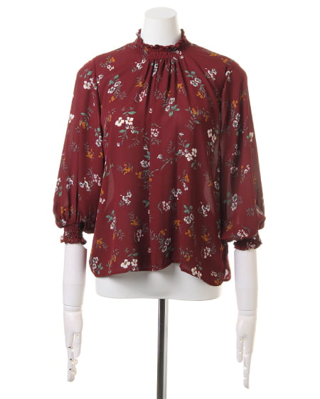 小さめのフラワーを全体にあしらったブラウスは、スタンドネックでクラシカルな雰囲気。薄手のさらりとした素材で、軽やかな着心地。袖部分はゴム入りのデザインになっているので、ブラウジングして着てもオシャレに。首元にダーツを入れ、裾へ向かってフレアになるシルエットがフェミニン。落ち着いたカラーで着まわしやすいのもポイントです。