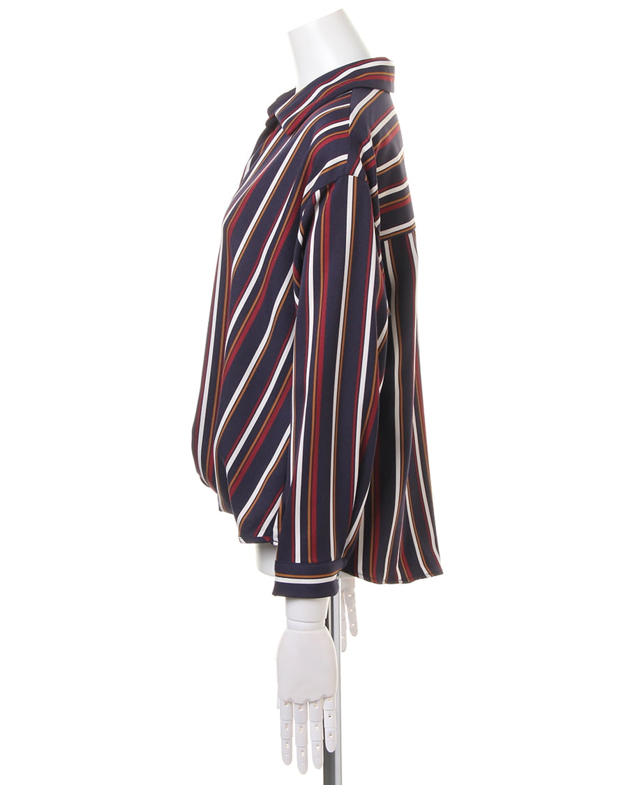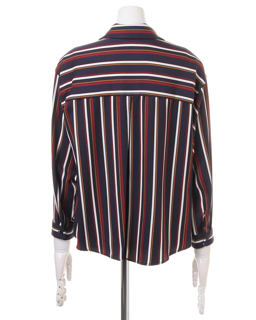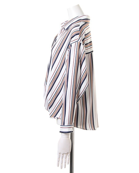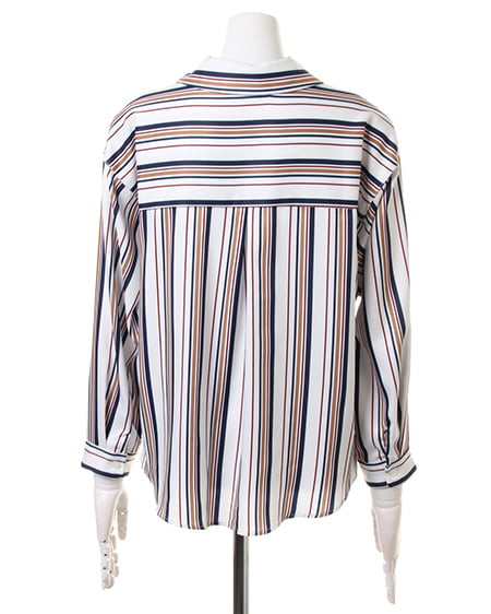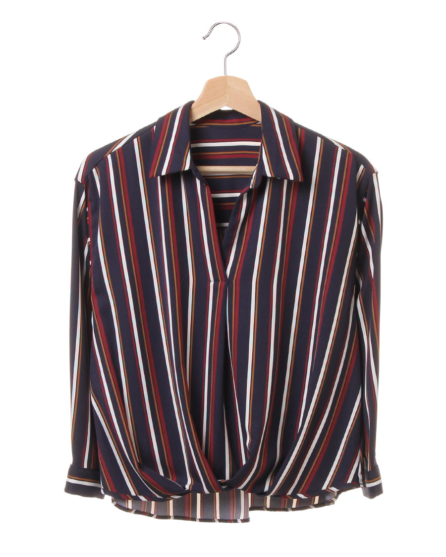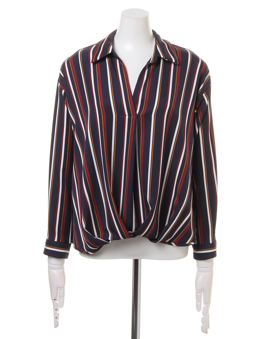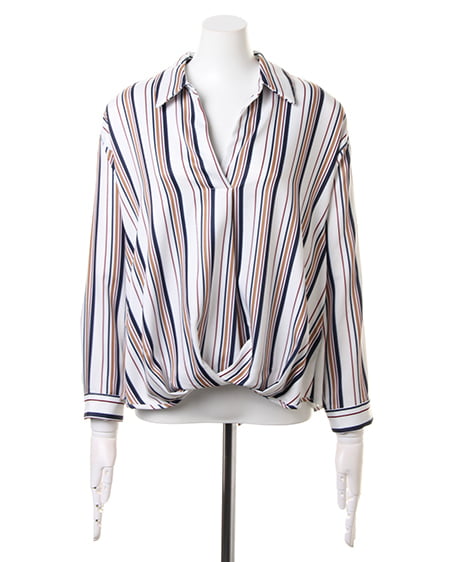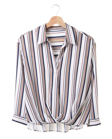 カジュアルスタイルにぴったりのマルチストライプが、コーディネイトの主役になる1枚。滑らかで落ち感のある素材と、ゆったりめの身頃が着やすい。スキッパーデザインで、小顔効果も期待できます。フロント裾はタックを入れたカシュクールデザインで、大人っぽく。1枚で着るのはもちろん、シャツインスタイルもすっきりキマります。