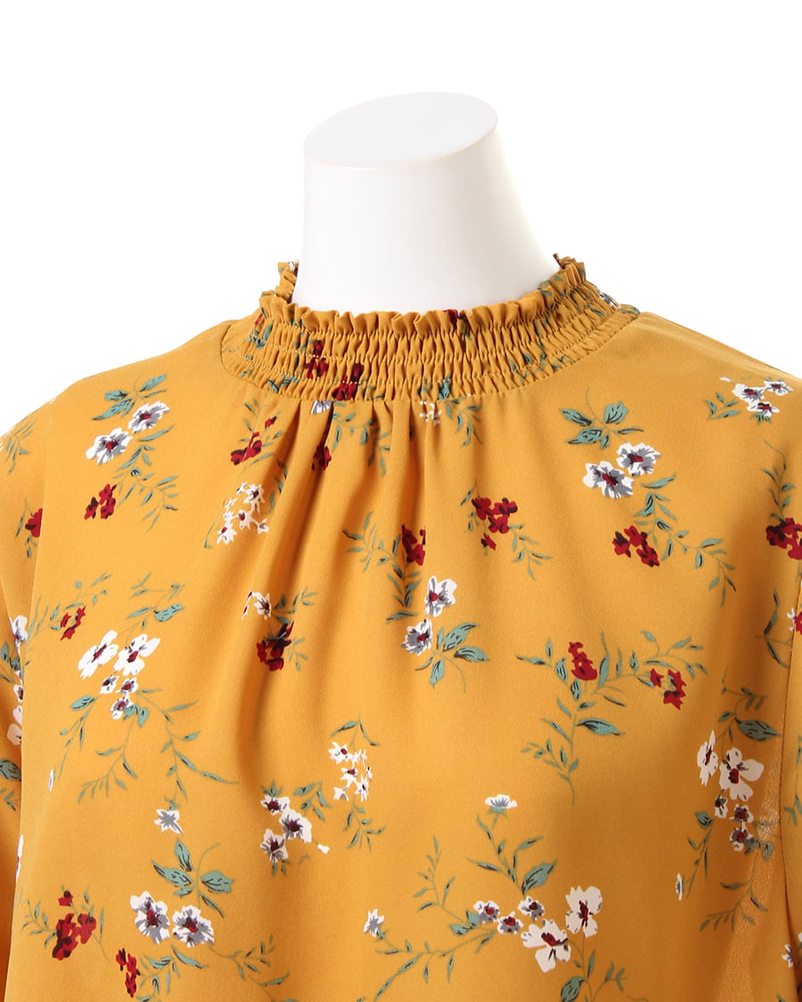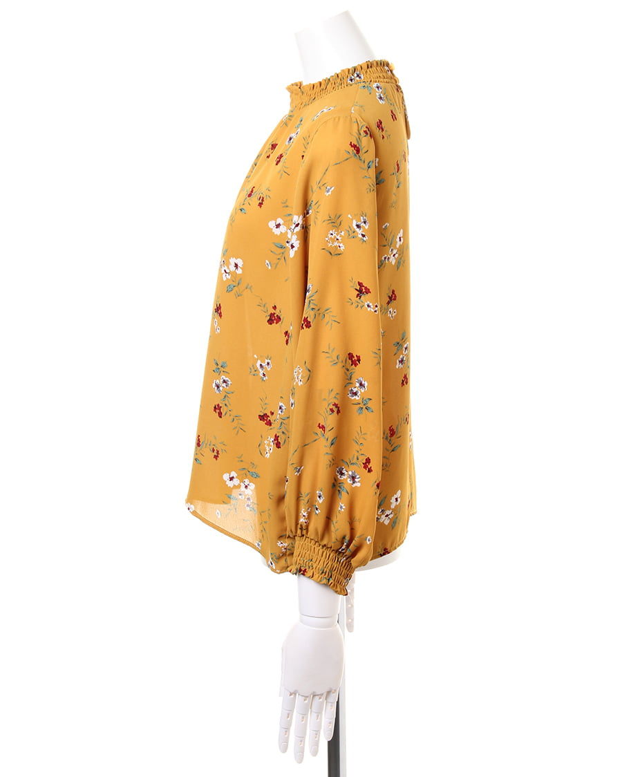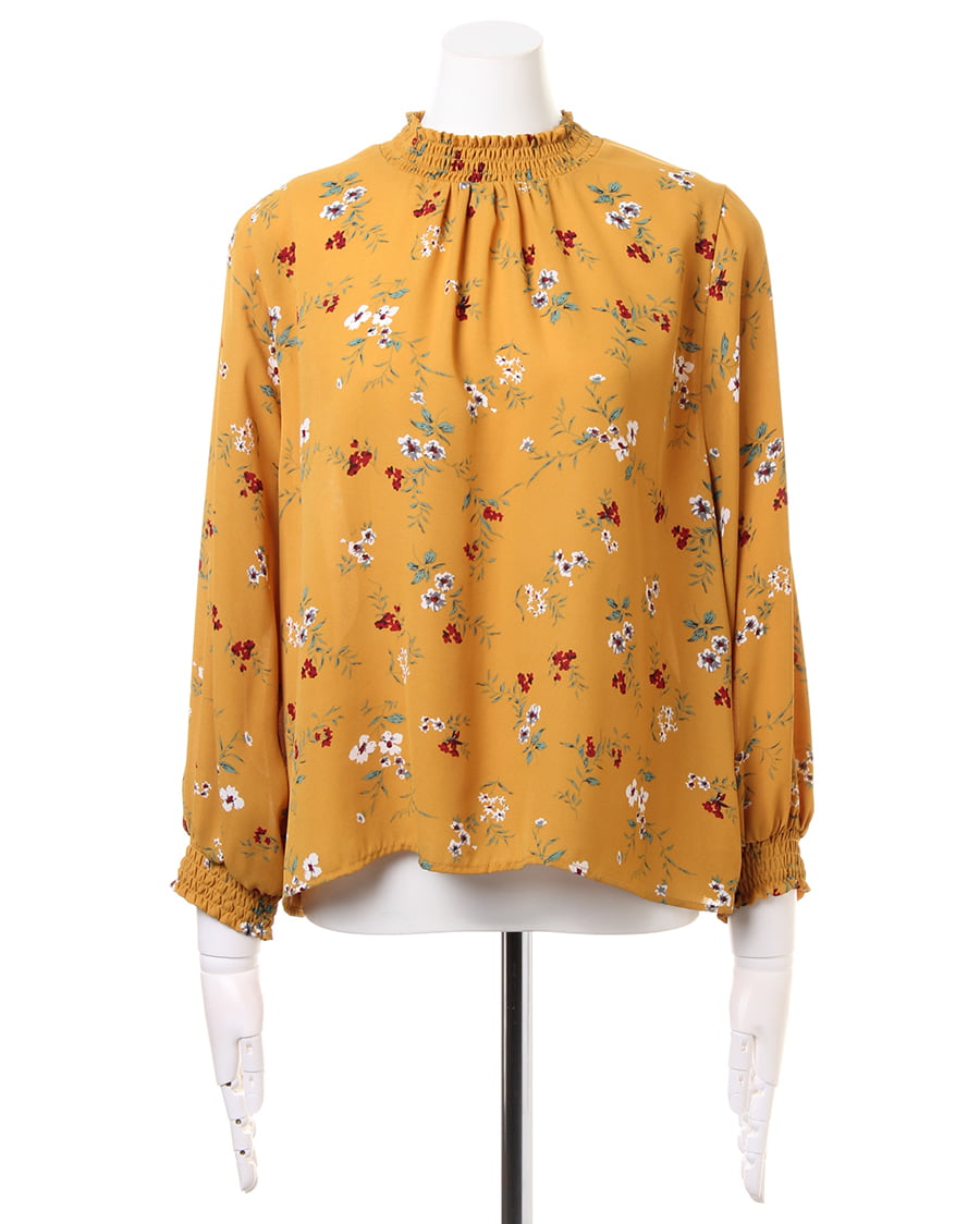 さらりとした軽やかな生地がトレンドライクなブラウス。首元のシャーリングしたスタンドネックや、袖口がポイント。クラシカルな雰囲気の花柄は、コーデの主役になるアイテムです。シワになりにくい生地で、お手入れが楽なのも魅力的。一枚ではもちろんアウターのインナーとしてもロングシーズン使えます。ゆったりした身頃で抜け感を演出。