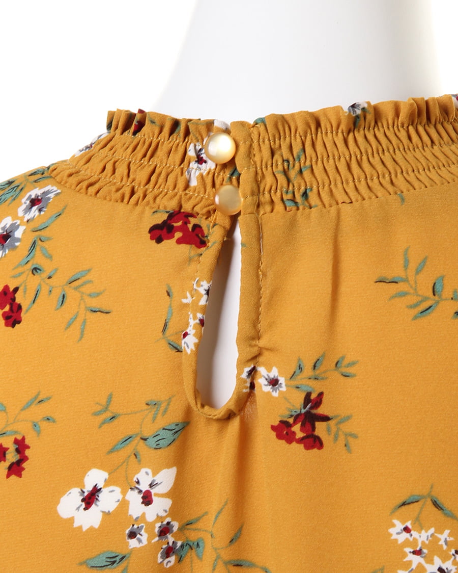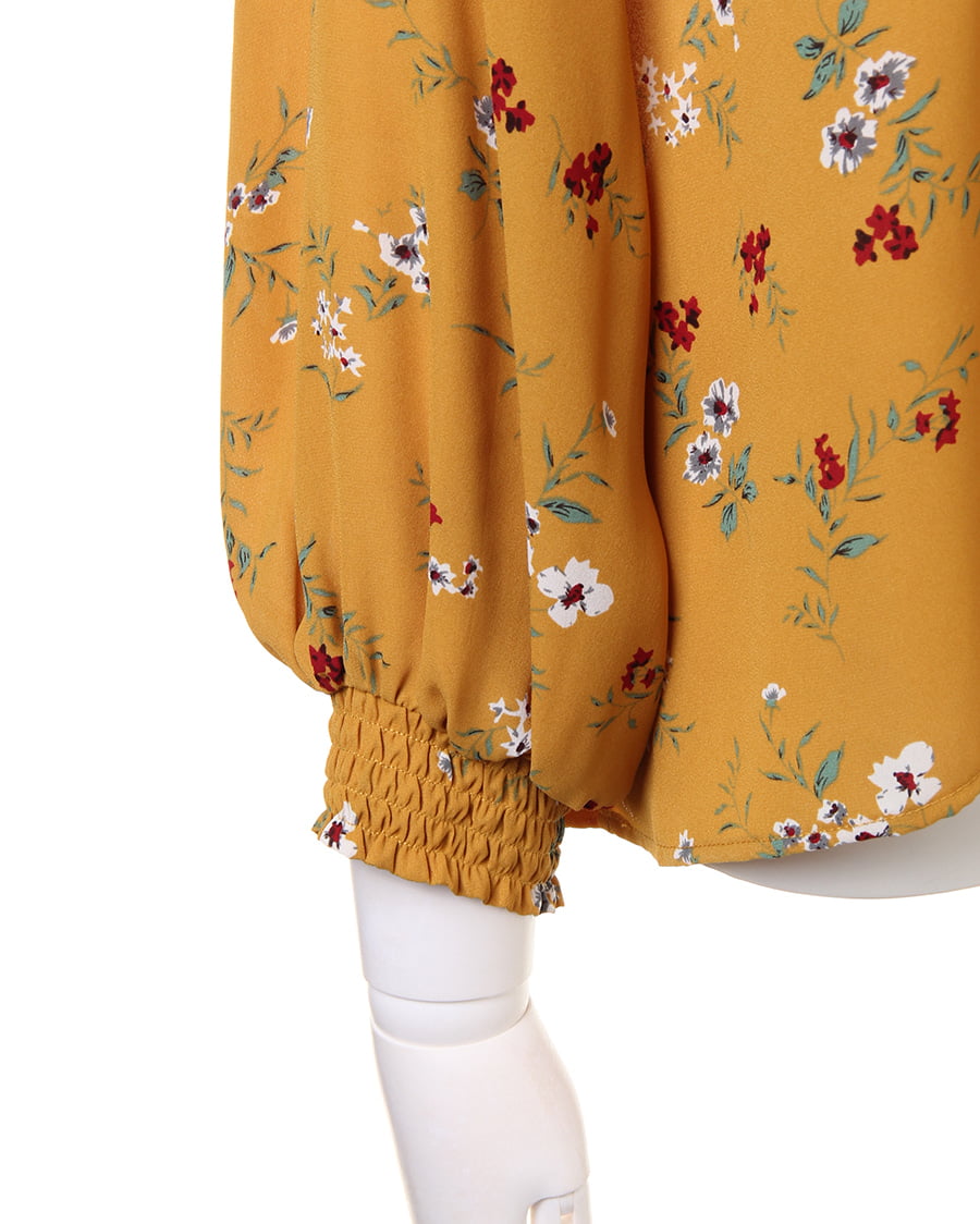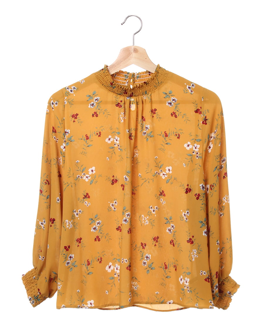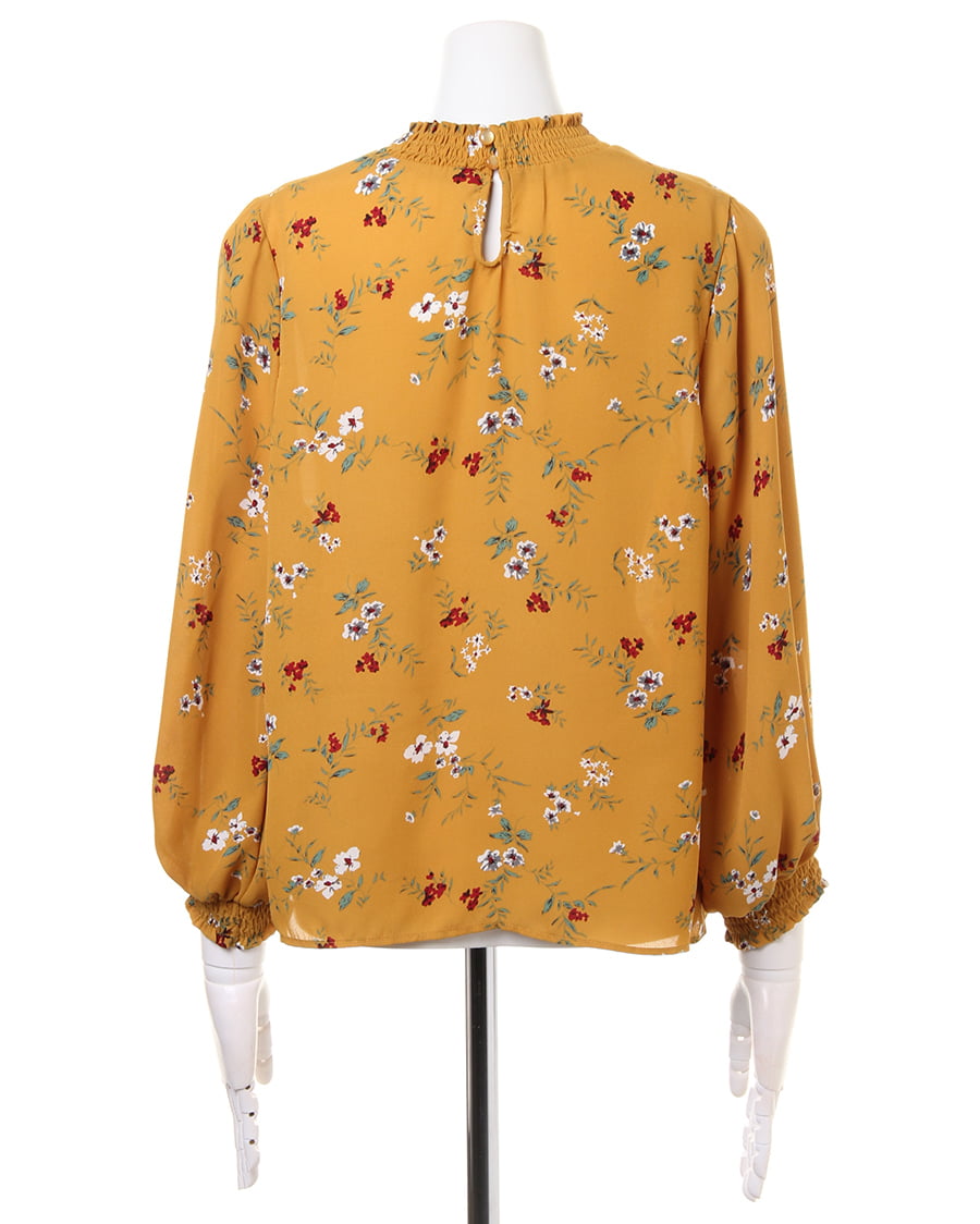 さらりとした軽やかな生地がトレンドライクなブラウス。首元のシャーリングしたスタンドネックや、袖口がポイント。クラシカルな雰囲気の花柄は、コーデの主役になるアイテムです。シワになりにくい生地で、お手入れが楽なのも魅力的。一枚ではもちろんアウターのインナーとしてもロングシーズン使えます。ゆったりした身頃で抜け感を演出。