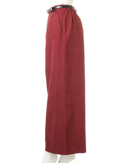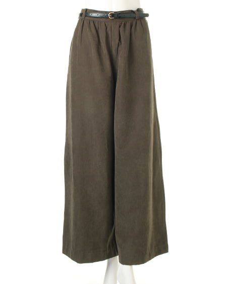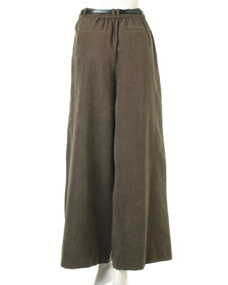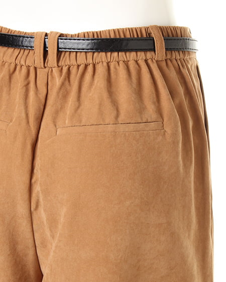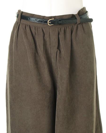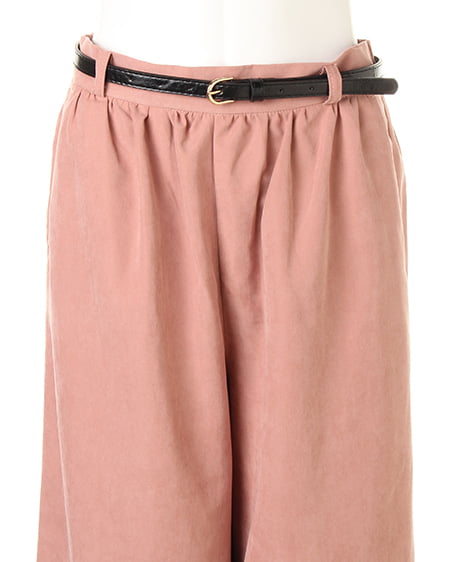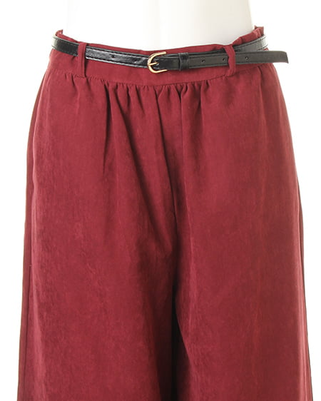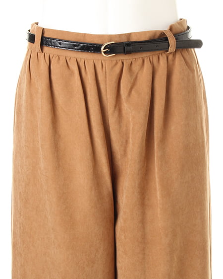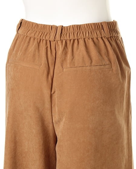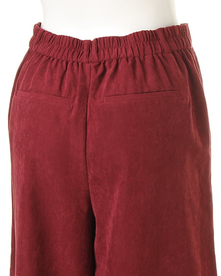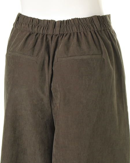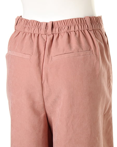光沢のあるピーチ素材が、シーズンムードを高めるワイドパンツ。落ち感のあるリラックスなシルエットが大人っぽく、ラフに着てもこなれた雰囲気に仕上がります。微起毛の表面感に、上品な艶がエレガントなピーチ素材を使用。ギャザーを施したウエストが、トップスインに最適なワイドパンツ。色違いで欲しくなるカラーバリエーションにも注目です。