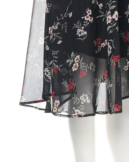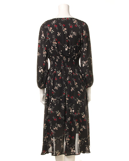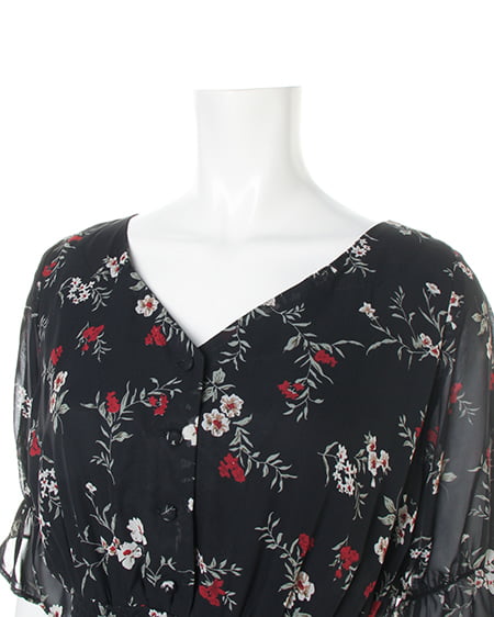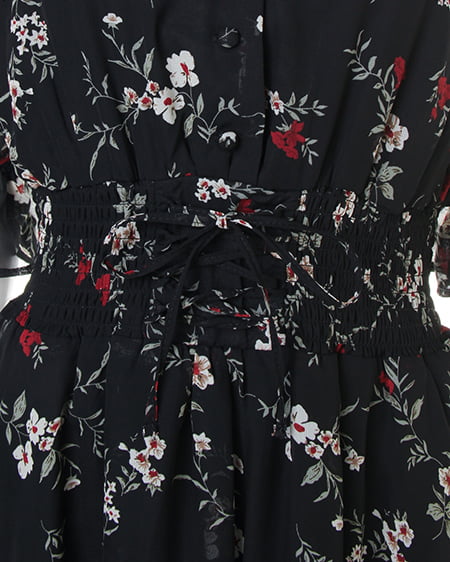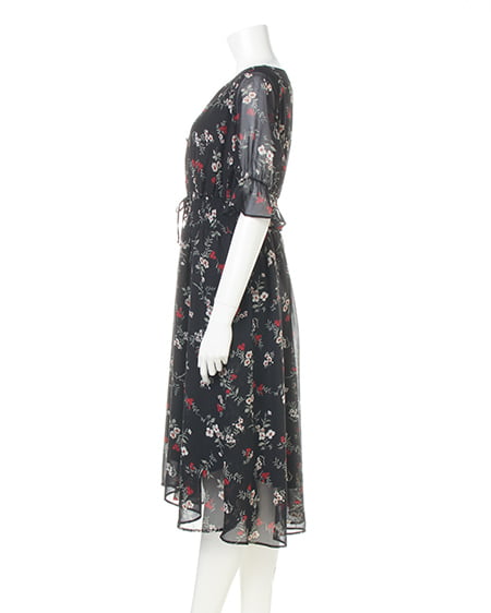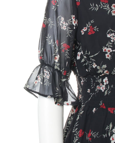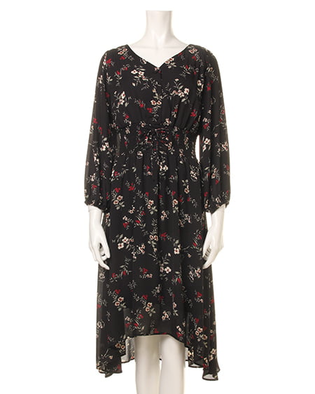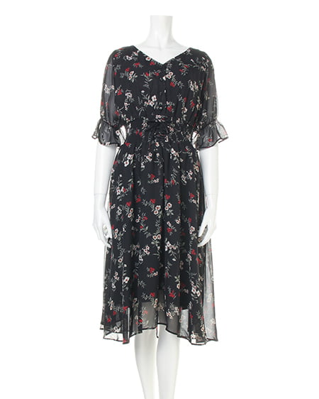 ふわっと可愛らしいフラワープリントのワンピース。花柄プリントと、ひらひらと動きのあるフレア袖がフェミニンな女性らしさを引き立たせてくれます。ウエスト部分は、フィット感の良いゴムギャザーでメリハリをプラスしました。レースアップの紐のすべりも良いので簡単に結べます。スカートに前後差を入れることで大人っぽく仕上がるだけでなく、動くたびにゆれるドレープが魅力◎。