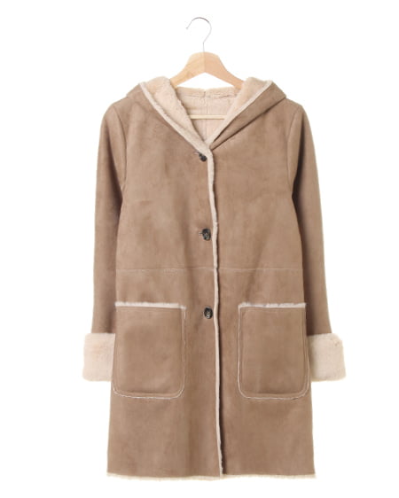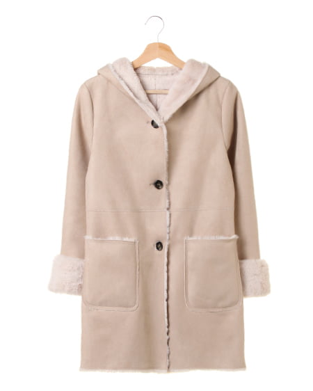 フード付きでカジュアル感たっぷりの、フェイクムートンコートが到着です。ベーシックなシルエットで動きやすく、着心地も快適。袖にあしらったファーが、アクセントになっています。光沢感を抑え、上品な印象に。軽くて暖かいのはもちろん、リバーシブル仕様で、ボア面をフロントにして着られる新鮮なデザインが◎。大きめのポケット付きなのもポイント。