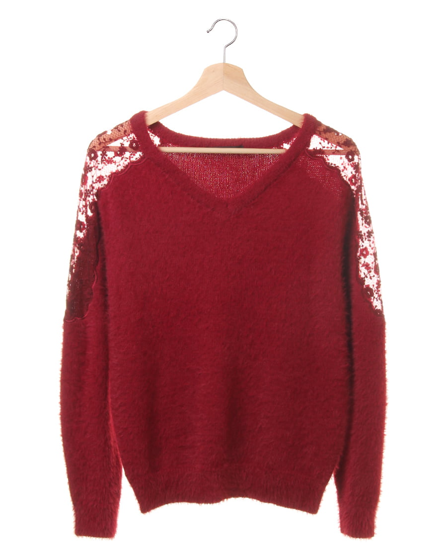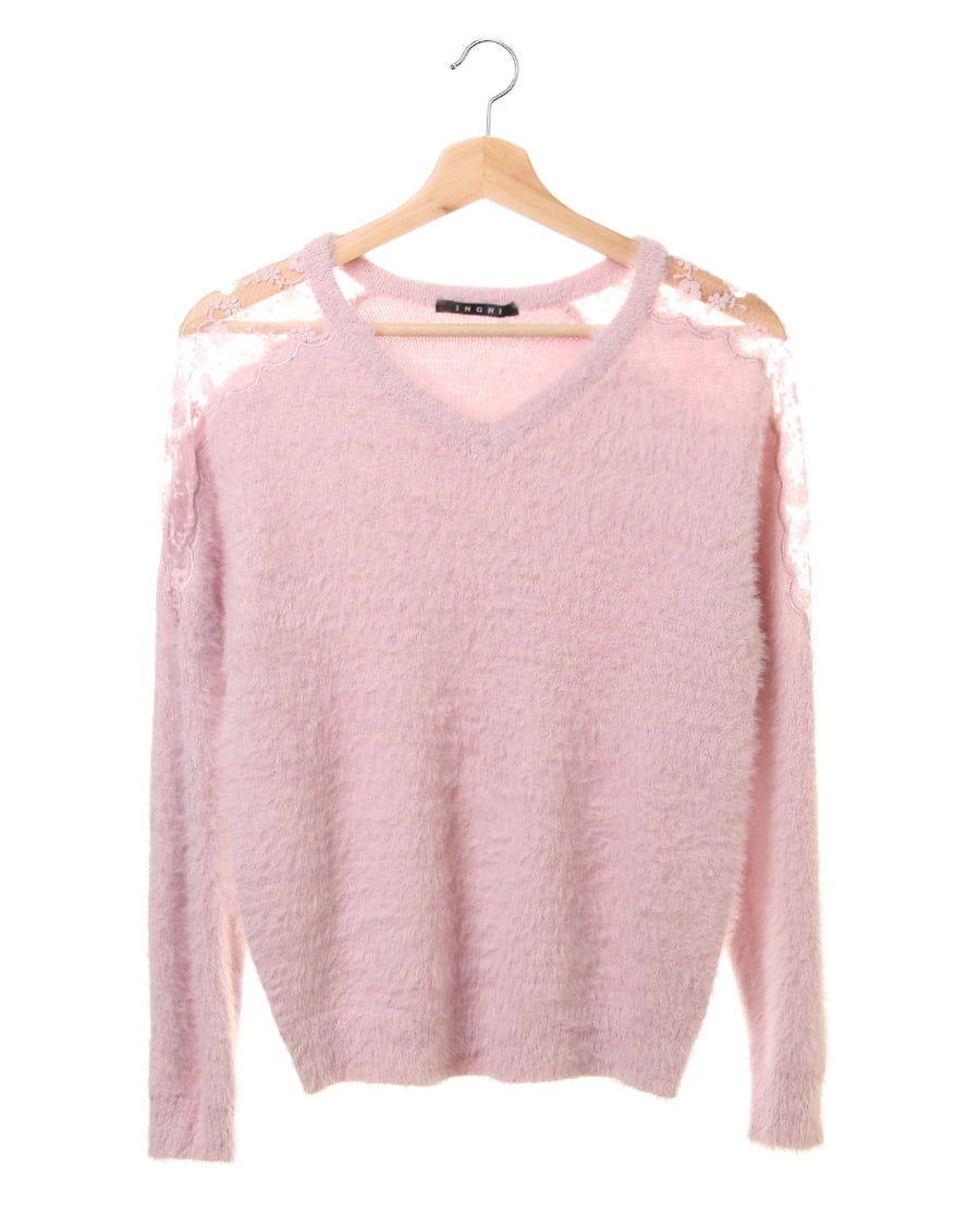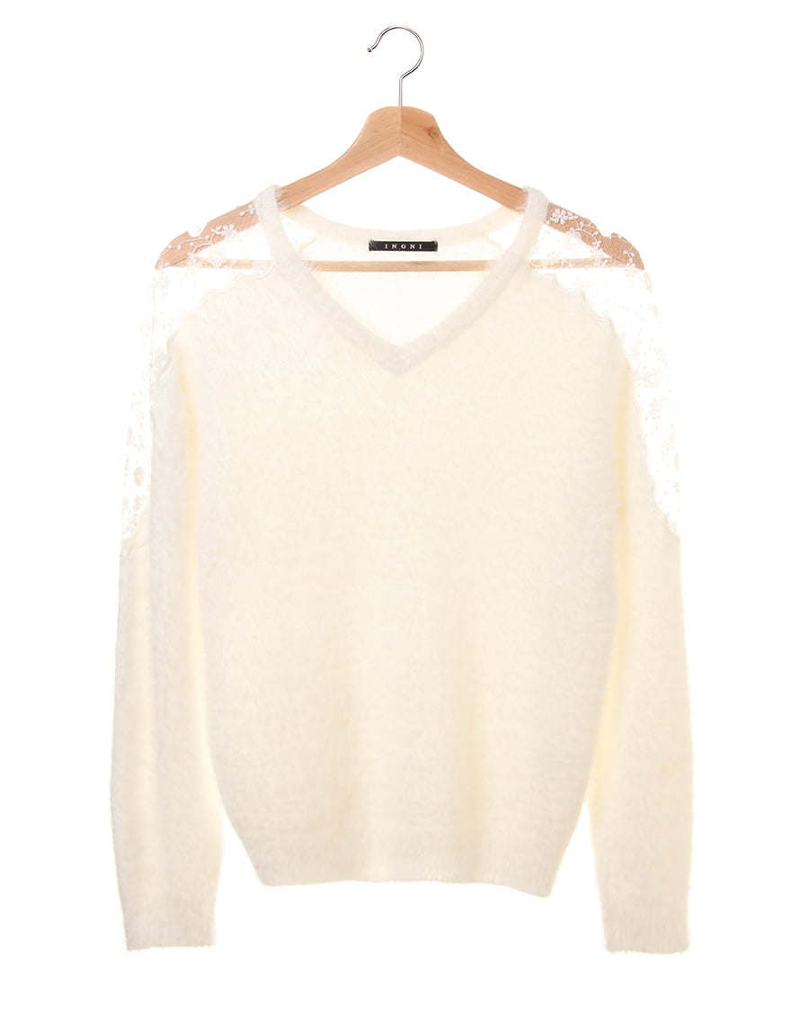 ふんわりとした毛足の長いフェザーヤーンがフェミニンなニットトップスは、ヨーク部分のシアーなレースがエレガント。ショルダー部分からアームまでのフラワーレースを、光沢のある刺しゅう糸でスカラップデザインに仕上げています。優しいペールカラーで、フェミニンに着こなせるのもポイント。すっきりと開いたVネックは、シャツインスタイルにもおすすめです。
