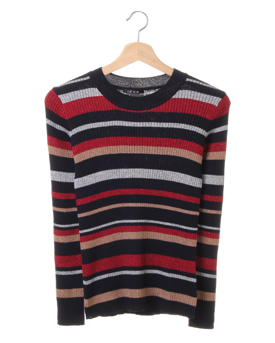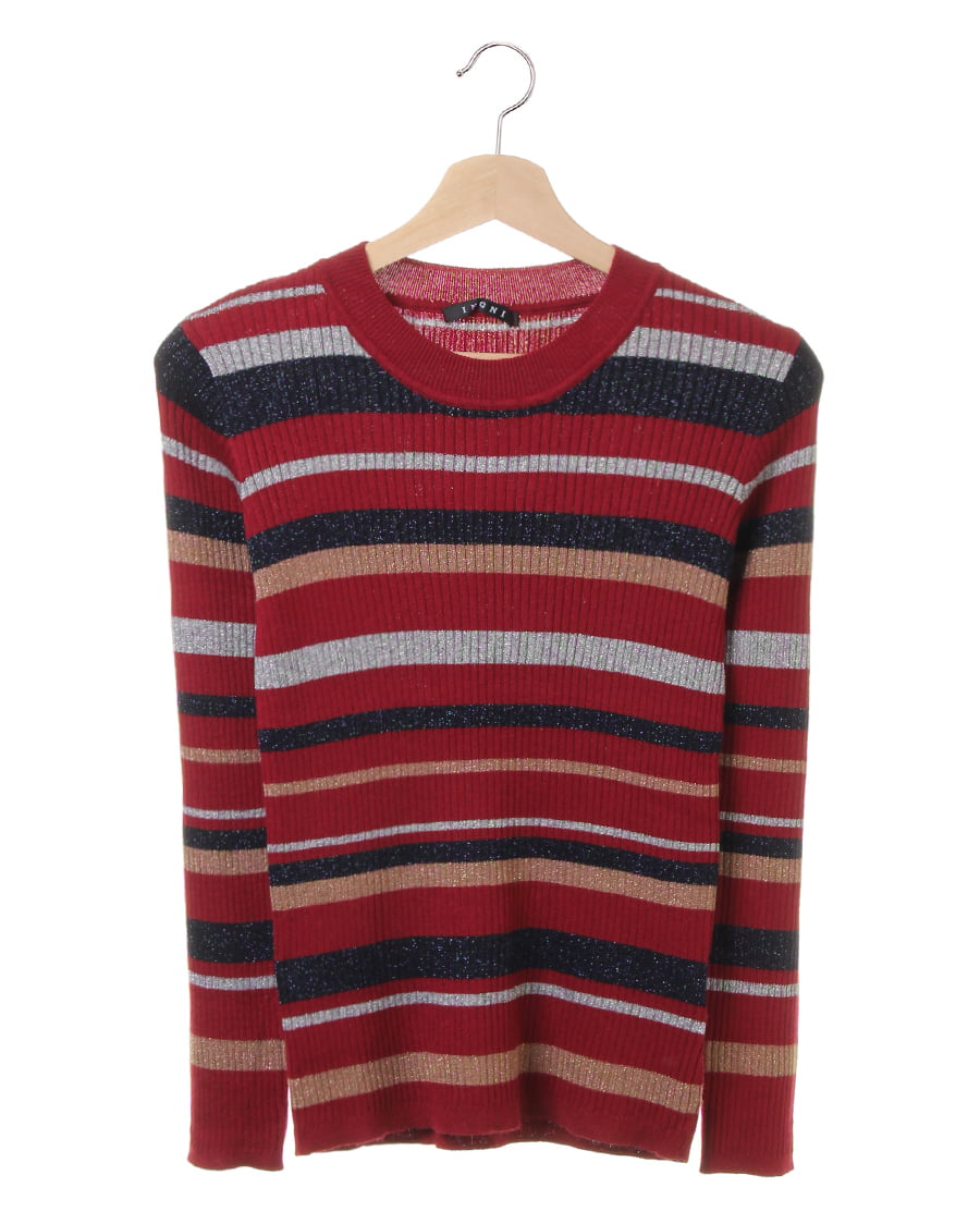 ラメの入った糸をマルチボーダーデザインに落とし込んだ今年らしいデザインのニット。コンパクトなサイズ感でボディラインにきれいに沿う女性らしいアイテム。伸びのいい素材は、着脱も着心地も抜群です。カラフルな配色が、コーデのアクセントになるおススメアイテムです。程よい厚みで、アウターのインナーとしてももたつかず重宝します。