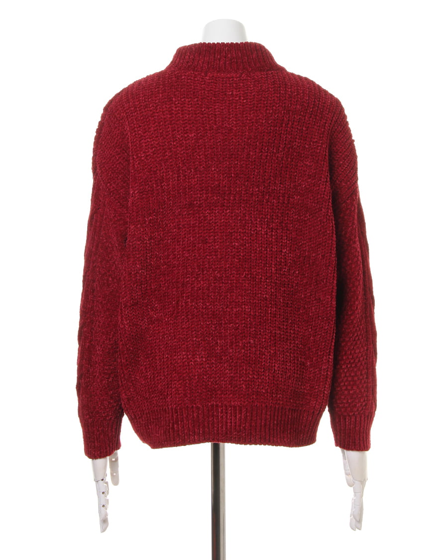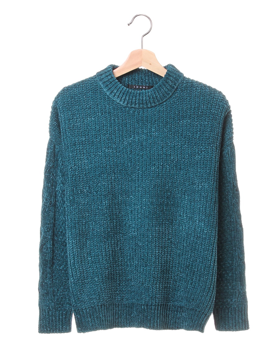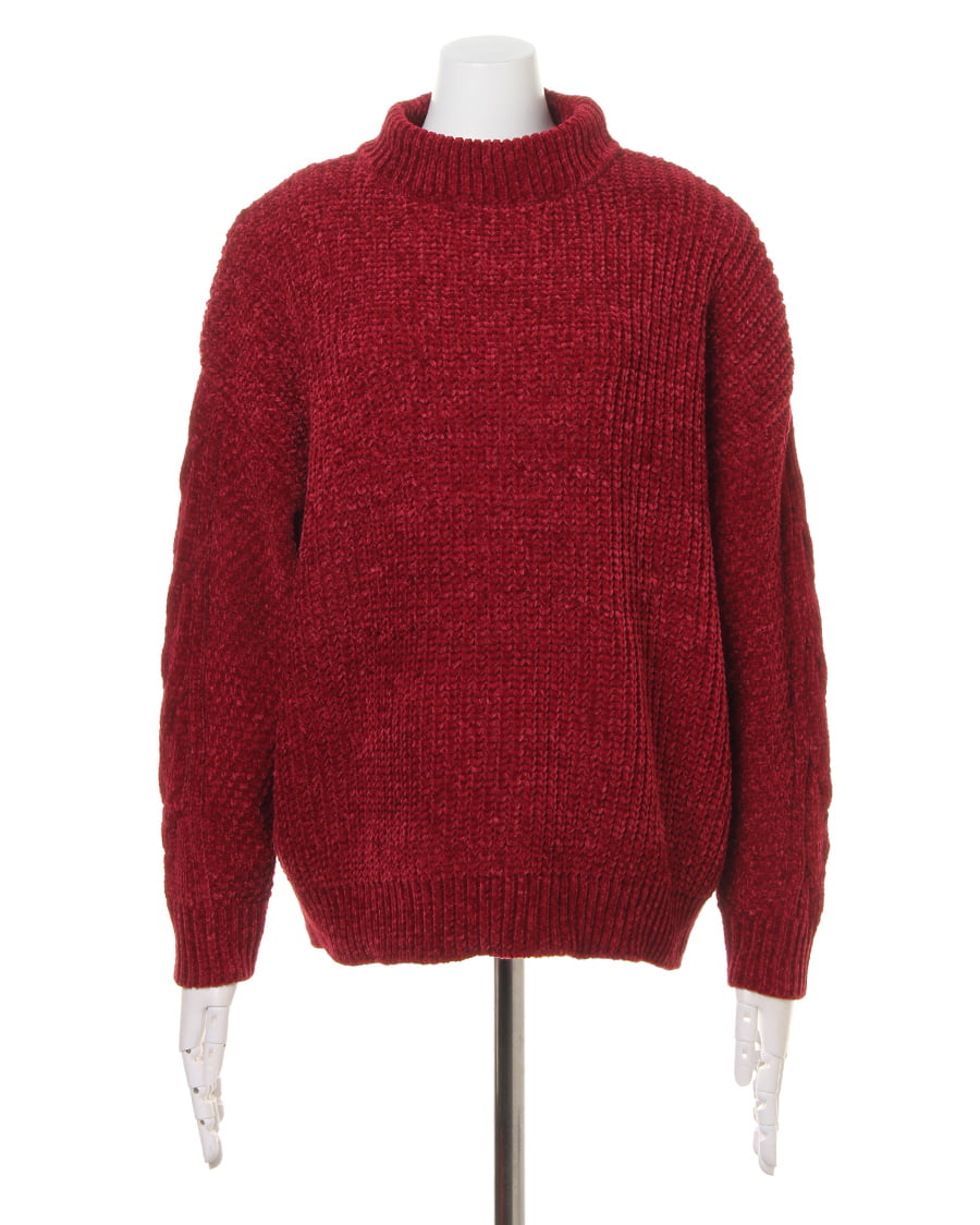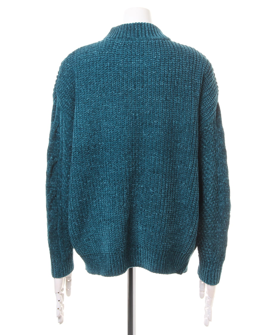 光の当たり方で輝く、ブライトモールで仕立てたニット。素材の風合いを生かしざっくり編まれたニットは、袖のケーブル編みがアクセント。ワンカラーで編み上げているので合わせやすく、スタイリングの幅が広がりデイリー使いに重宝します。ほんのり詰まったネックは、ボリュームのあるボトムスとも好バランスを叶えます。