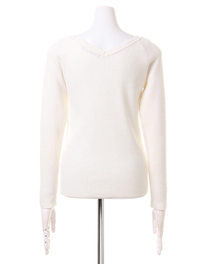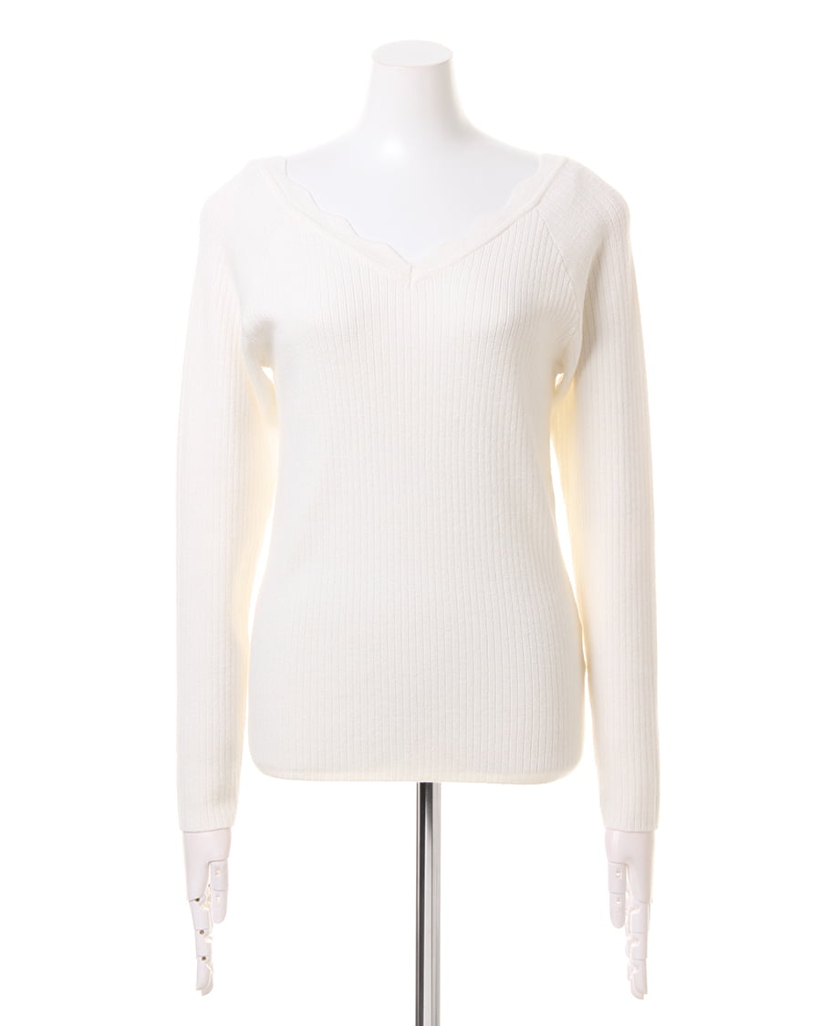 襟ぐりの前後にスカラップカットを採用し、バックスタイルにもこだわったニット。シンプルなニットをオシャレに彩るスカラップは、大きすぎないカットが大人っぽい雰囲気。すっきり開いたデコルテで、甘さをおさえた表情がコーディネイトのポイントに◎。伸縮性の高い生地で、着心地も抜群。単色で仕上げられているので、デイリー使いに重宝します。レイヤードスタイルにもオススメ。
