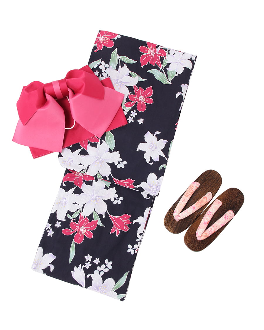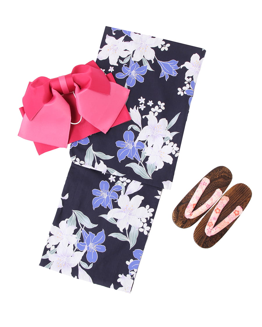 凛と咲く大ぶりな百合柄がエレガントな大人の浴衣スタイルを提案するセットアイテム。鮮やかな色使いが上品で華やかな印象をあおります。さらさらと袖通しがいい素材で着心地も抜群。仕立済みの浴衣やセットが簡単な作り帯で着付けが楽チンなのも魅力的です。深い色のベース生地にビビットカラーを採用した帯がメリハリのあるスタイルを叶えます。(下駄)