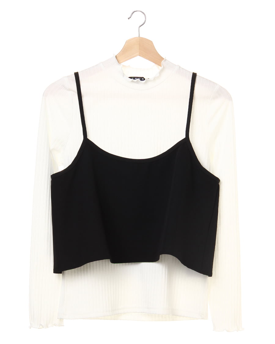 さらっとした質感のキャミソールとリブハイネックのトップスがセットになった商品。セットで着るだけで旬のスタイルが完成。短めに設定されたキャミソールは人気のボリュームボトムスとも相性抜群。上に視線を集めることでスタイルアップ効果も期待出来ます。ストラップで長さが調整可能なのも魅力的◎。伸縮性の高いリブトップスは、ボディラインにきれいに沿い女性らしいシルエットを演出。肌馴染みがよく着心地も抜群です。袖と首元にあしらったフリルがシンプルながら表情のあるスタイルを演出します。それぞれ手持ちのアイテムと合わせればスタイリングの幅が広がる万能アイテム。アソートのようなカラー展開も嬉しいポイント。選ぶ柄によってサマ変わりする印象も楽しめます。