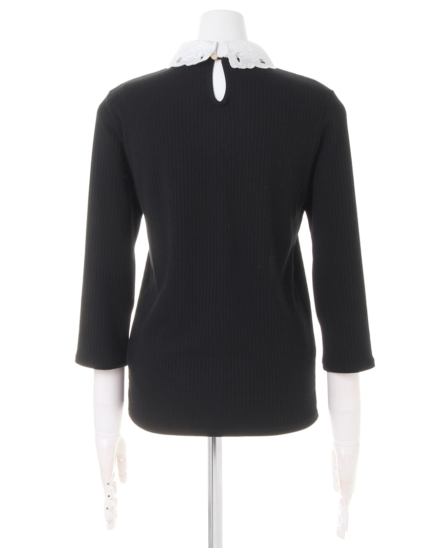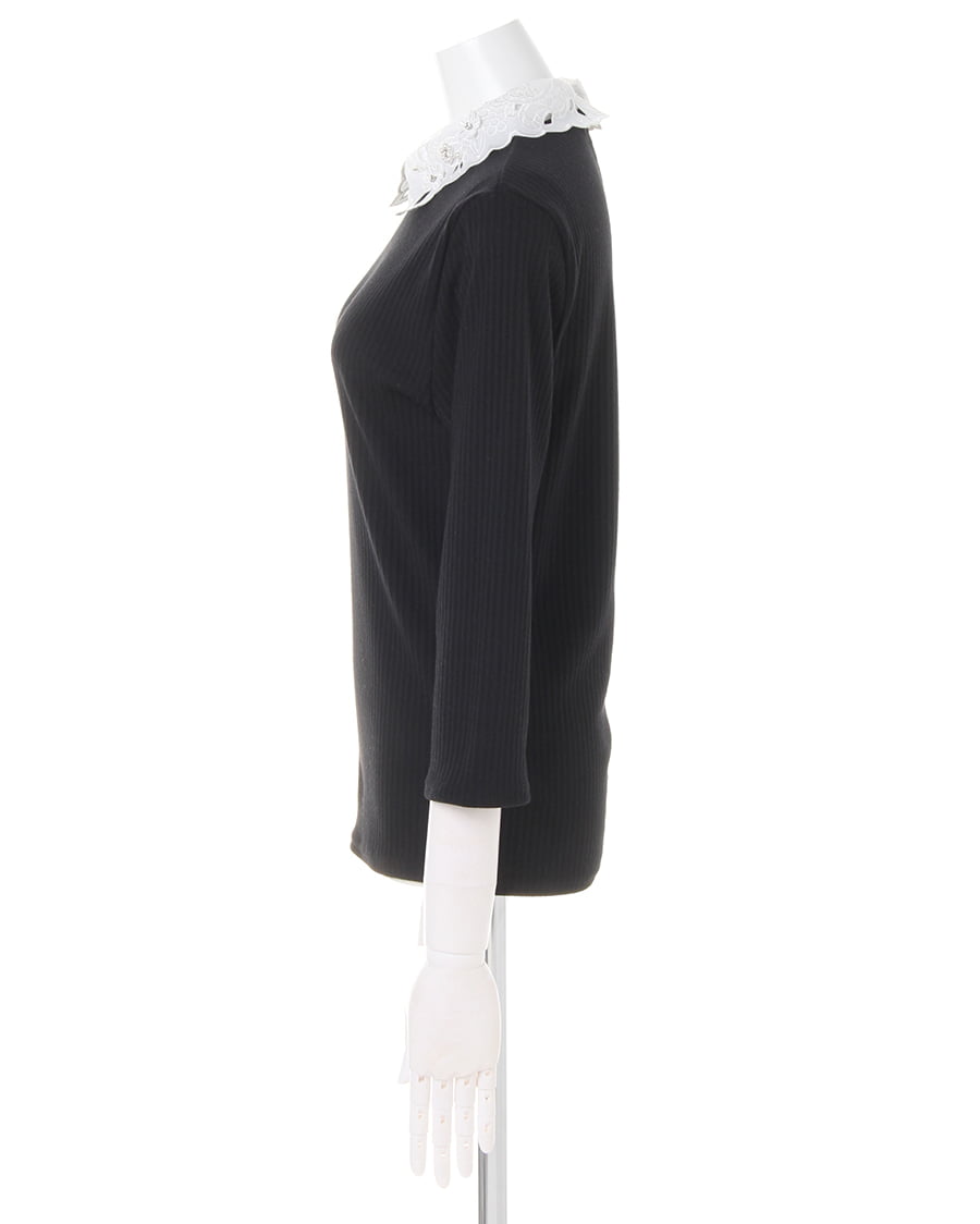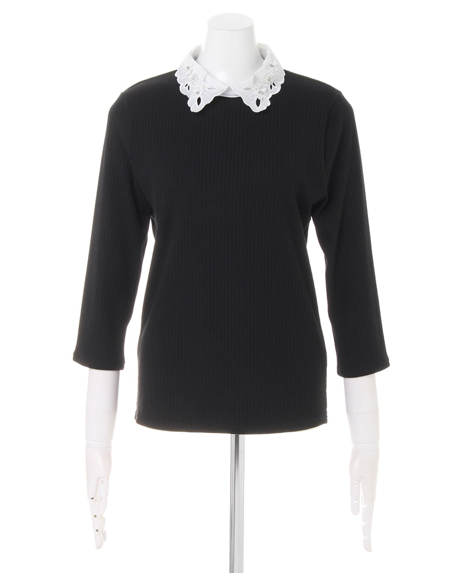 伸縮性抜群のリブカットソーに襟装飾レースをあしらってフェミニンに仕上げたトップス。細めのリブでボディに沿うデザインが上半身をすっきり見せてくれます。首元にスカラップデザインのシフォン素材をプラスした上品さが◎。立体フラワーとパールビジュー、ラインストーンでアクセいらずで顔周りを華やかに演出します。バックもドロップカットで抜かりなし。絶妙な袖丈がシーズンムードを高めます。