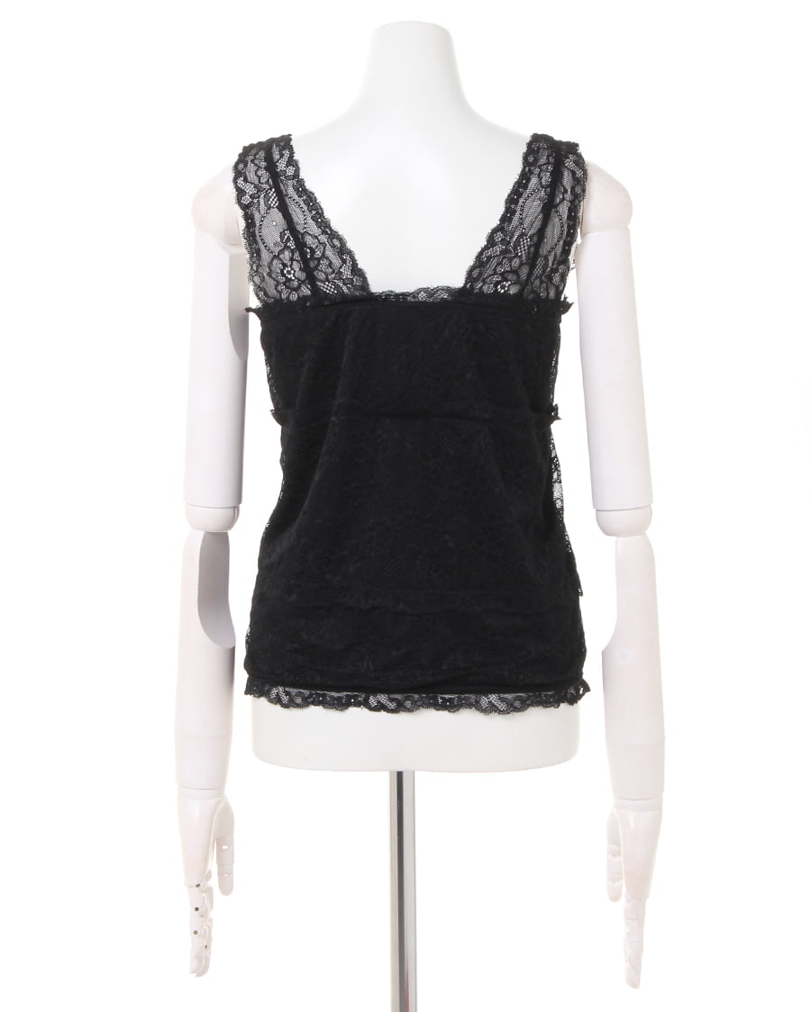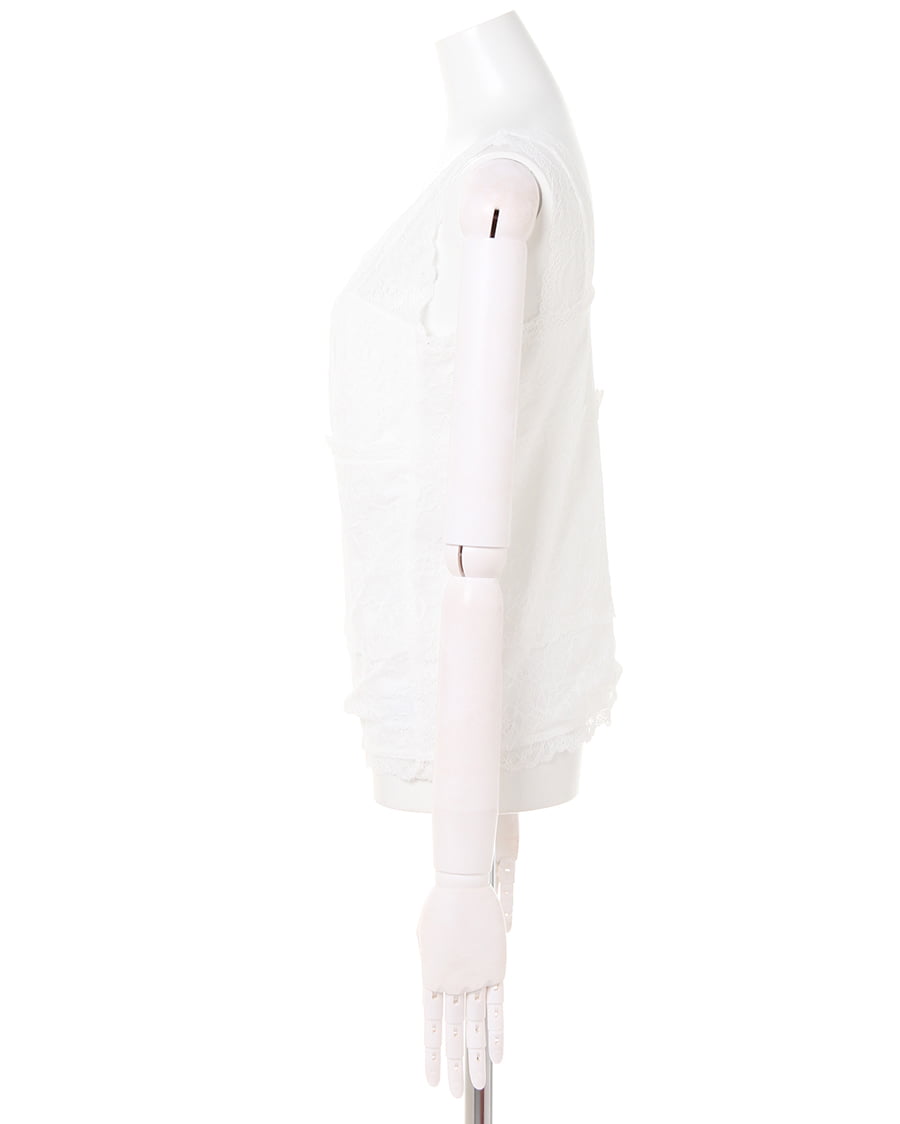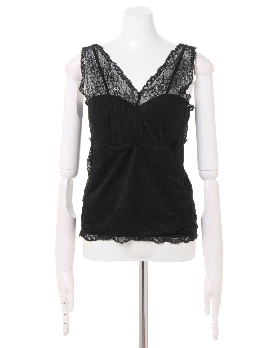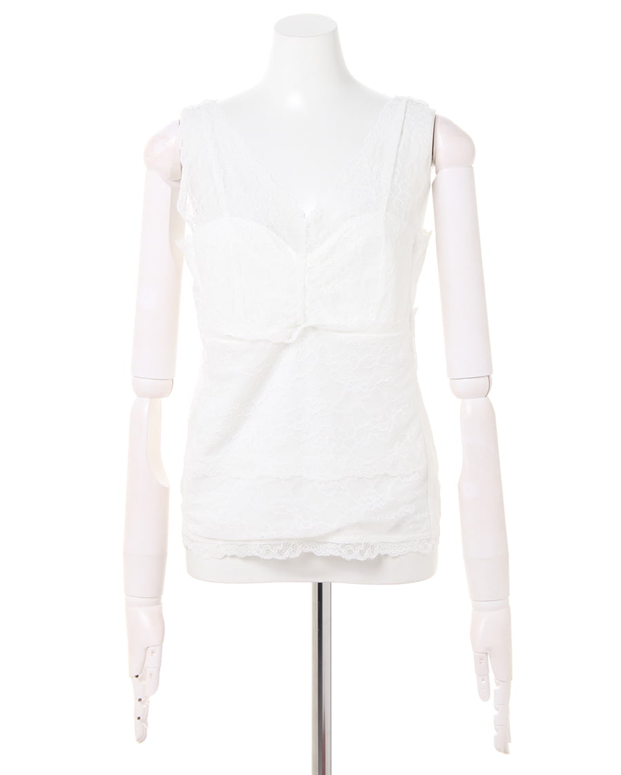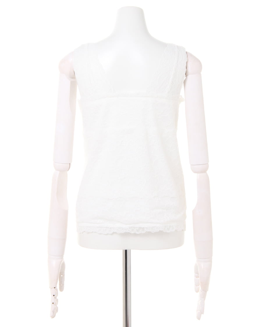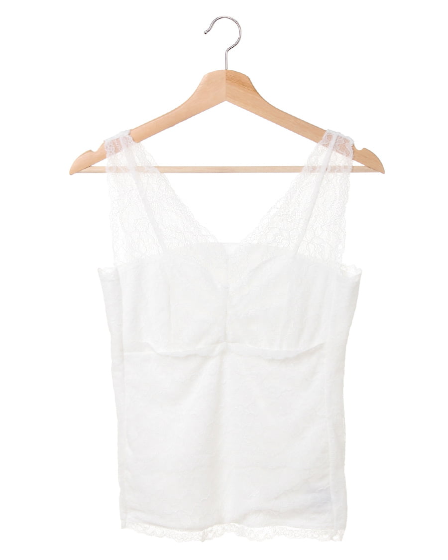 総レース使いが清楚な印象を漂わせる大人っぽいタンクトップ。繊細なレースがエレガントで華やかな1枚。深めに開いた首元が女性らしい雰囲気をあおります。身頃部分に柔らかくて肌馴染みのいい生地を張り付けているので、インナーを気にせず着れるのも魅力的。1枚でトップスとして着るのはもちろん、カーディガンやライトアウターのインナーとしてもおすすめです。