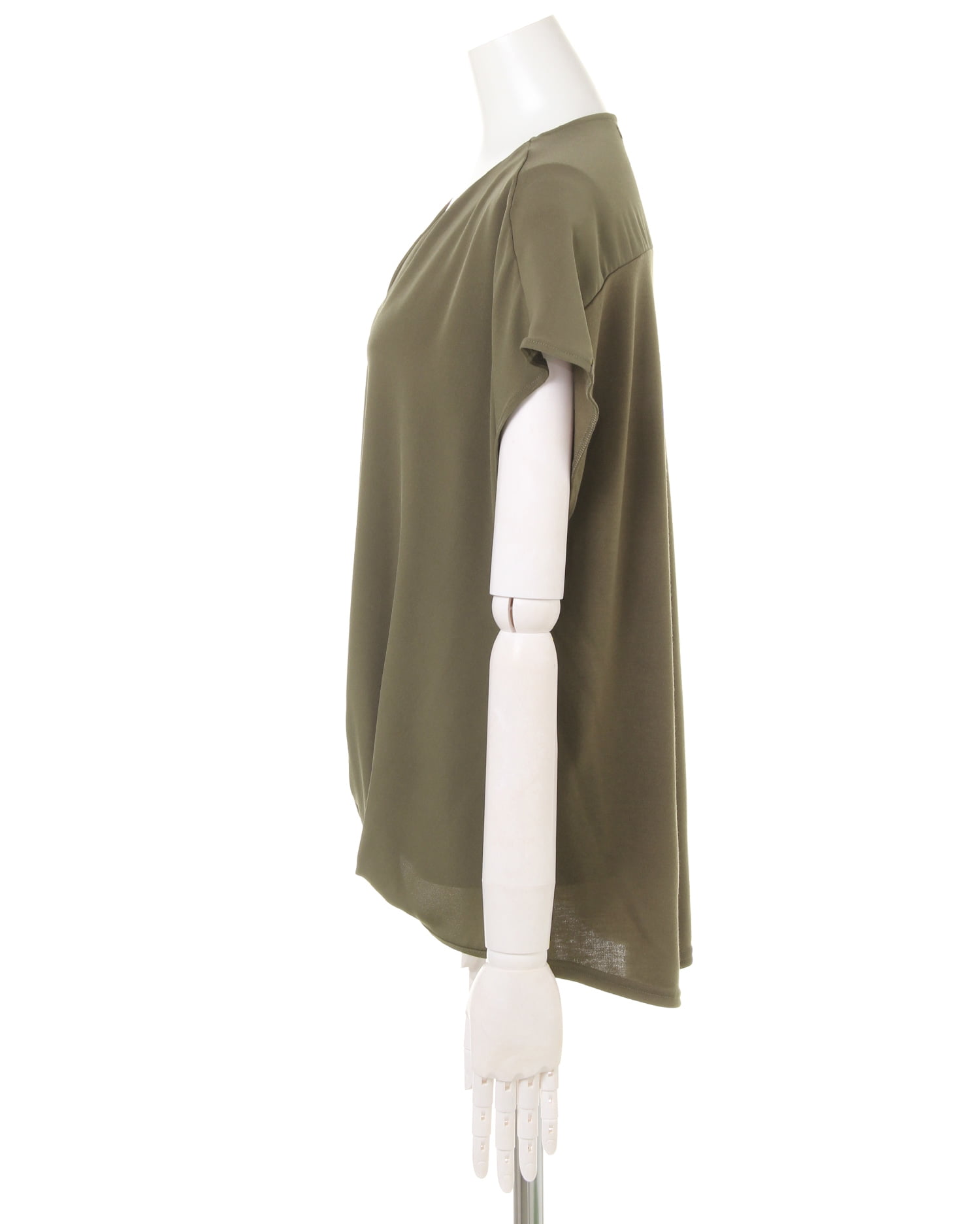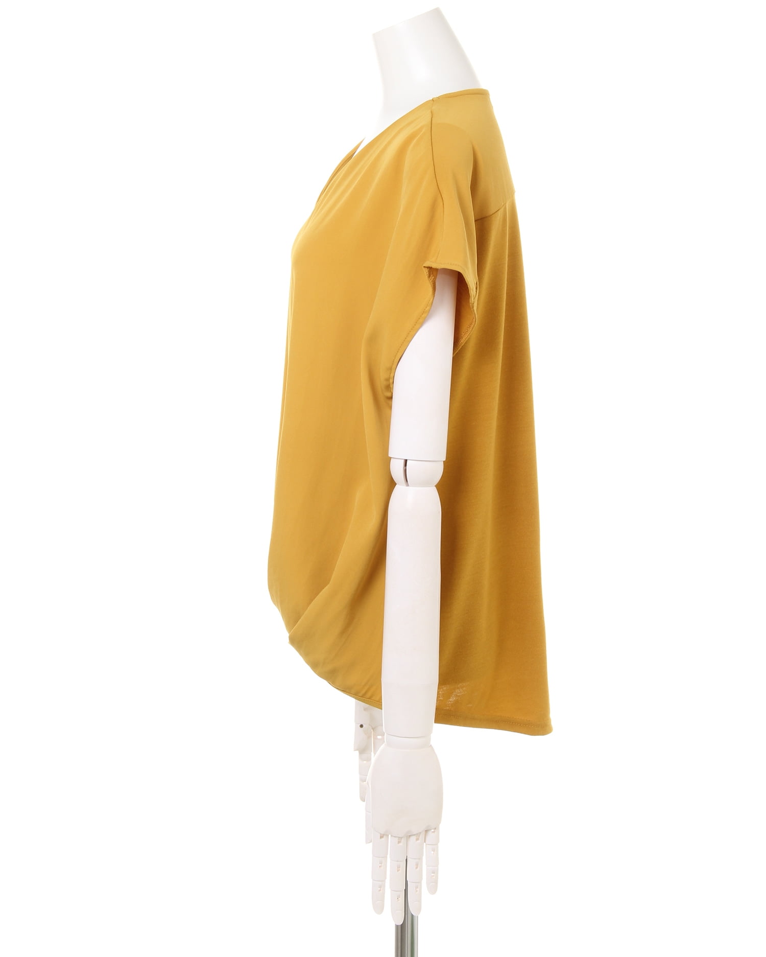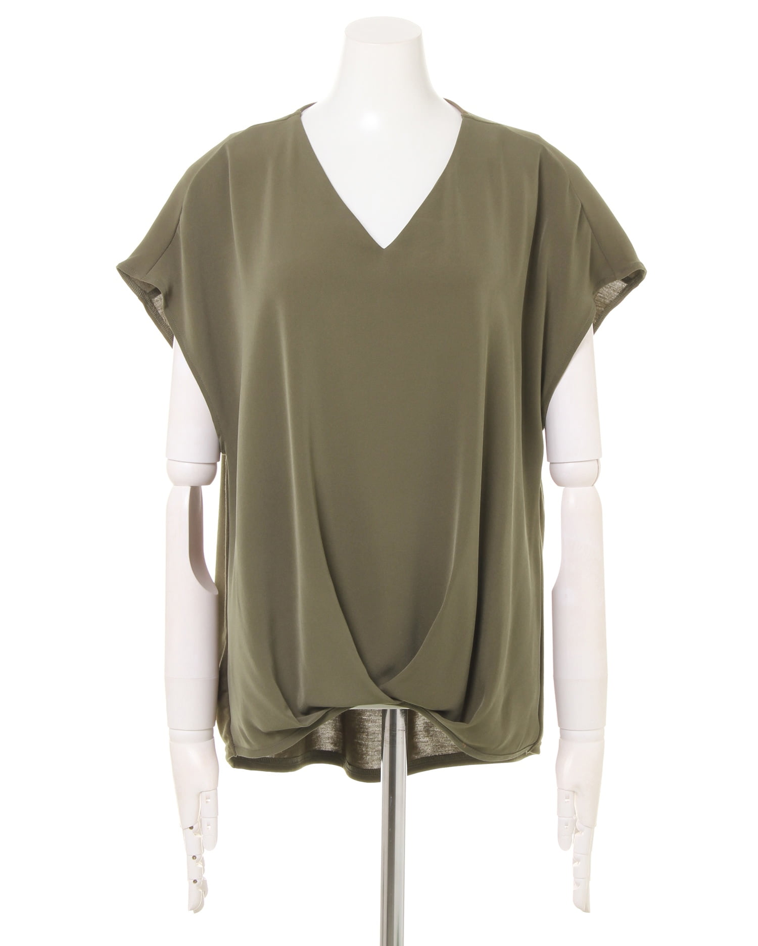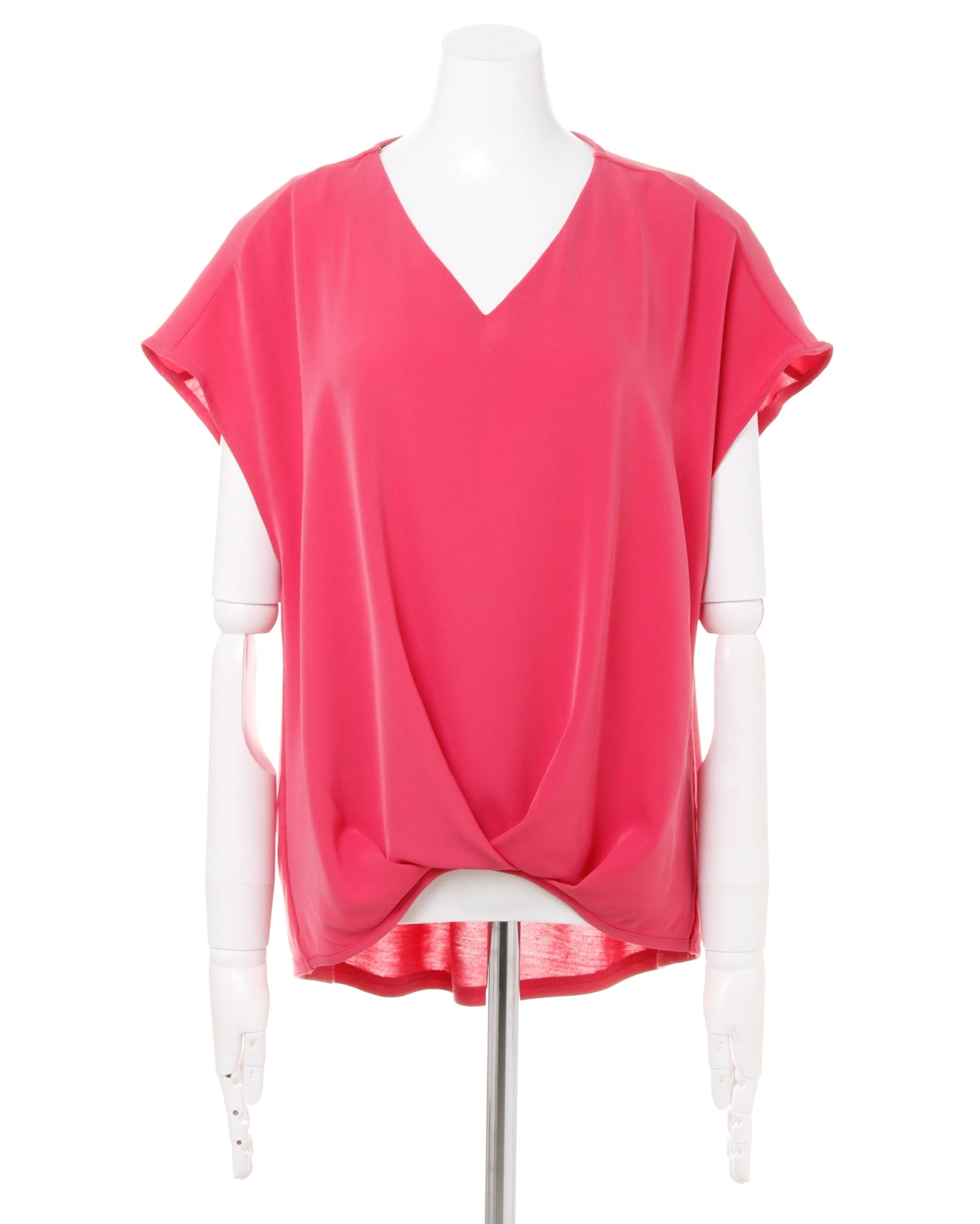 さっと着るだけでタックインスタイル風の着こなしが叶う、フロントのデザインがこなれ感漂うブラウソー。柔らかく肌触りのいいカットソー素材のブラウスはオンオフ問わず着回し力の高い万能アイテム。すっきり開いたVネックがデコルテをきれいに見せ、顔周りを明るく演出します。