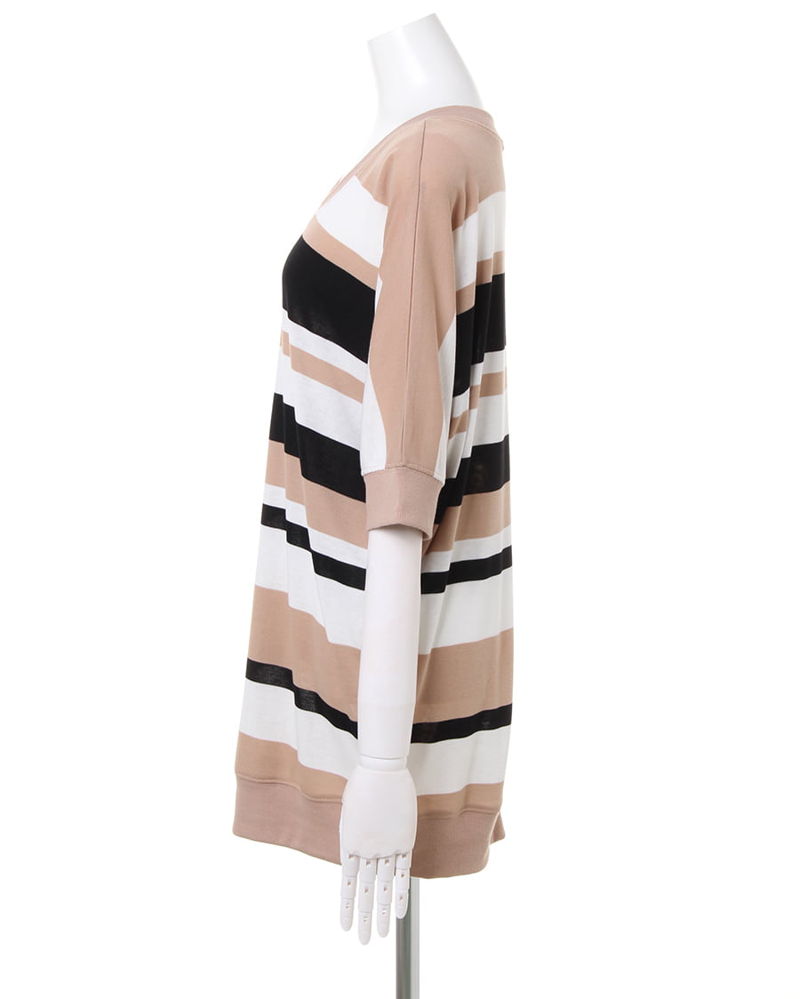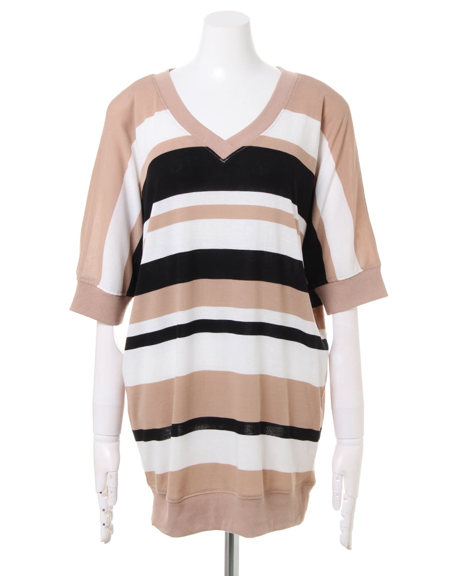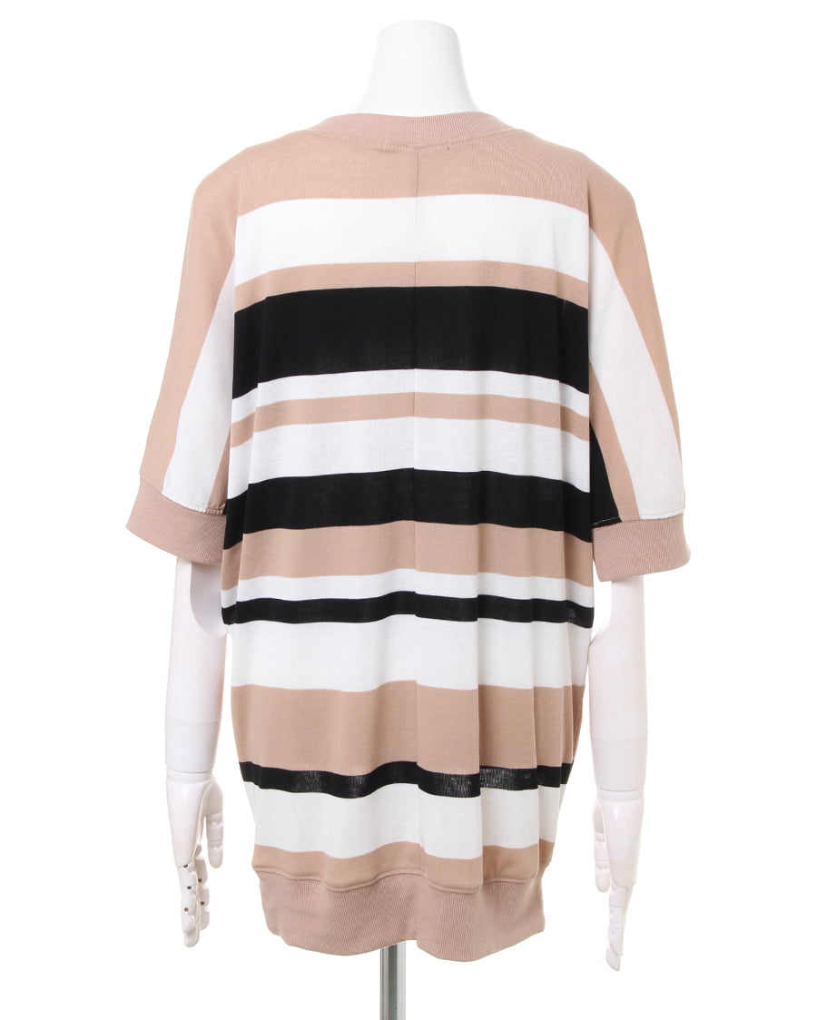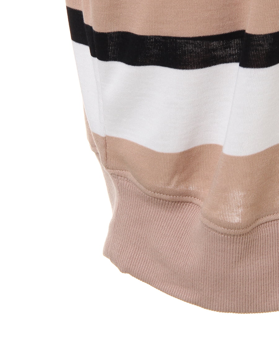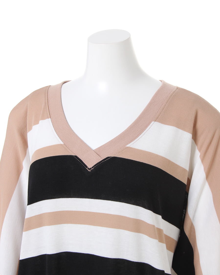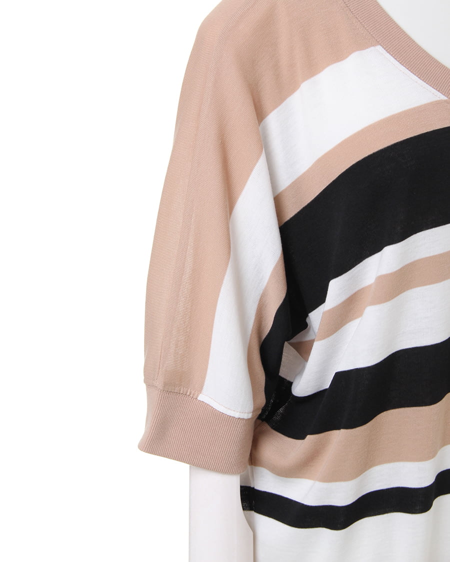 落ち感のある滑らかな生地で仕立てたゆったりシルエットのトップスです。全体にあしらったランダムボーダーが新鮮。カジュアル過ぎずに着こなせるのでオフィスシーンなどにも◎。薄手で涼しげなゆったりめの身頃がこれからの季節、デイリー使いに重宝します。かっちりめのパンツと合わせて大人っぽく着こなすのもおすすめです。