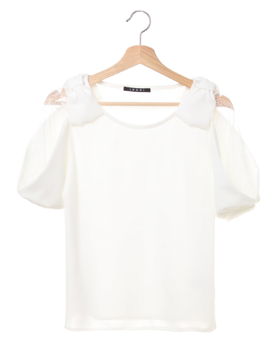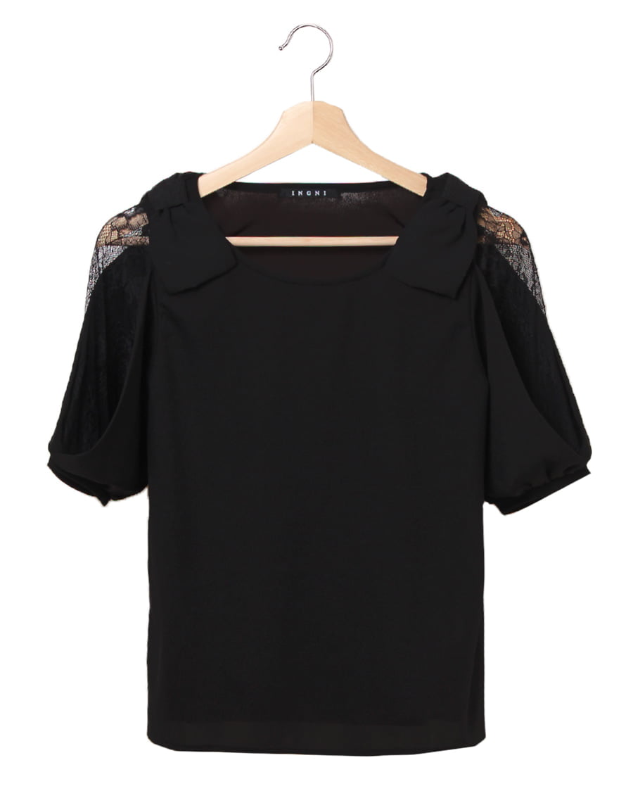 ふんわりしたスリーブと清楚な雰囲気のレースを組み合わせたレディなトップス。同系色のカラーを異素材で変化を付け、大人っぽいデザインに落とし込んでいます。肌馴染み良好で伸縮性の高い素材は、快適な着心地を実現。ショルダーには立体的なリボンをあしらっているので、アクセサリー要らずで顔周りを華やかに彩ります。袖部分のレースからほんのり透ける素肌がエレガント。オンオフ問わずに着まわせるのも嬉しいポイントです。