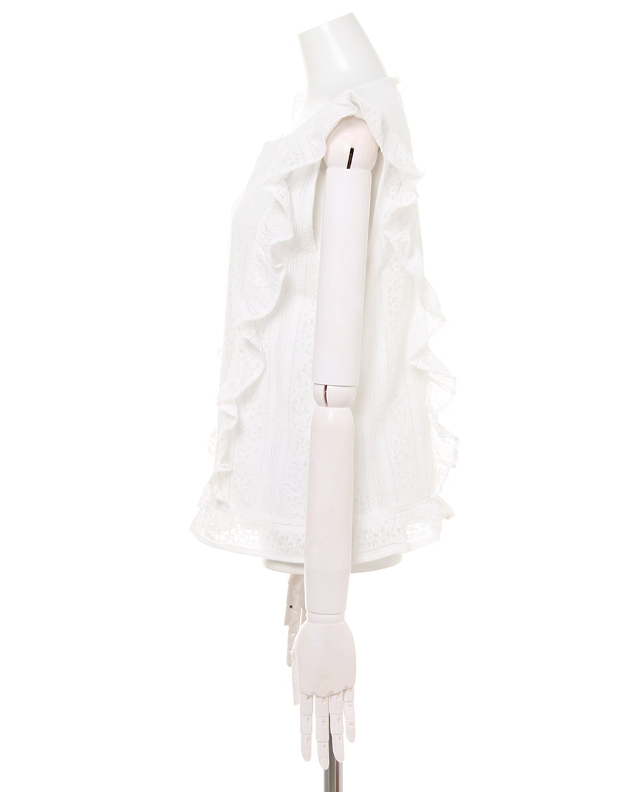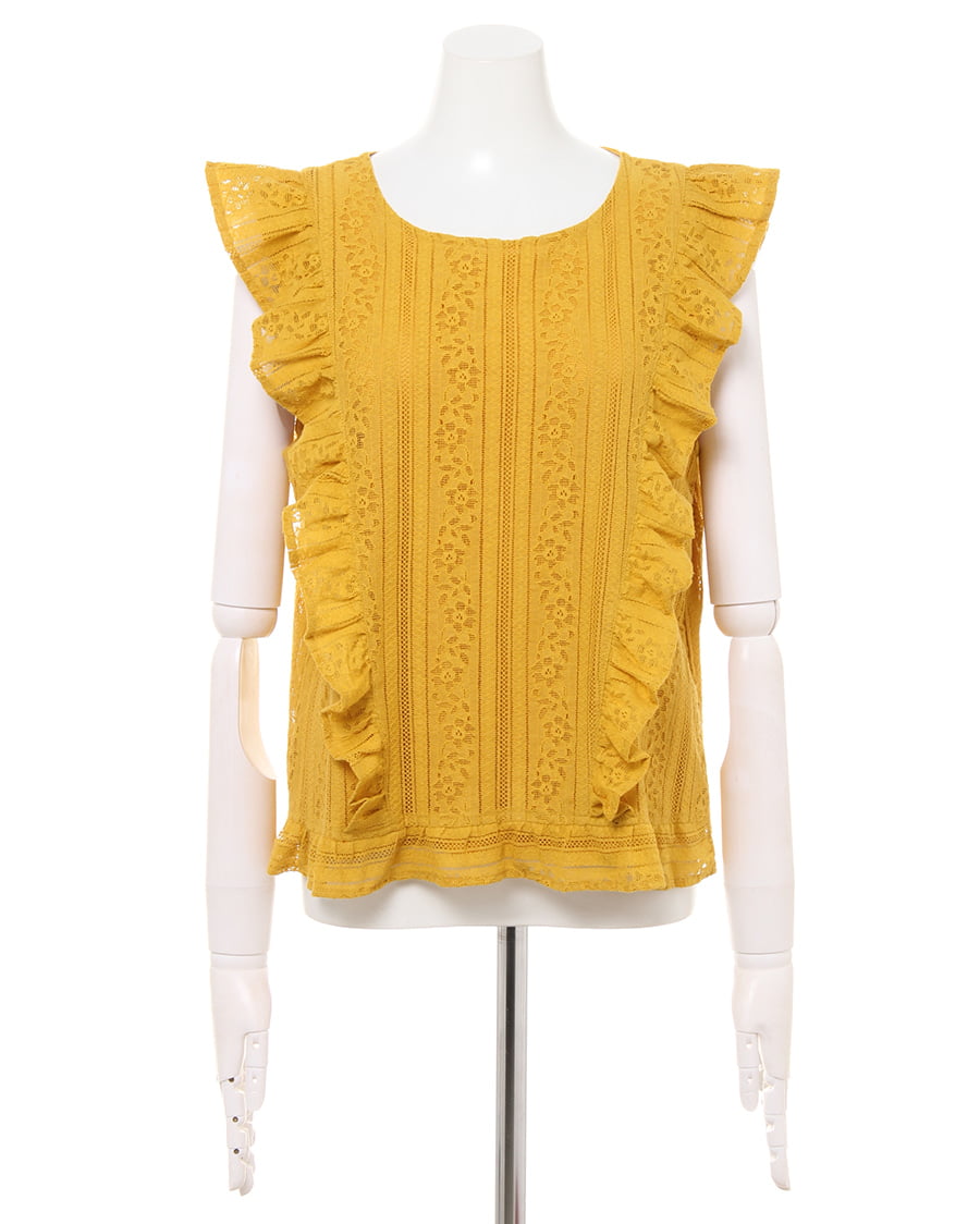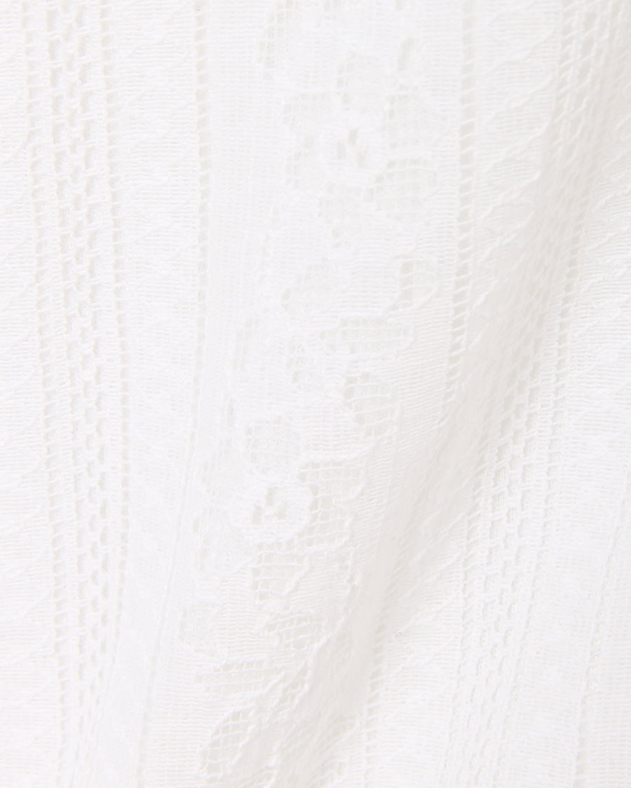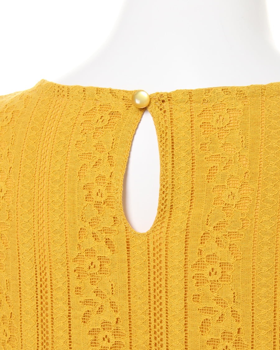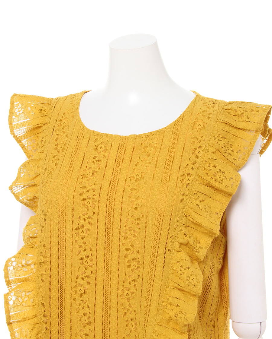 ふんわり柔らかい繊細なレース生地に、存在感のある贅沢なフリル使いがアイキャッチになる大人可愛いトップス。すっきりと開いた緩やかなネックラインが、優しい印象を与えます。ストライプレースと程よくゆとりのあるシルエットでフェミニンな雰囲気を演出。ボディラインを拾わず、無理なく体型カバー効果を高めます。伸縮性のある滑らかな裏地付きなので、1枚で着れるのも嬉しいポイント。後ろのティアドロップカットも抜かりないデザインです。