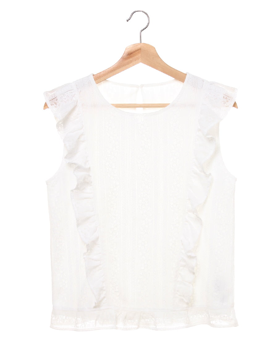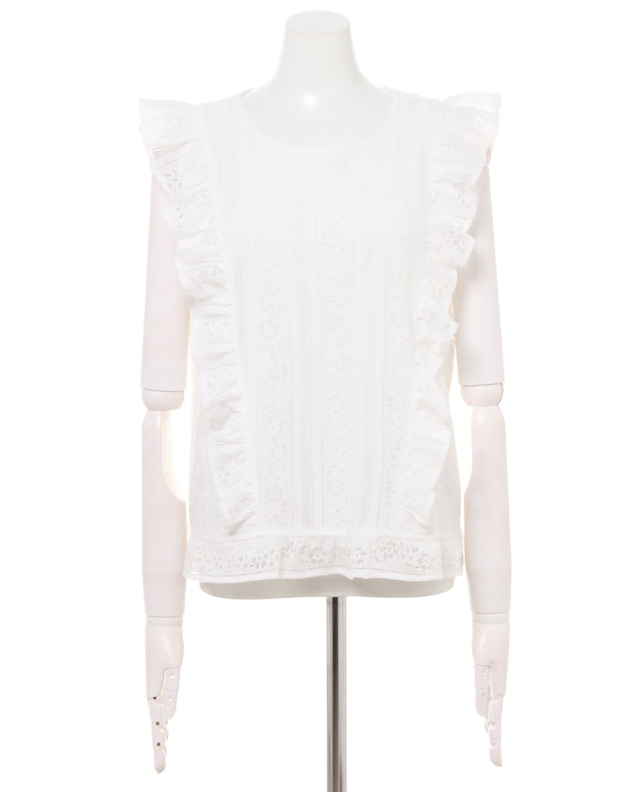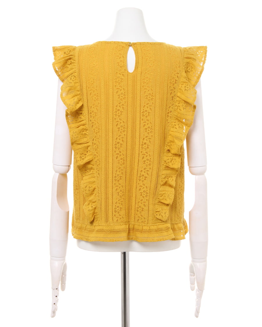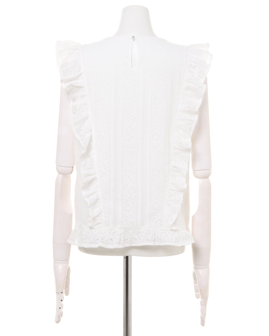 ふんわり柔らかい繊細なレース生地に、存在感のある贅沢なフリル使いがアイキャッチになる大人可愛いトップス。すっきりと開いた緩やかなネックラインが、優しい印象を与えます。ストライプレースと程よくゆとりのあるシルエットでフェミニンな雰囲気を演出。ボディラインを拾わず、無理なく体型カバー効果を高めます。伸縮性のある滑らかな裏地付きなので、1枚で着れるのも嬉しいポイント。後ろのティアドロップカットも抜かりないデザインです。