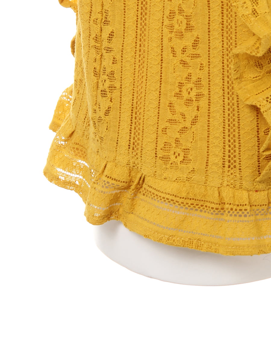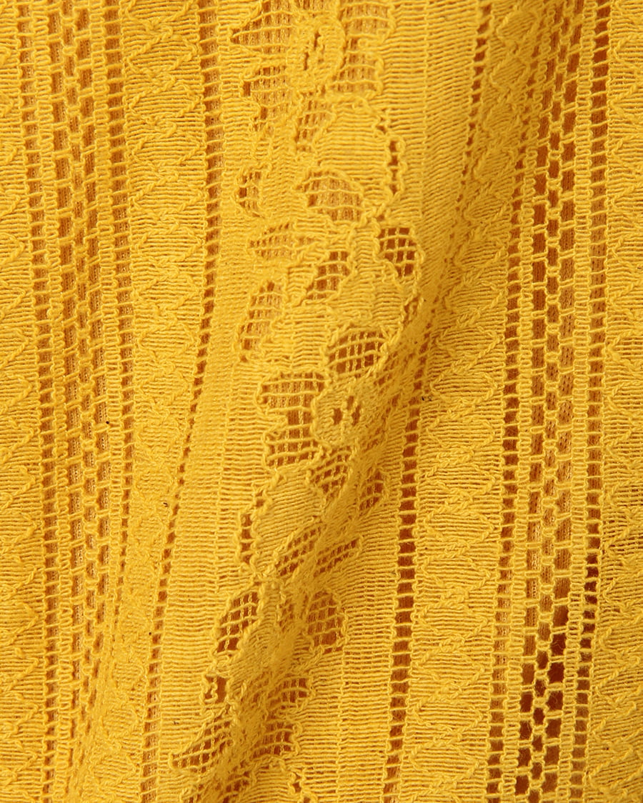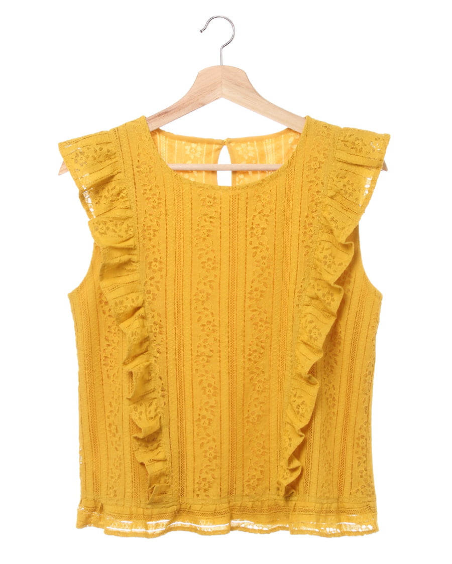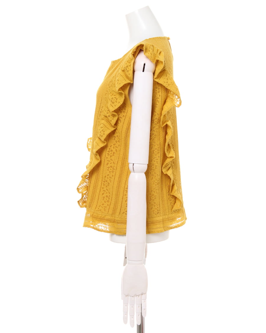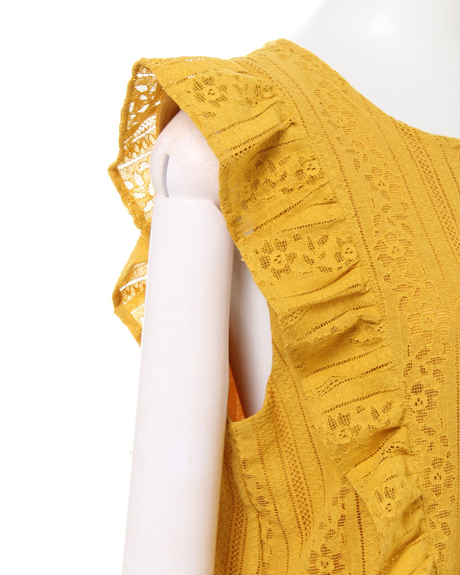 ふんわり柔らかい繊細なレース生地に、存在感のある贅沢なフリル使いがアイキャッチになる大人可愛いトップス。すっきりと開いた緩やかなネックラインが、優しい印象を与えます。ストライプレースと程よくゆとりのあるシルエットでフェミニンな雰囲気を演出。ボディラインを拾わず、無理なく体型カバー効果を高めます。伸縮性のある滑らかな裏地付きなので、1枚で着れるのも嬉しいポイント。後ろのティアドロップカットも抜かりないデザインです。