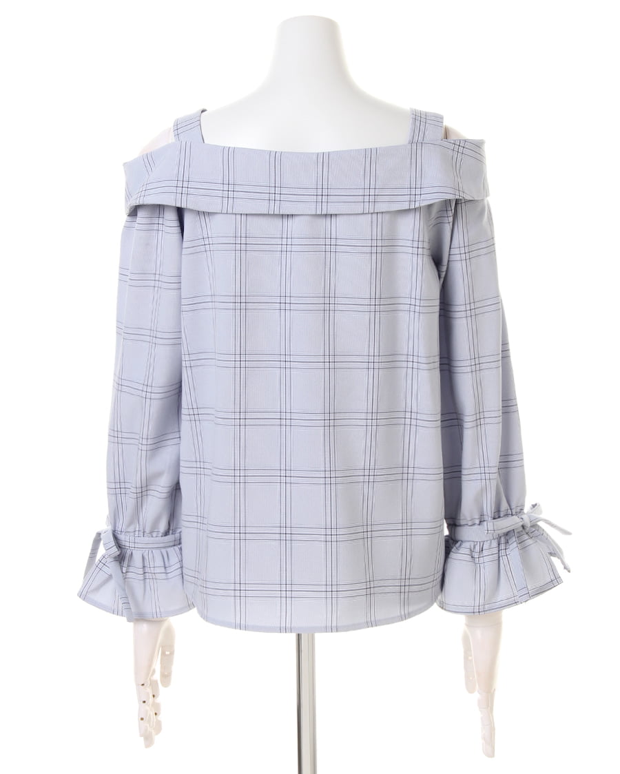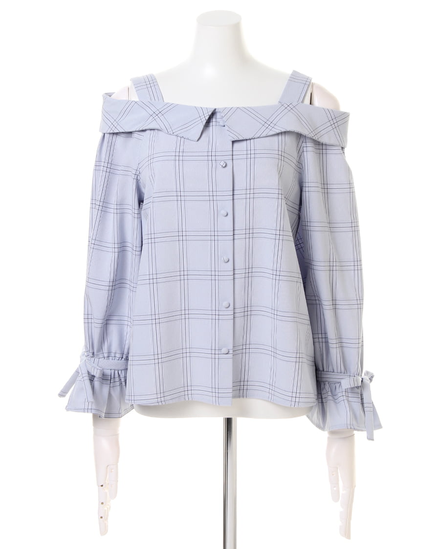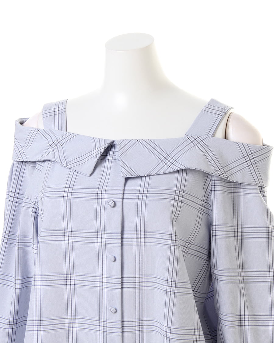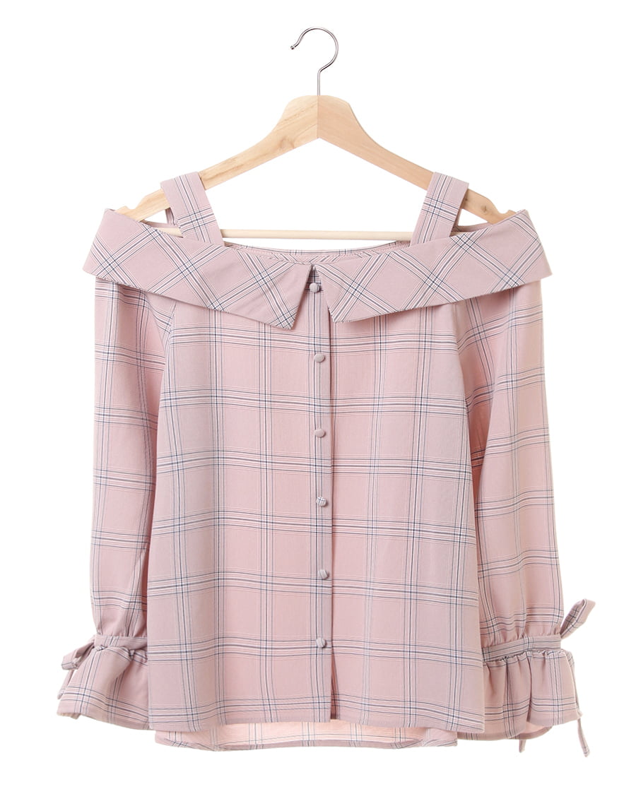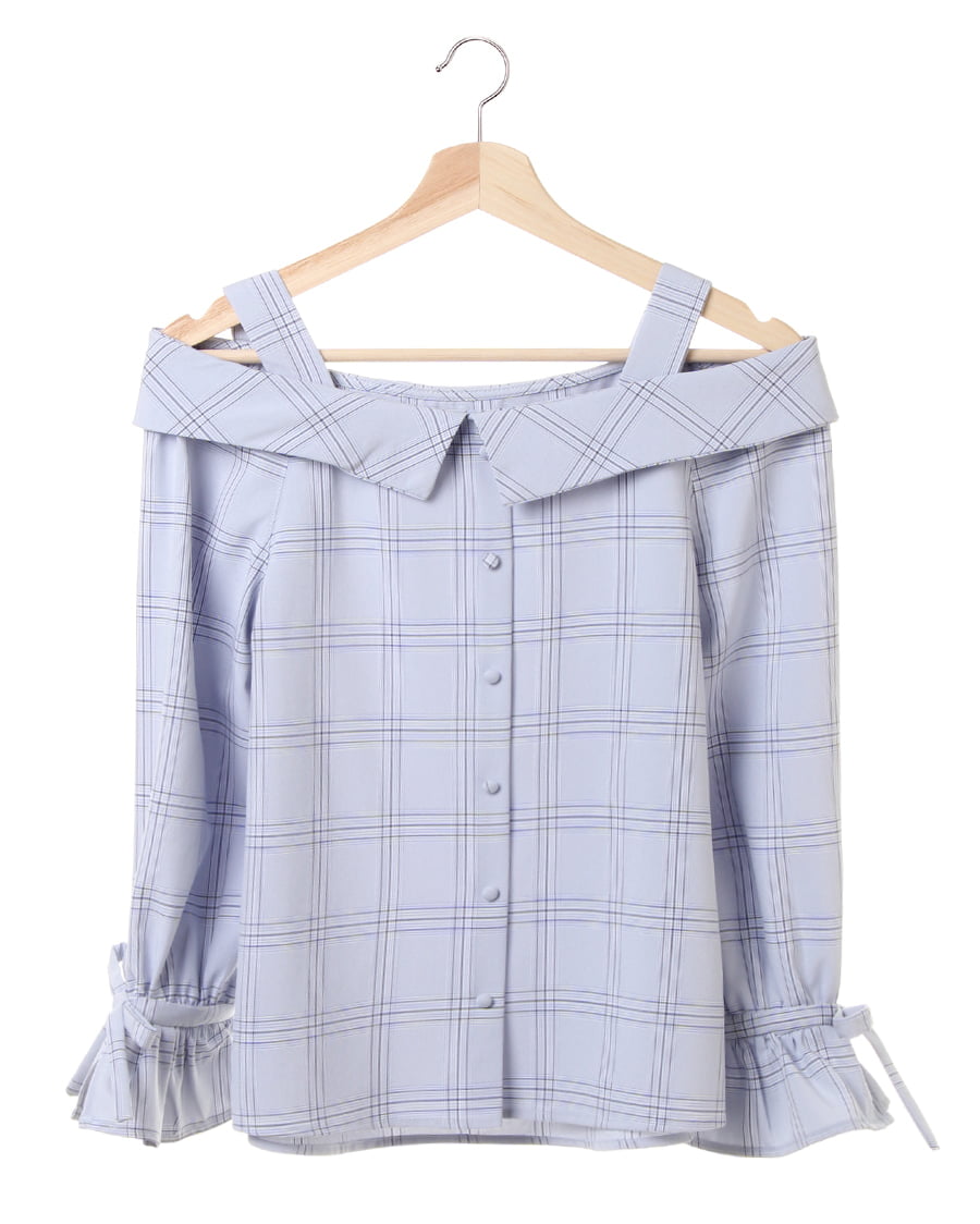 落ち着いたカラーのチェック柄のブラウスはフロントのくるみボタンとの組み合わせでクラシカルに。今年らしいオフショルダーデザインでデコルテをキレイに演出してくれます。袖口のフリルリボンがフェミニンな雰囲気。薄手の伸縮性ある生地が季節感をあおる1枚です。裾部分にスリットを入れているですっきりとしたシルエットで着こなせます。