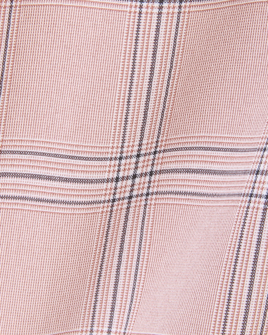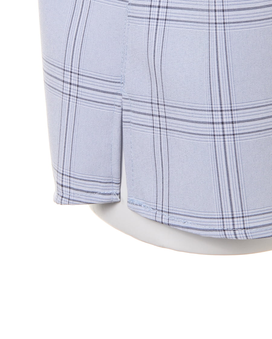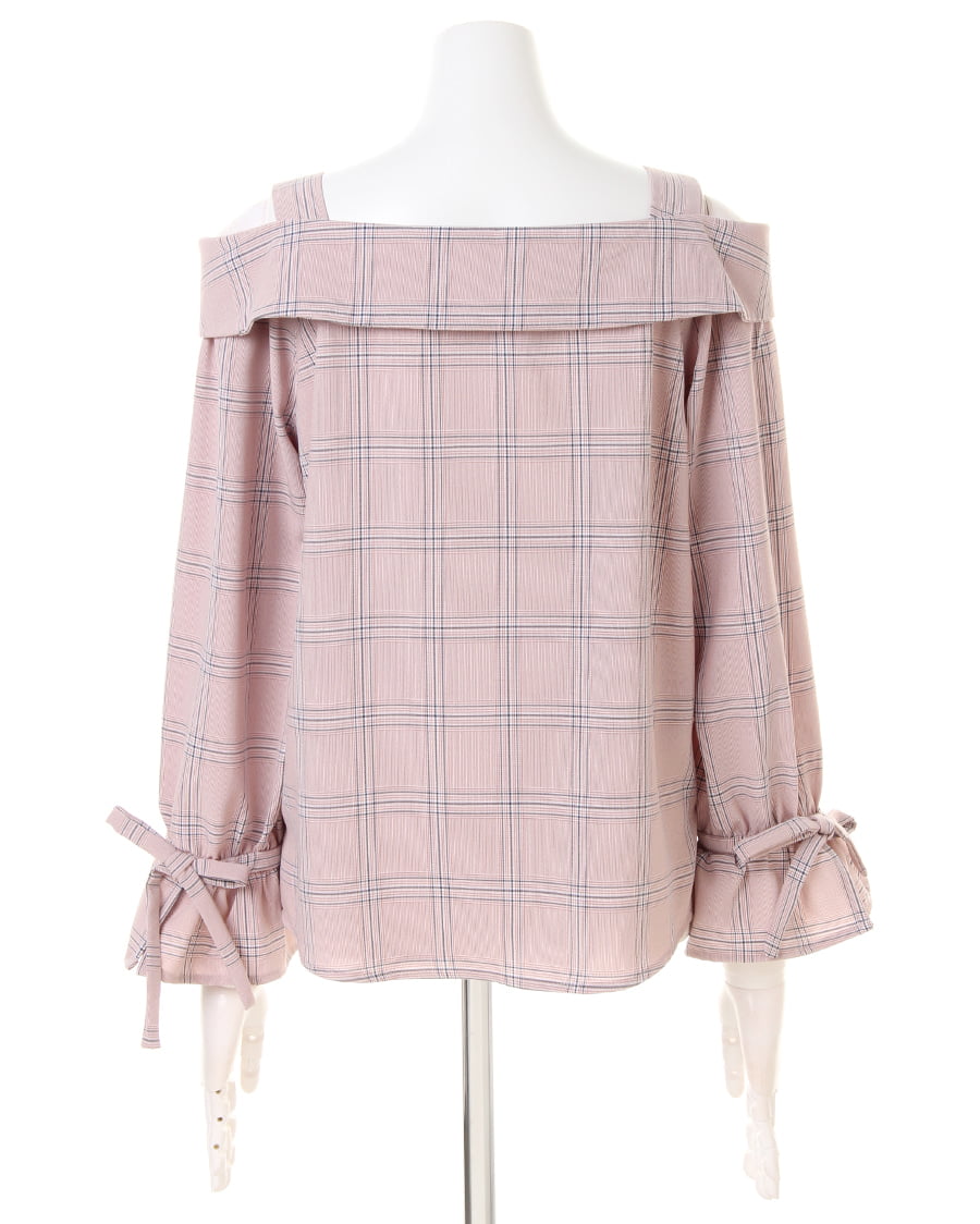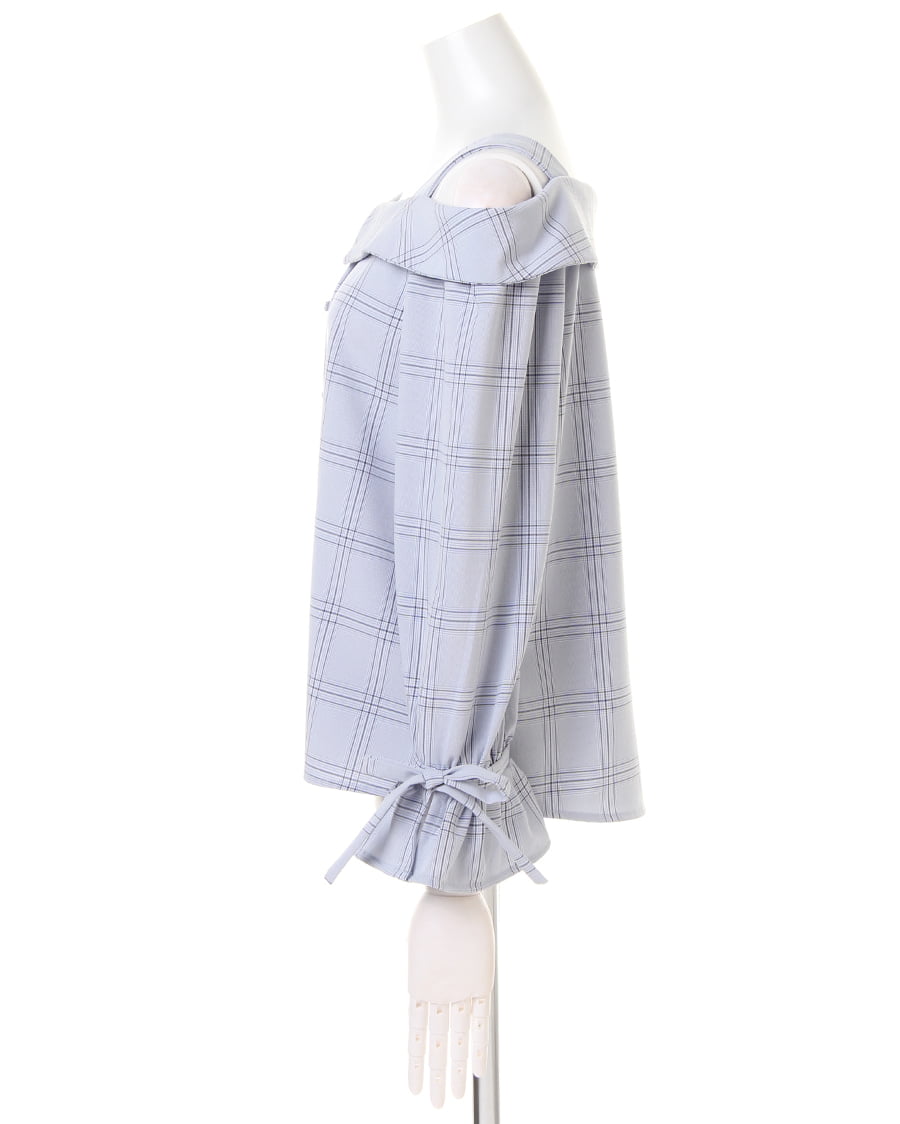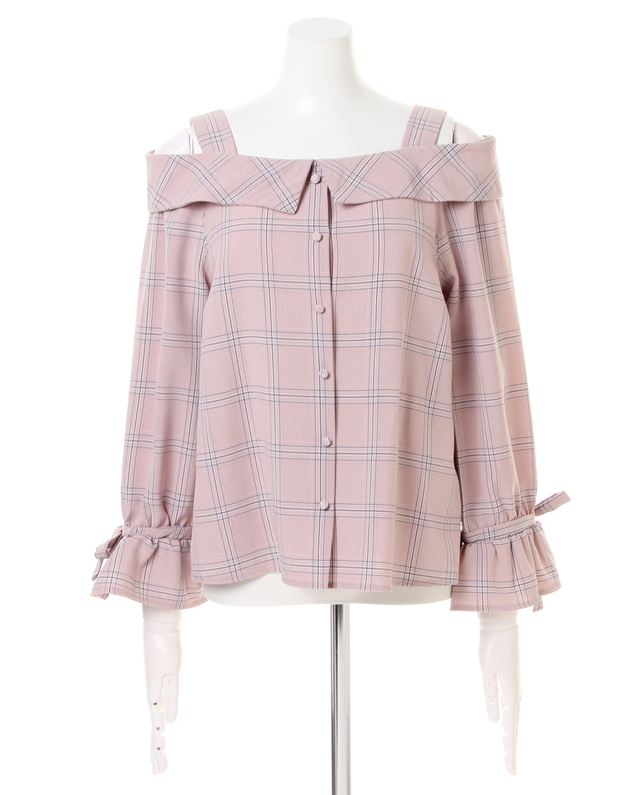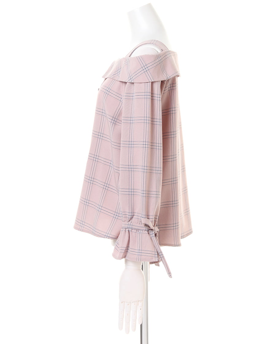 落ち着いたカラーのチェック柄のブラウスはフロントのくるみボタンとの組み合わせでクラシカルに。今年らしいオフショルダーデザインでデコルテをキレイに演出してくれます。袖口のフリルリボンがフェミニンな雰囲気。薄手の伸縮性ある生地が季節感をあおる1枚です。裾部分にスリットを入れているですっきりとしたシルエットで着こなせます。