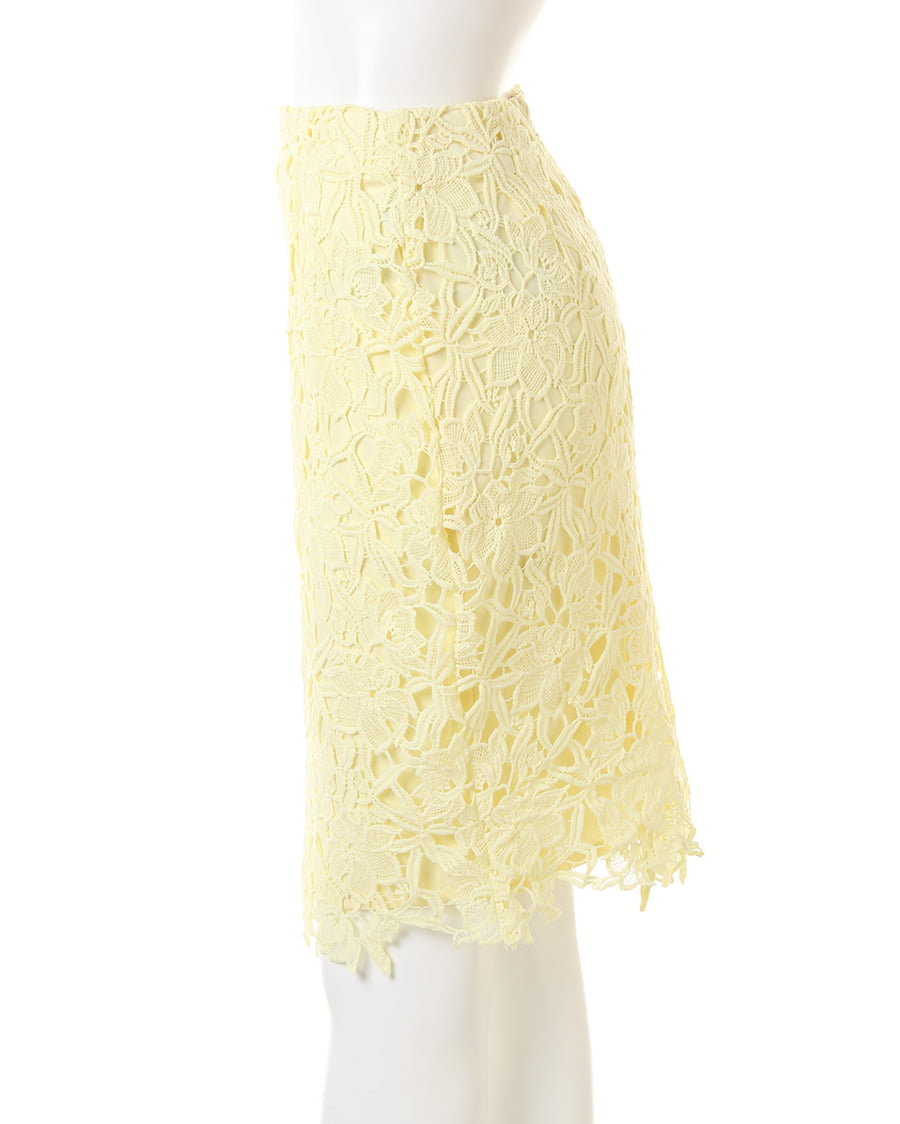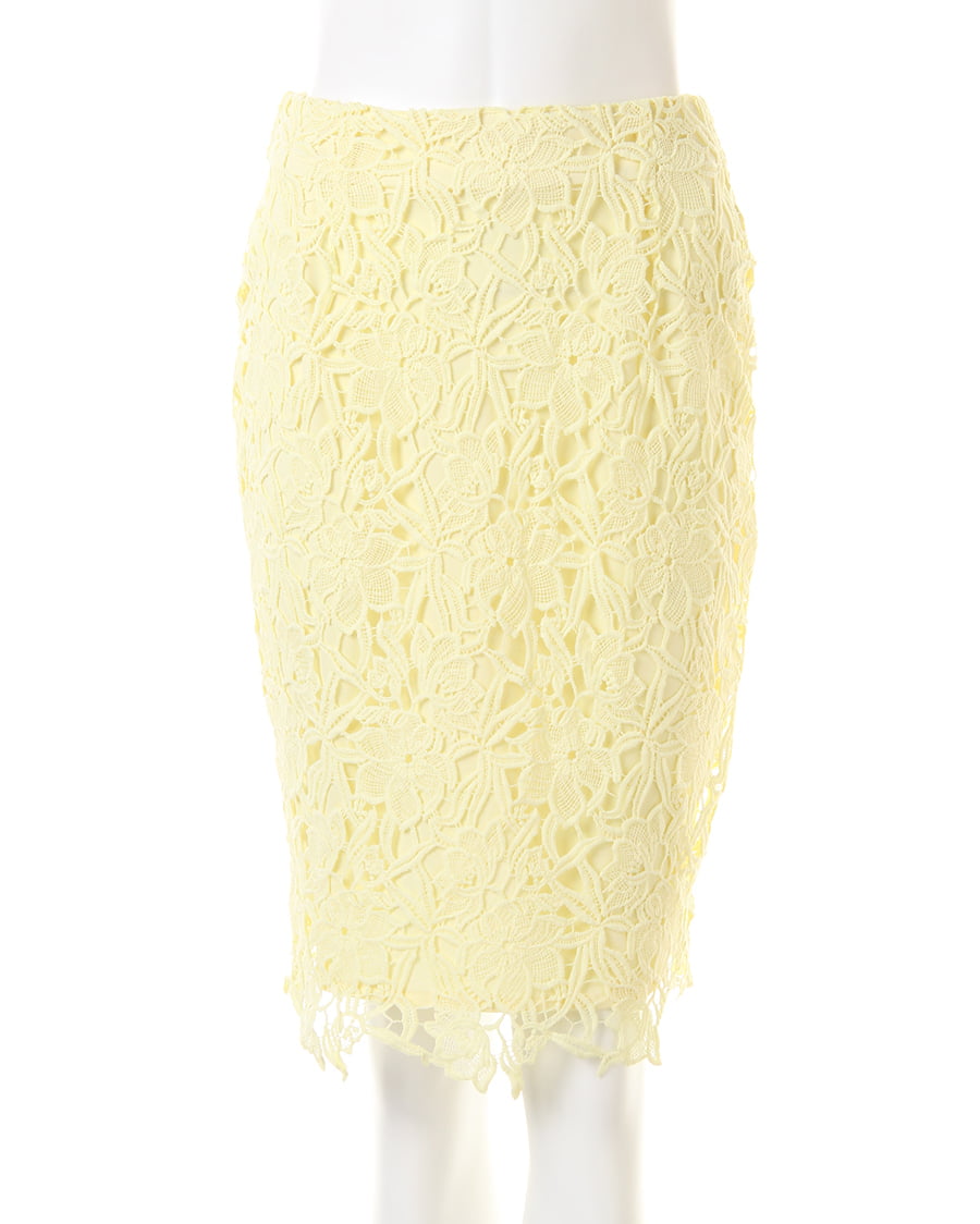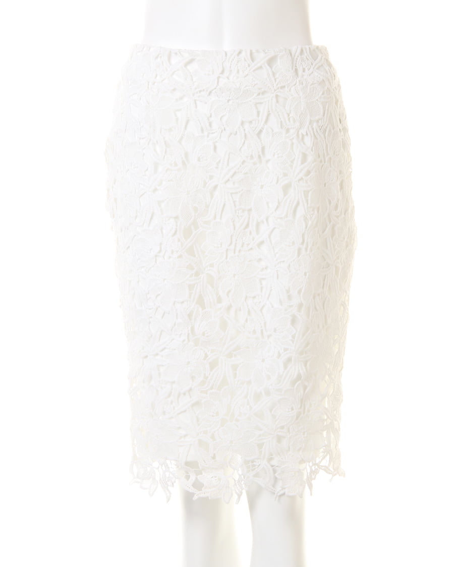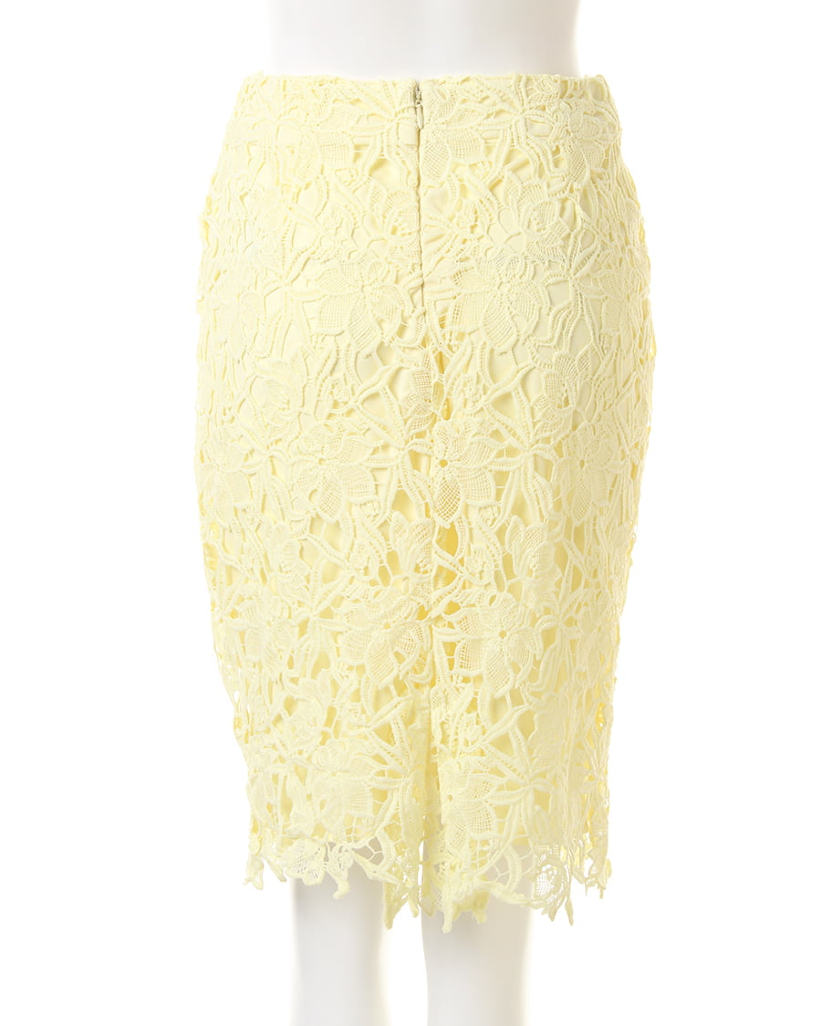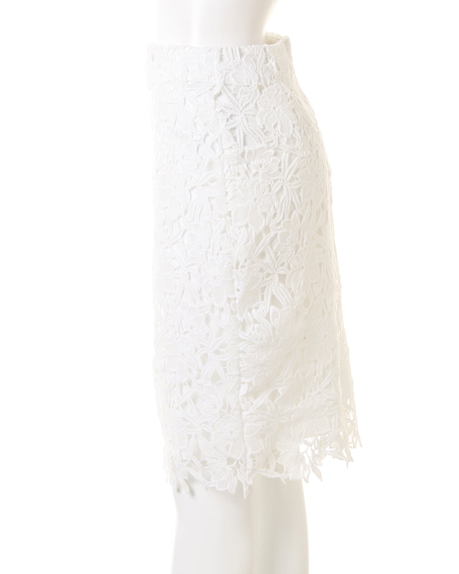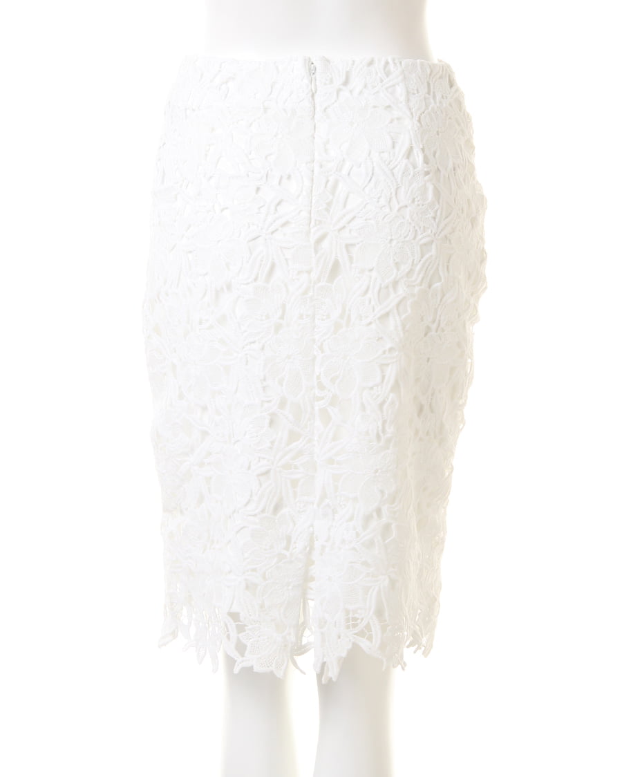 上品な丈感で大人っぽく着こなせるタイトシルエットのスカートは大きめのフラワーレースが新鮮。固めのしっかりした生地で動きやすく、上に重ねたレースとのバランスが◎。裾部分をランダムにすることで動きのあるスタイルへと導きます。センターバックにはタックを入れて立体感を持たせたデザイン性にも注目。今季はパンプスを合わせてとことん女らしく着こなして。