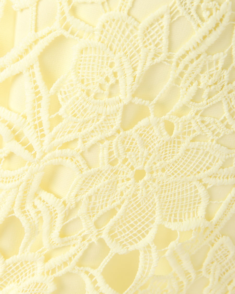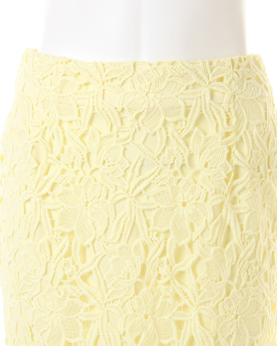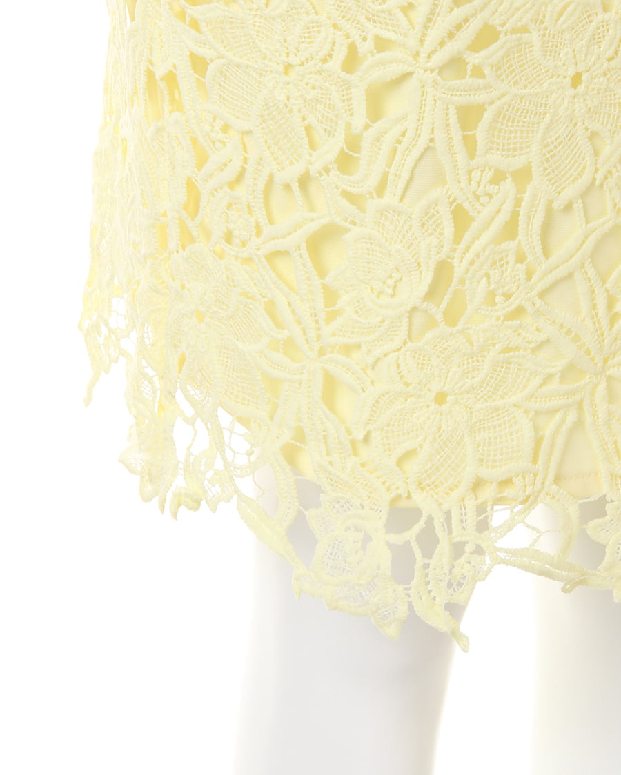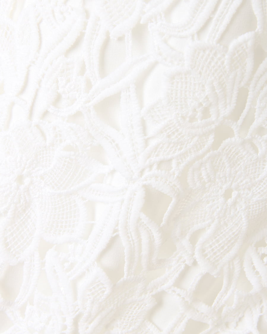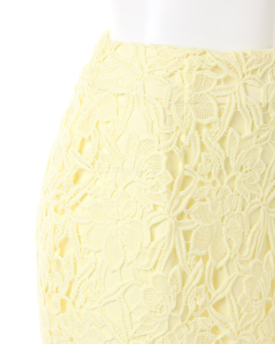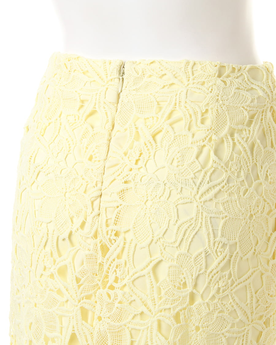 上品な丈感で大人っぽく着こなせるタイトシルエットのスカートは大きめのフラワーレースが新鮮。固めのしっかりした生地で動きやすく、上に重ねたレースとのバランスが◎。裾部分をランダムにすることで動きのあるスタイルへと導きます。センターバックにはタックを入れて立体感を持たせたデザイン性にも注目。今季はパンプスを合わせてとことん女らしく着こなして。