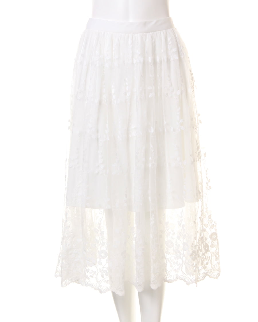 ふんわりとしたチュールにクラシカルでハリ感のある刺しゅうを施したスカート。歩くたびに揺れるシルエットがエアリーな女性らしいニュアンスを表現、存在感のある一枚です。ニットを合わせてガーリーに、オーバーサイズのスウェット使いでカジュアルな着合わせも◎。ウエスト後ろ部分はゴムになっているので着脱が楽チン。ロングシーズン活躍が期待できる万能アイテムです。