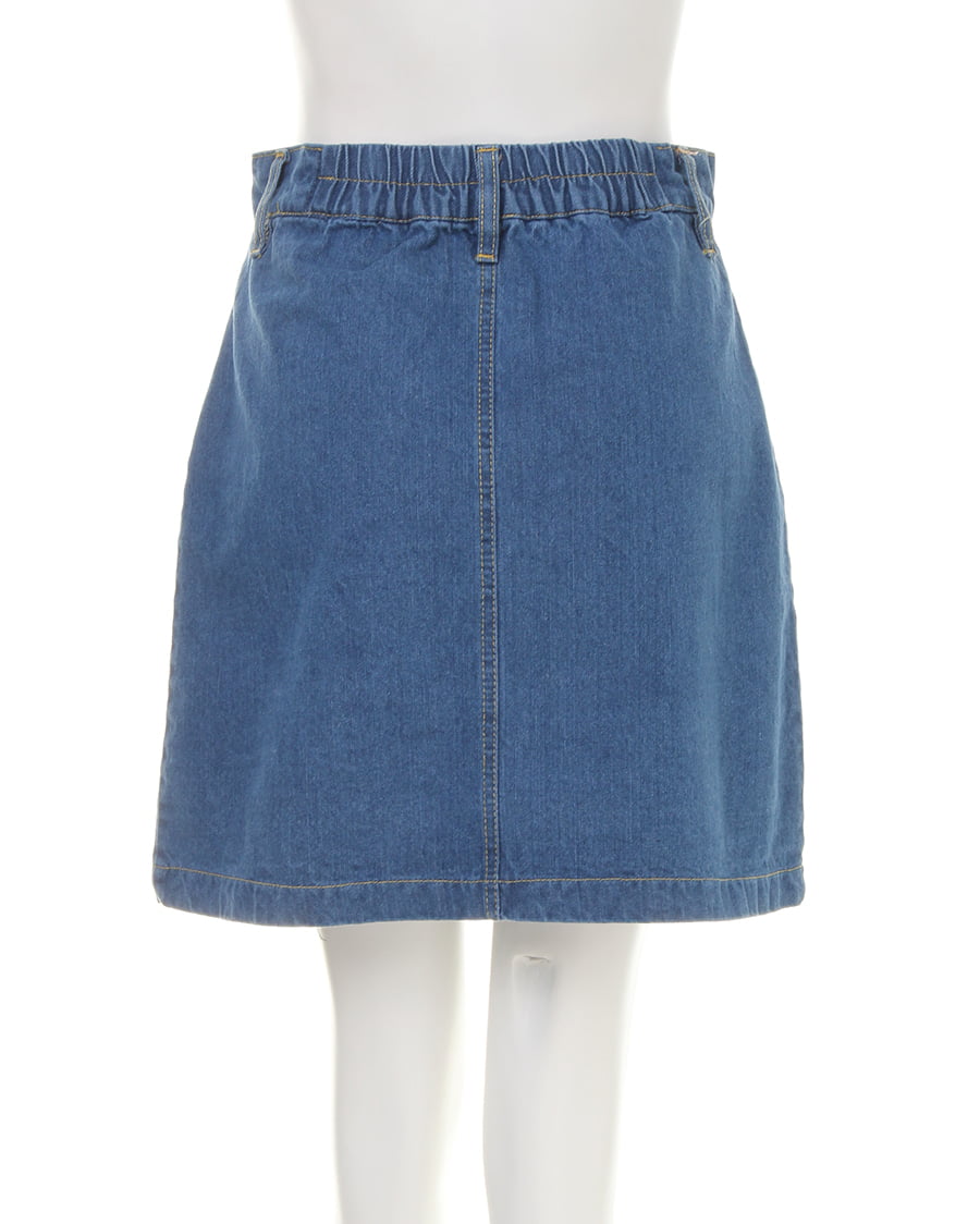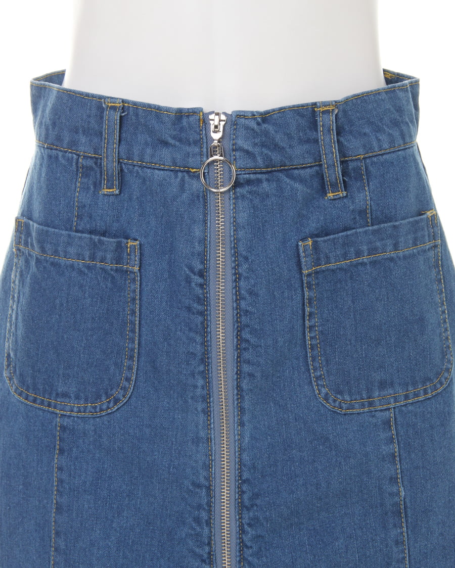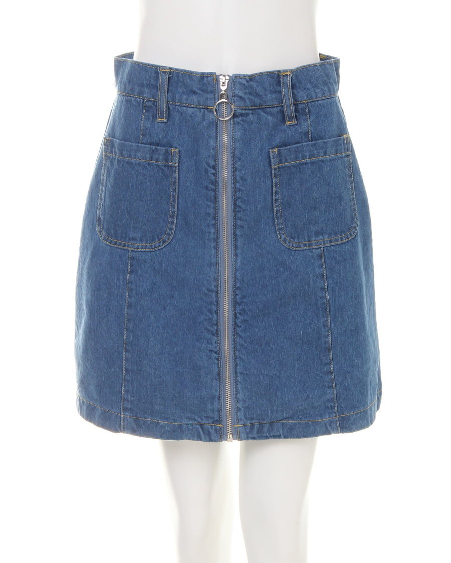 フロント部分のジップ使いがスタイリッシュ&クールな台形シルエットのスカートです。しっかりとした固めのデニム生地がキレイなラインをキープしてくれます。縦に切り替えのラインを入れることで腰周りをすっきり見せてくれるのでショート丈もバランスよく合わせられます。Tシャツやスニーカーでアクティブに着こなすのはもちろん、フェミニンなブラウスと合わせたスタイルもおすすめ。