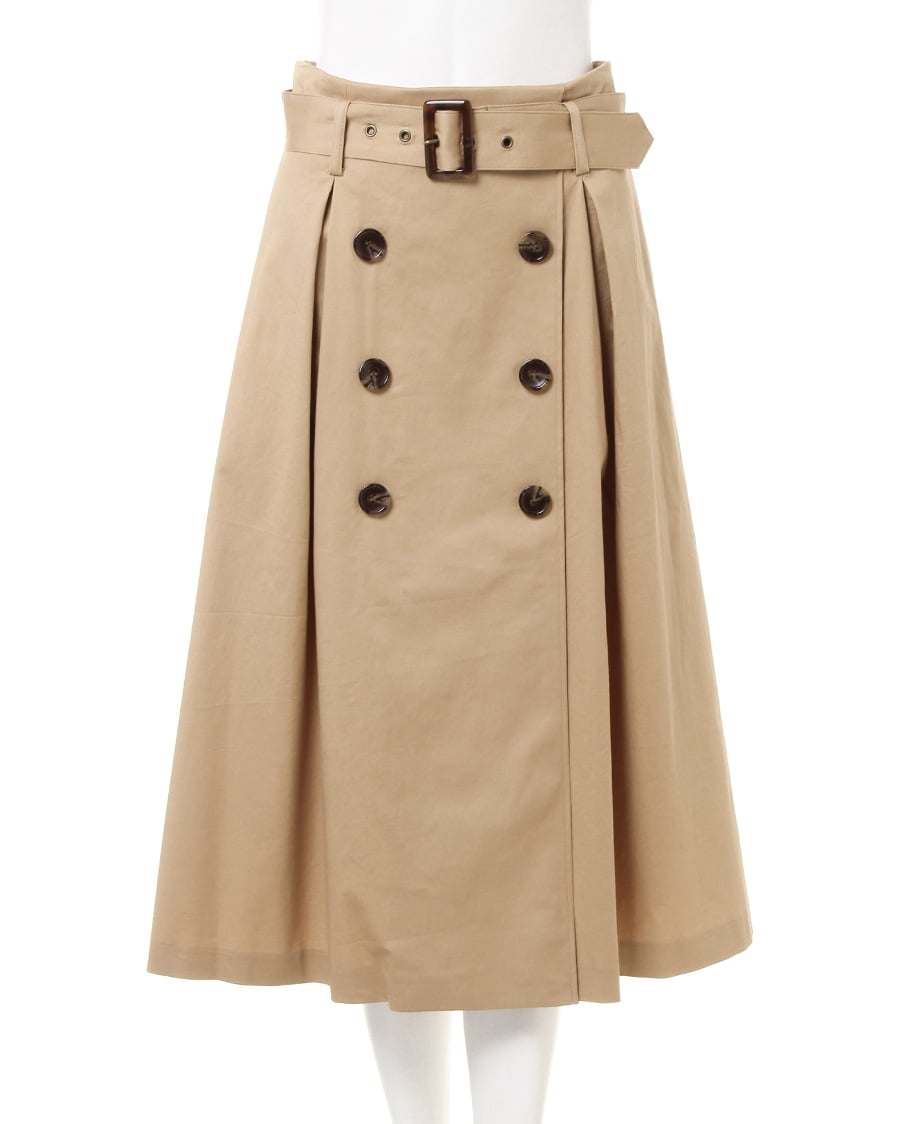 ひざ下の絶妙な丈感が女性らしい雰囲気をあおるスカートは人気のトレンチデザインを採用した旬の要素が詰まった1枚。スクエアバックルがポイントの共布ベルトがメリハリのあるスタイルを叶えます。ハリ感のある生地が上品でオンオフ問わずコーディネイトの幅が広がる万能アイテム。フロントのWボタン使いも印象的です。