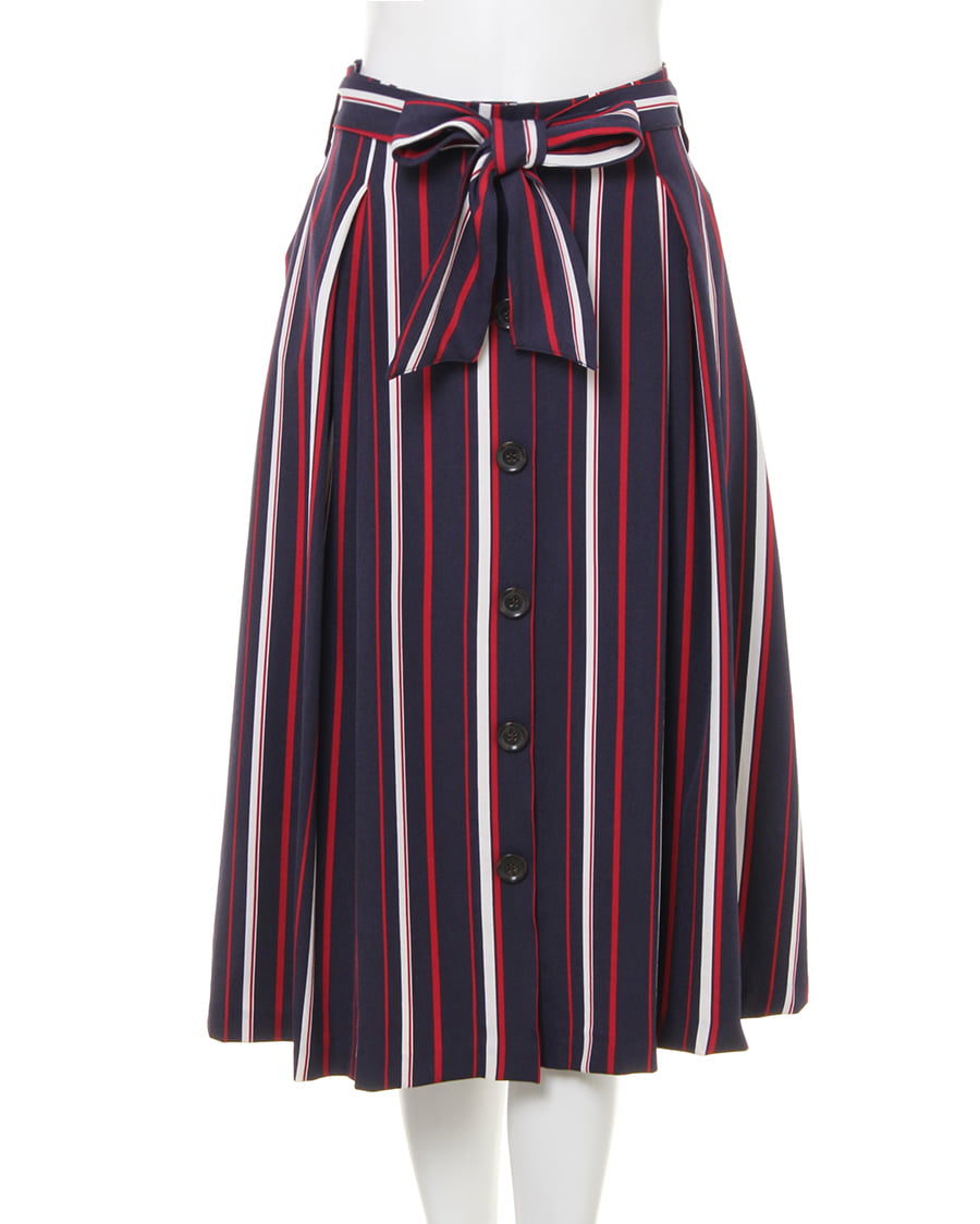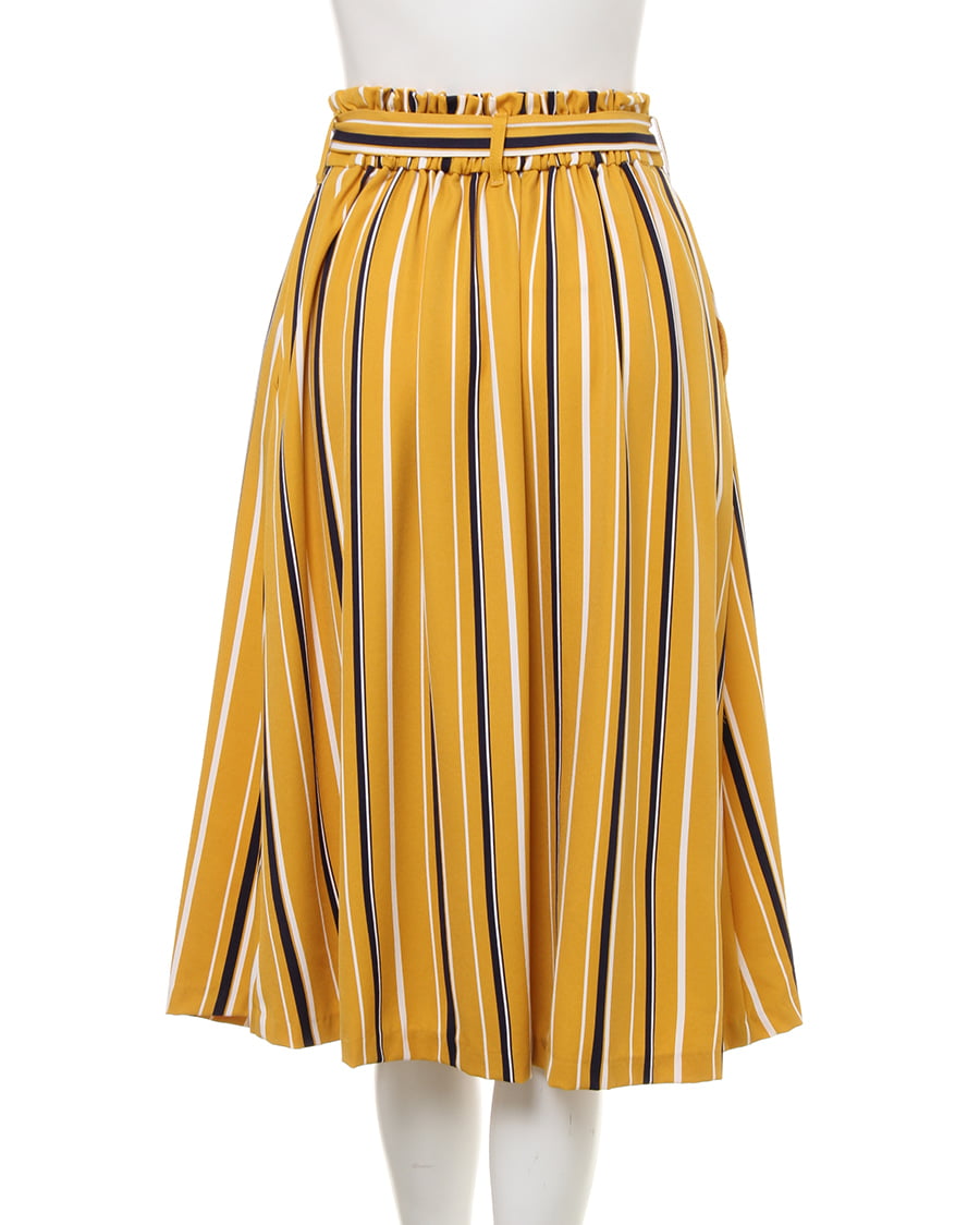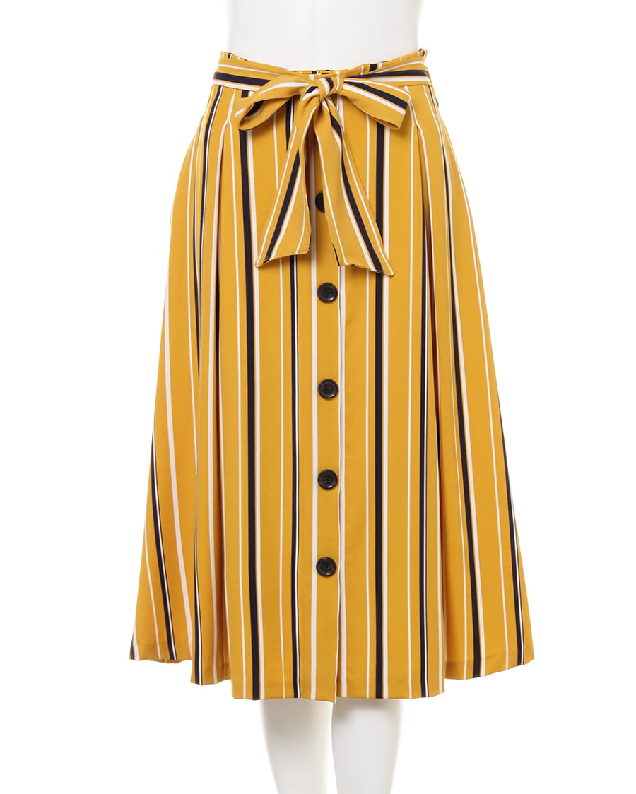 インパクトのあるストライプの配色が今年らしいミディスカート。シンプルになりがちなこれからのコーデにプラスするだけで、トレンドライクなスタイルにブラッシュアップしてくれるデザイン性の高いアイテムです。さらっとした素材を採用したことで、歩くたびに揺れるシルエットがエレガントで女性らしい雰囲気をメイクします。膝下の絶妙な丈が上品な仕上がり。バックウエストにはゴムを入れているので着脱も楽チン。共布のサッシュ付きなのも嬉しいポイントです。