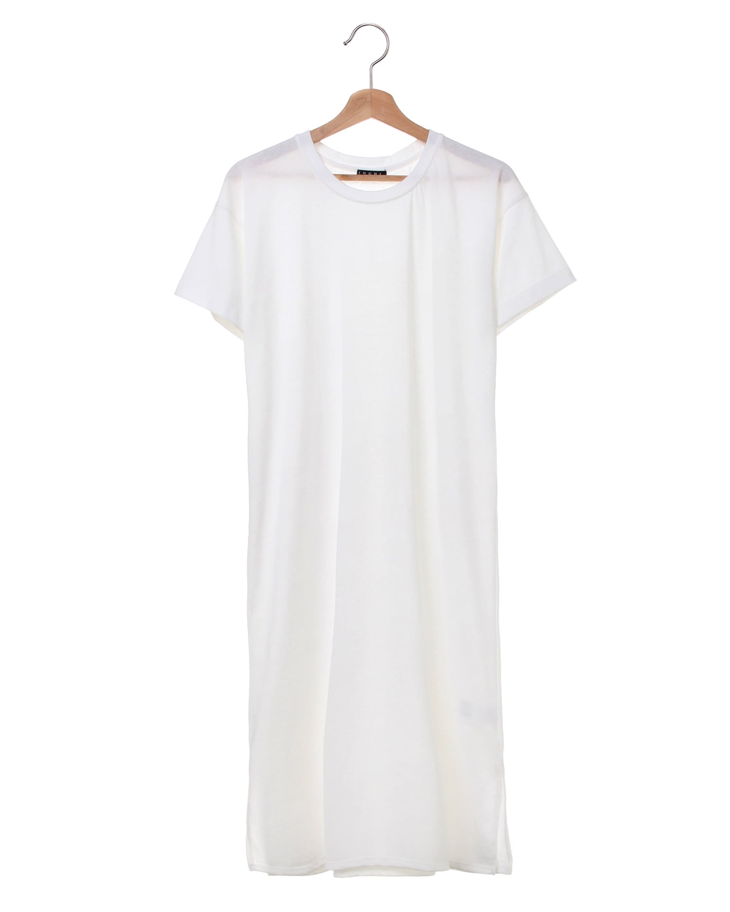 ナチュラルテイストたっぷりのカットソー生地で仕立てたワンピース。ドロップショルダーとゆったりめの身頃が今年らしい1枚です。しなやかで柔らかな素材で快適な着心地。ベーシックなシルエットで普段使いに重宝します。裾のサイドにスリットを入れているので1枚ではもちろん、パンツを合わせたスタイルもオススメ。