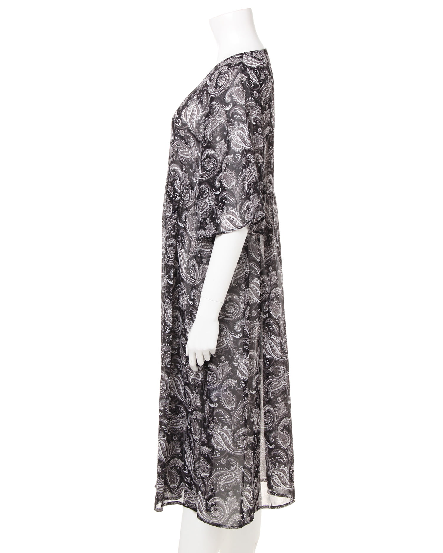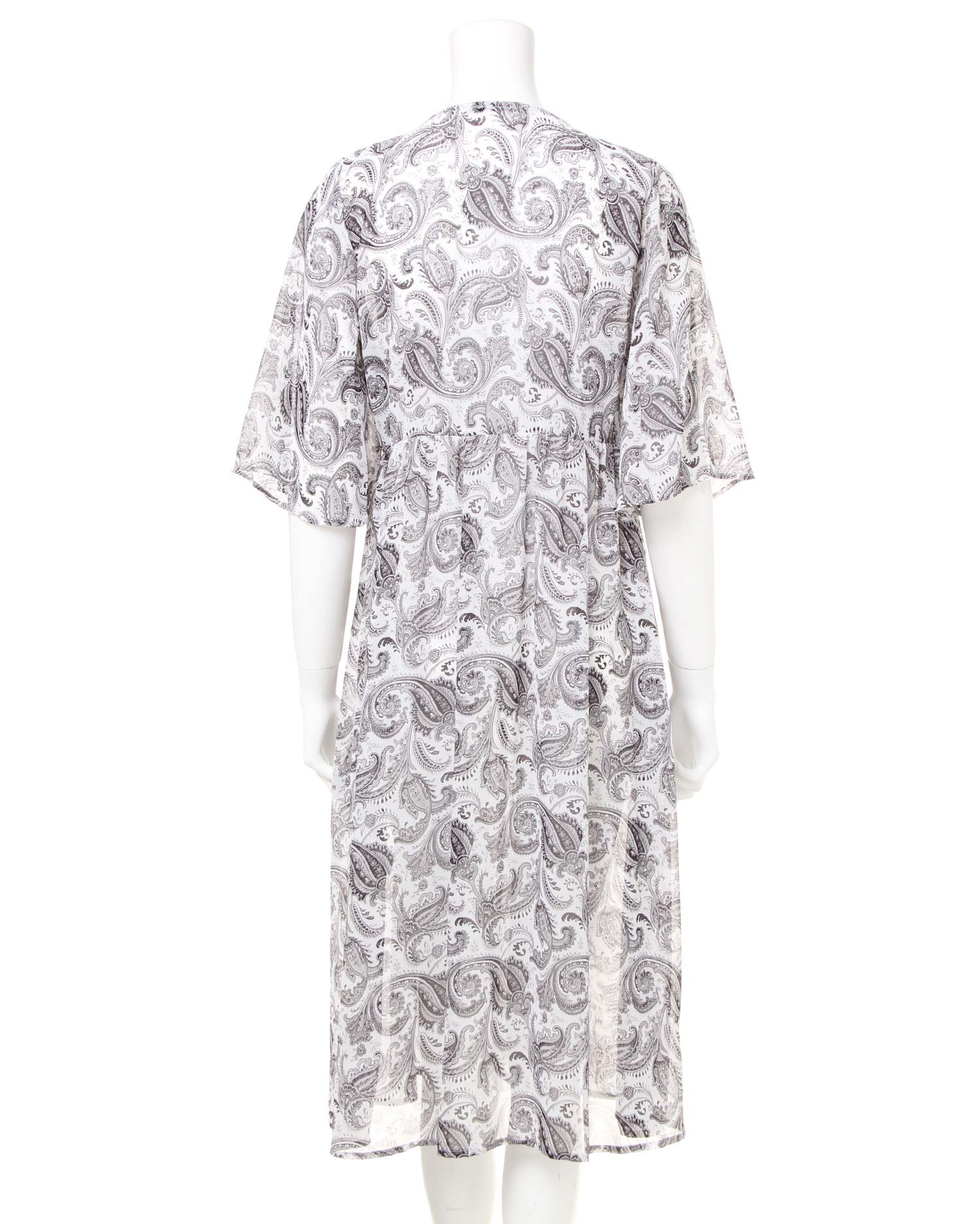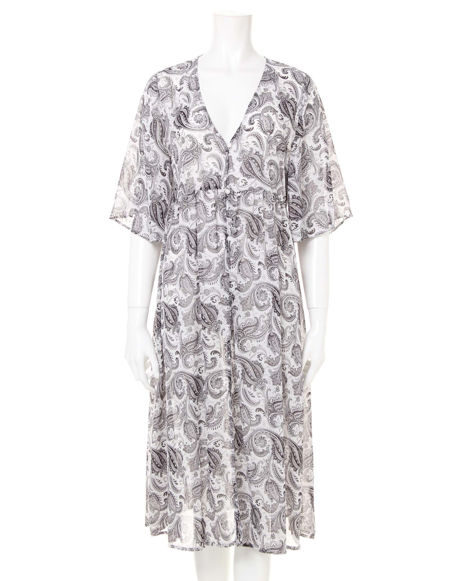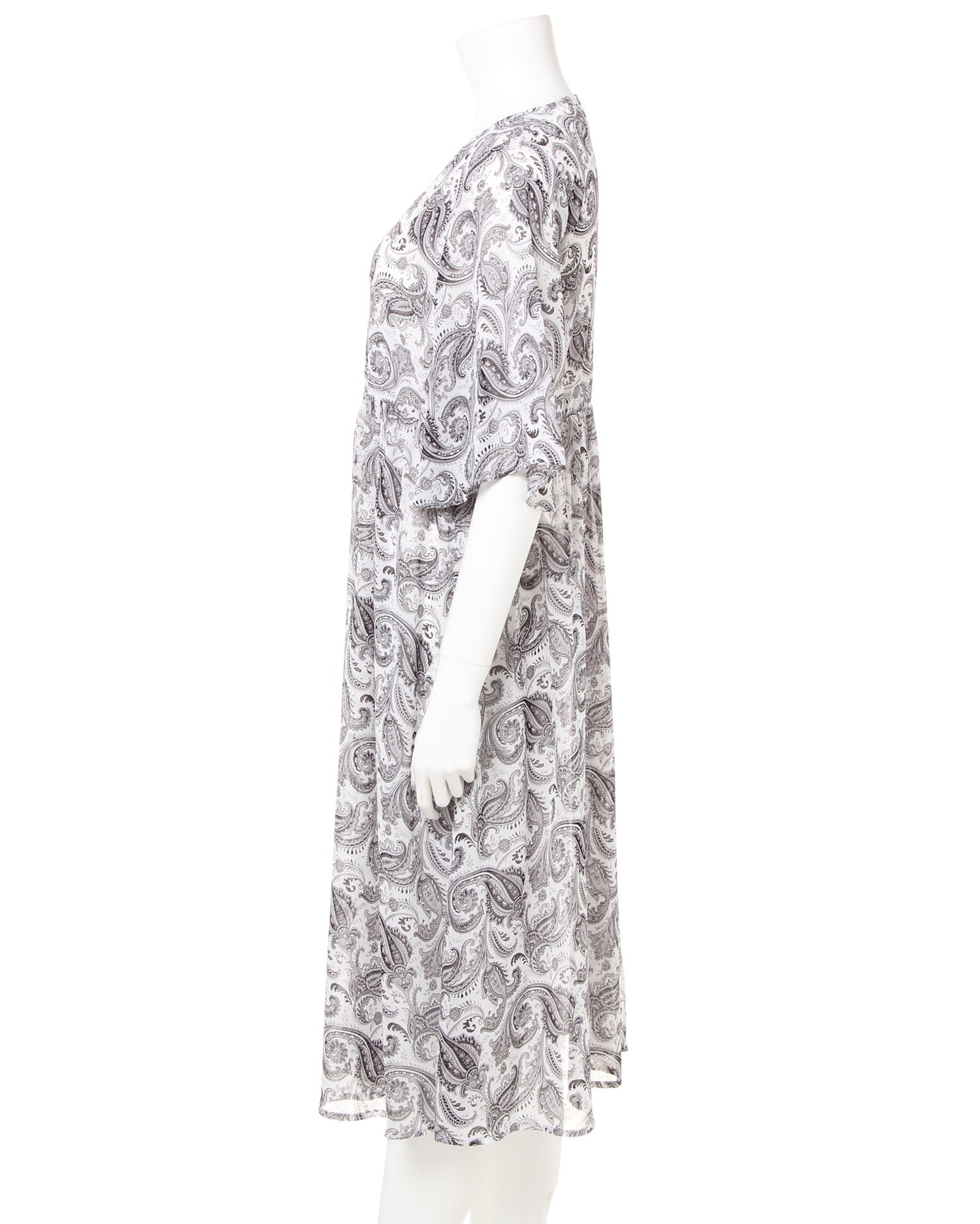 さらっと滑らかで透けのある涼しげなルックスが季節感をあおるペイズリー柄のガウン。シンプルになりがちなこれからのコーデにプラスするだけで旬のスタイルが完成します。ざっくり開いたVネックが抜け感を演出、ロングな丈がコーディネイトをスタイリッシュにまとめます。高めの位置に切り替えを入れたシルエットで脚長効果も期待。ワードローブに1枚は欲しい万能アイテムです。