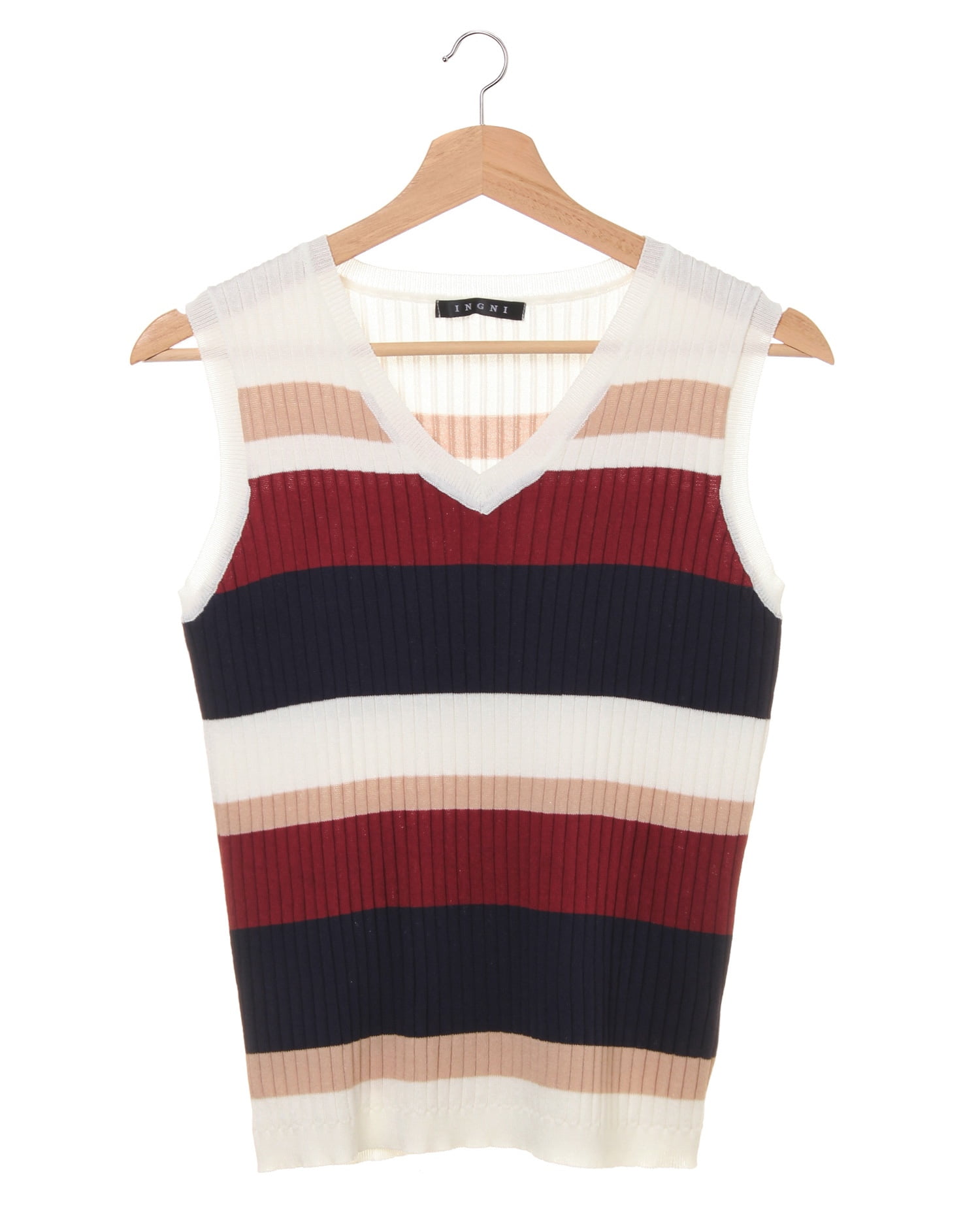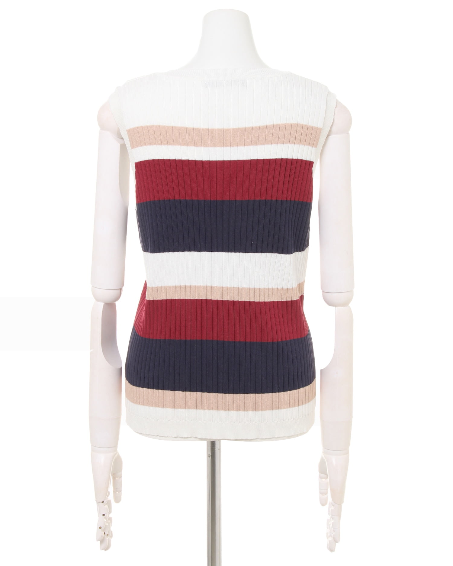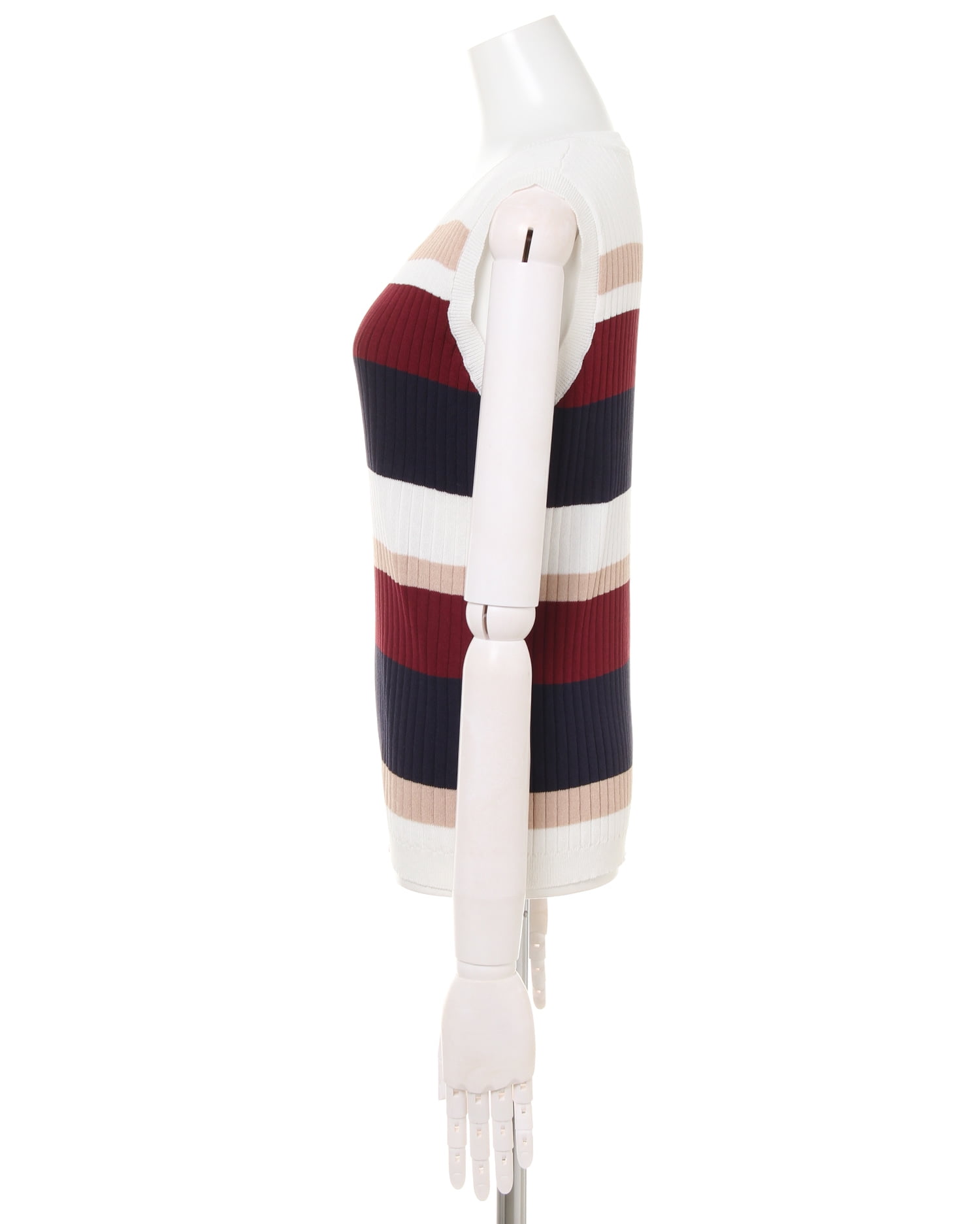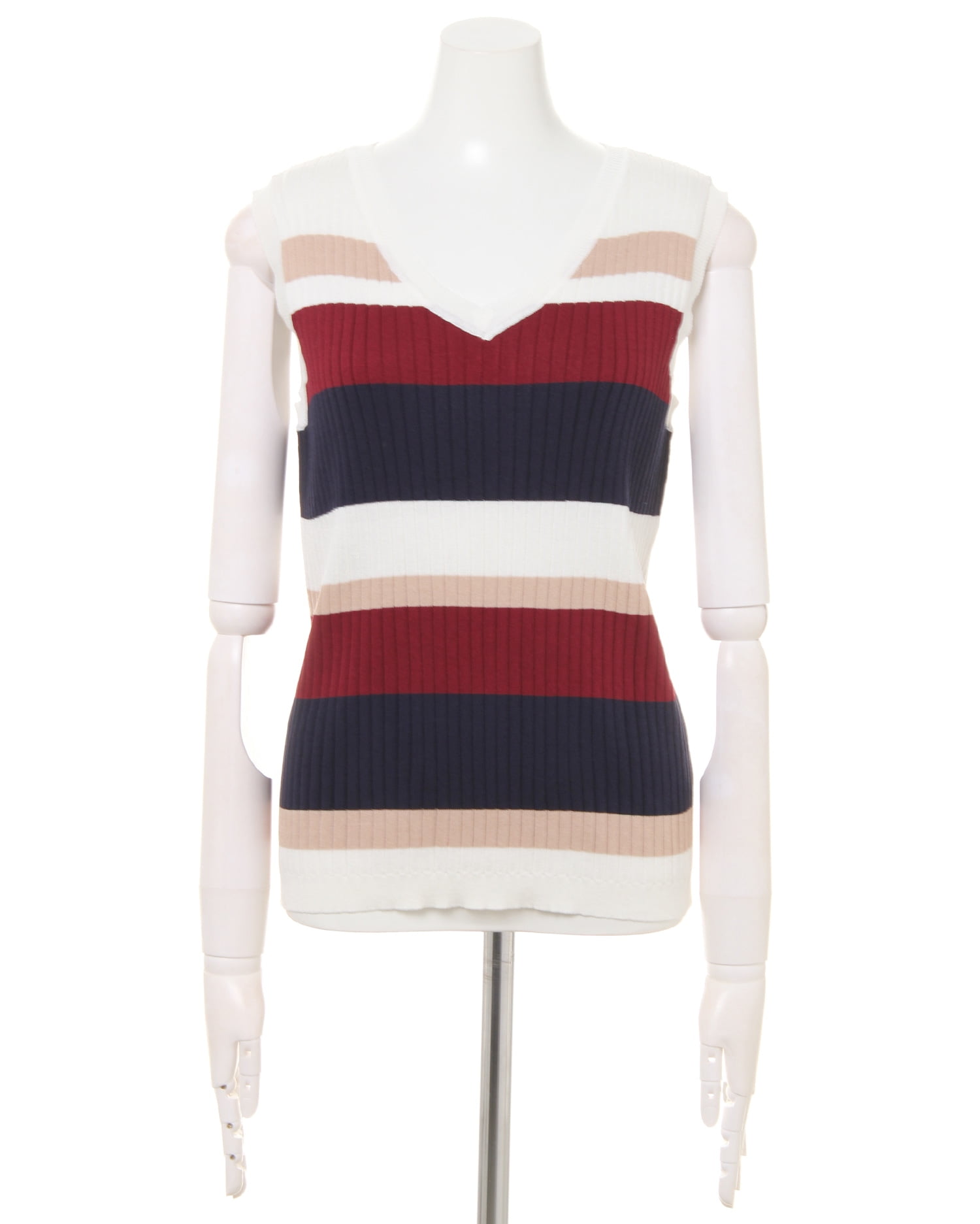 柔らかく肌馴染みのいいニット素材がボディラインにきれいにフィットするノースリーブトップス。女性らしいシルエットを強調してくれる生地感と絶妙なサイズが魅力的。すっきり開いたネックが清涼感を与え、シーズンムードを高めます。大人可愛いマルチボーダーはトレンドの着こなしにぴったり。