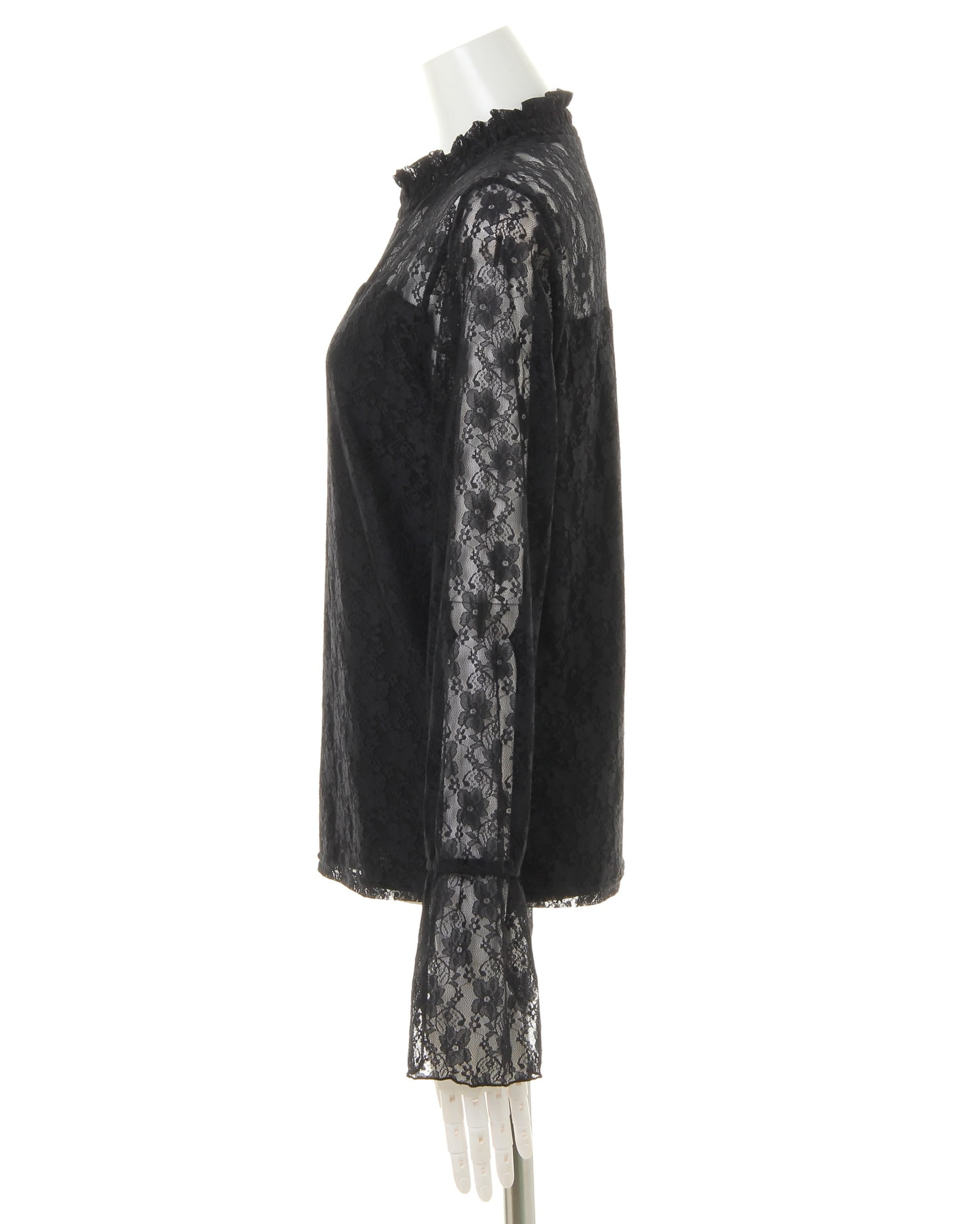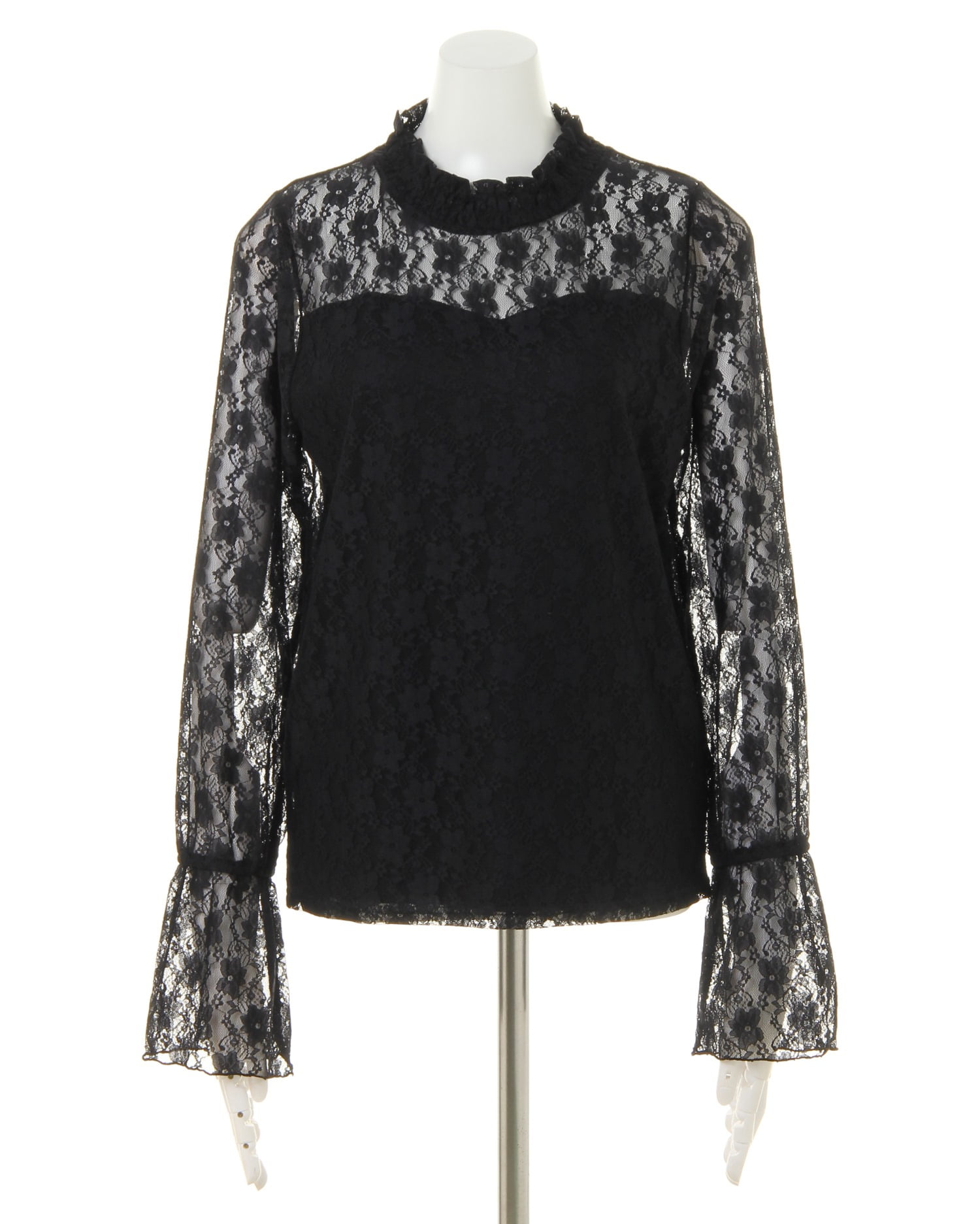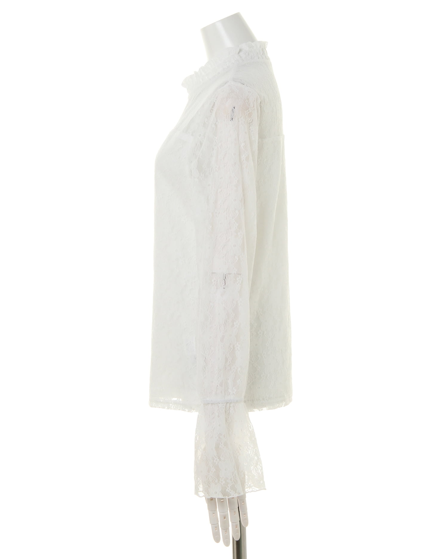 ハイネックと袖部分に施した繊細なレースでクラシカルレディなスタイルが完成するトップス。フラワーレースから透ける素肌との組み合わせが大人な雰囲気です。ひらりと広がるフレアの袖口もポイント。身頃部分には裏地付きなので、1枚でも安心して着られます。薄手の伸縮性抜群の素材はジャケットのインにも◎。