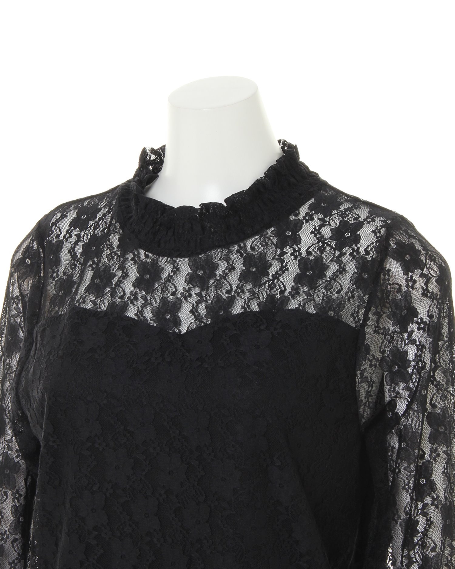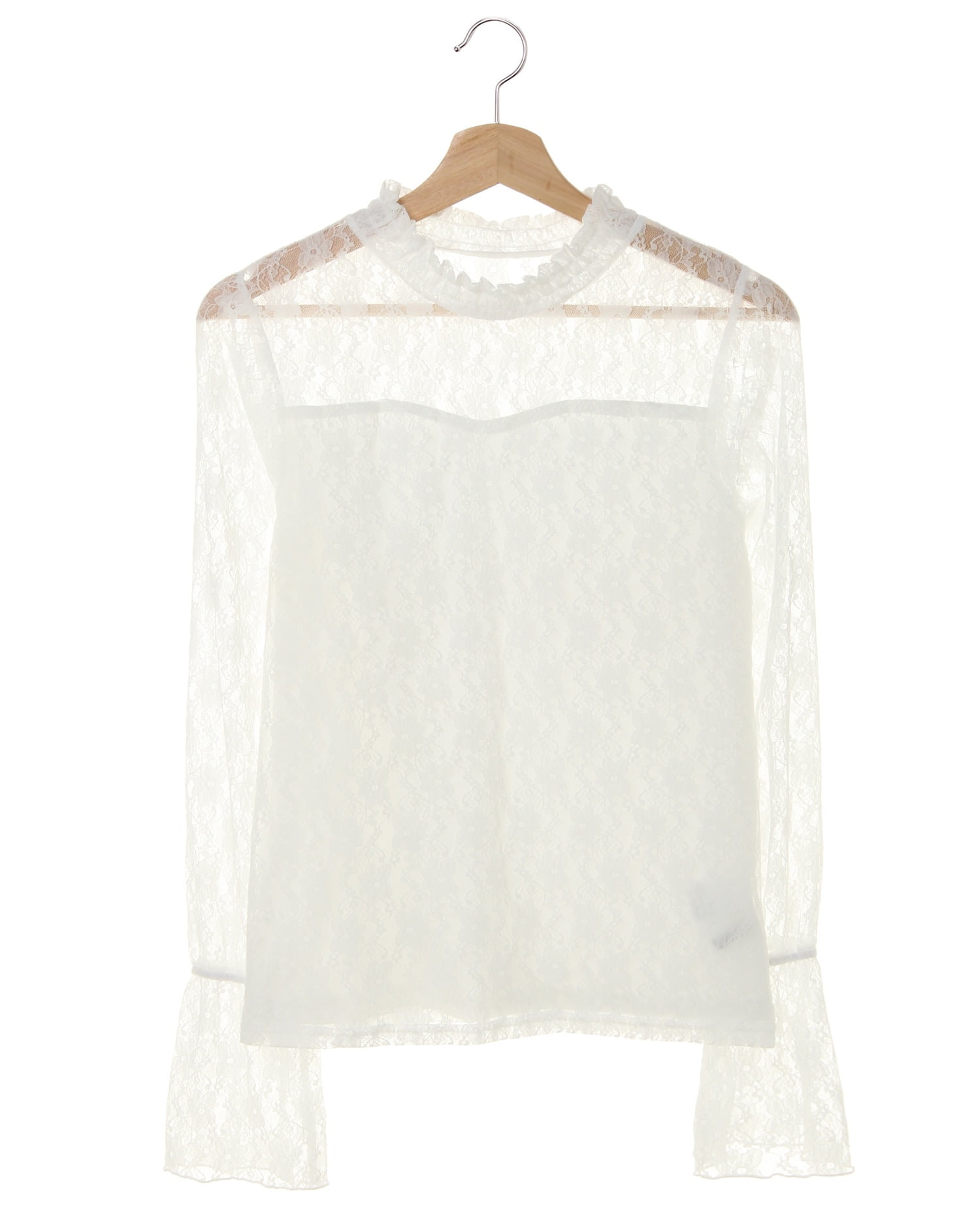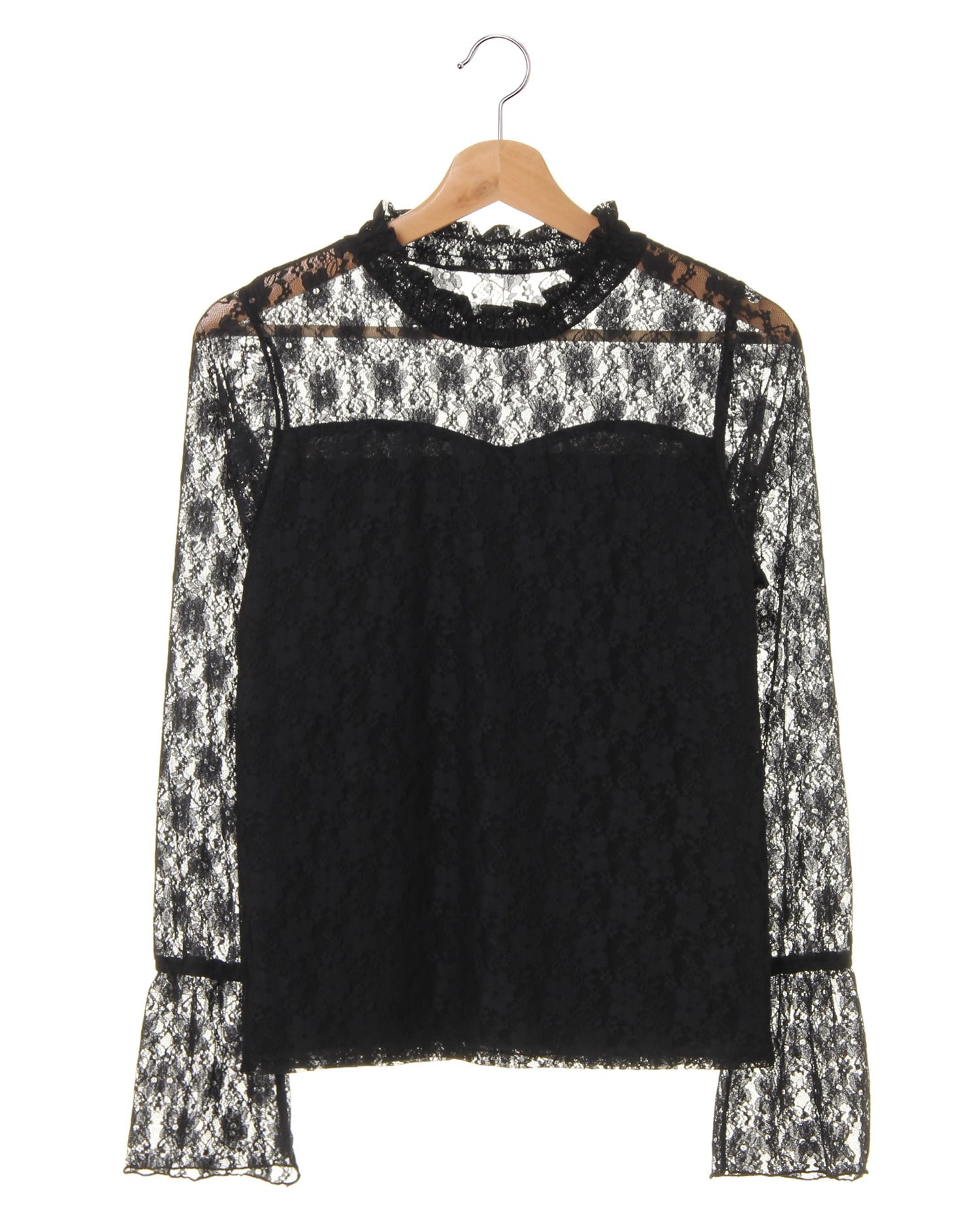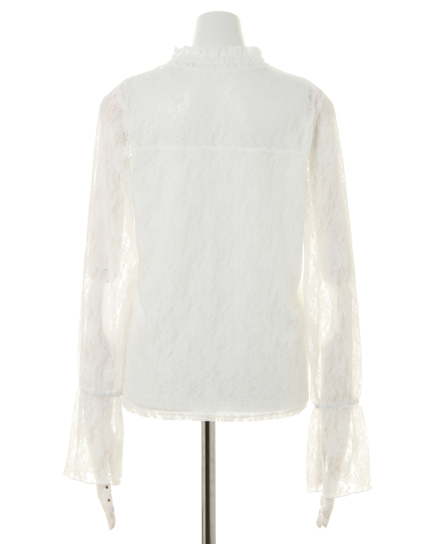ハイネックと袖部分に施した繊細なレースでクラシカルレディなスタイルが完成するトップス。フラワーレースから透ける素肌との組み合わせが大人な雰囲気です。ひらりと広がるフレアの袖口もポイント。身頃部分には裏地付きなので、1枚でも安心して着られます。薄手の伸縮性抜群の素材はジャケットのインにも◎。