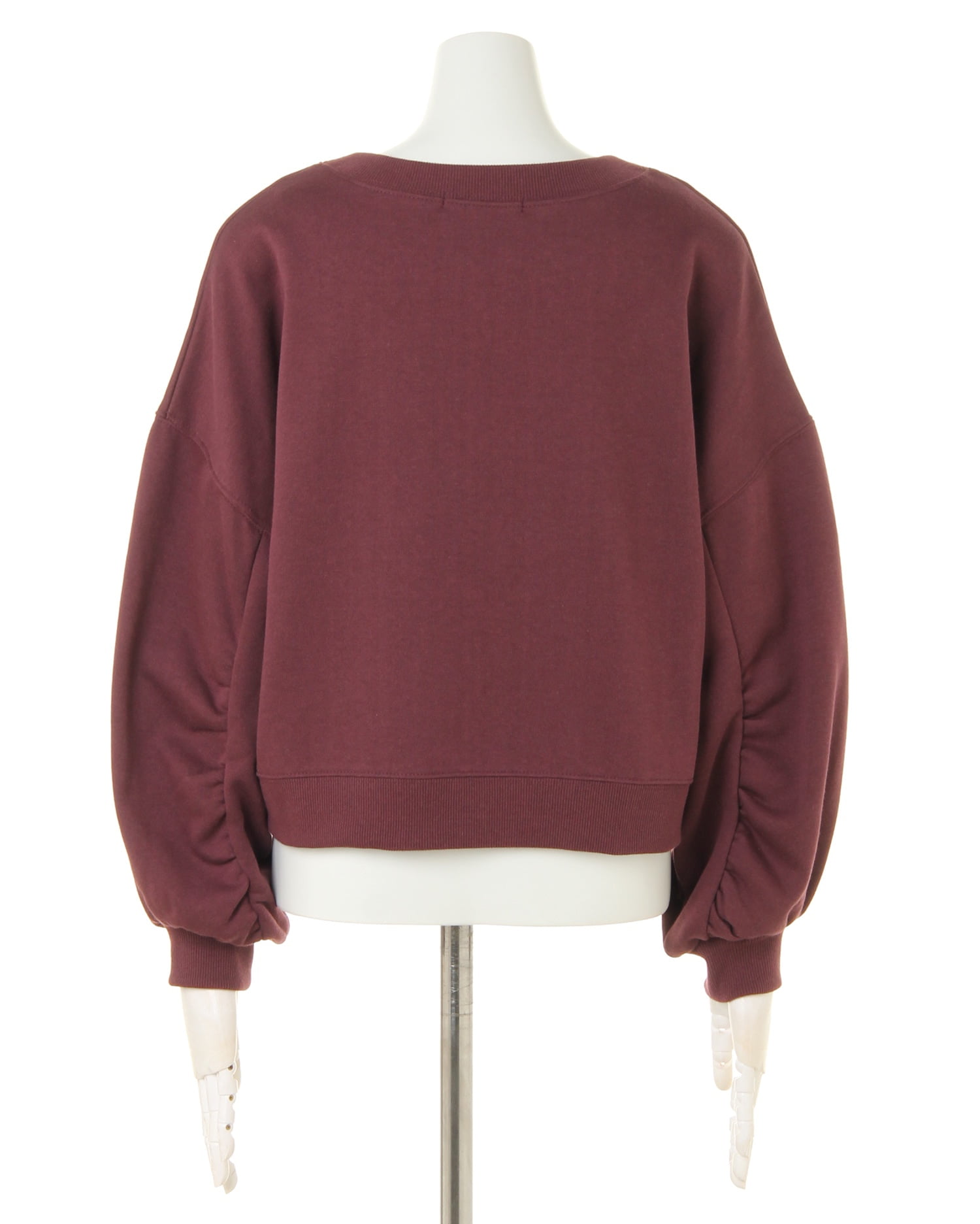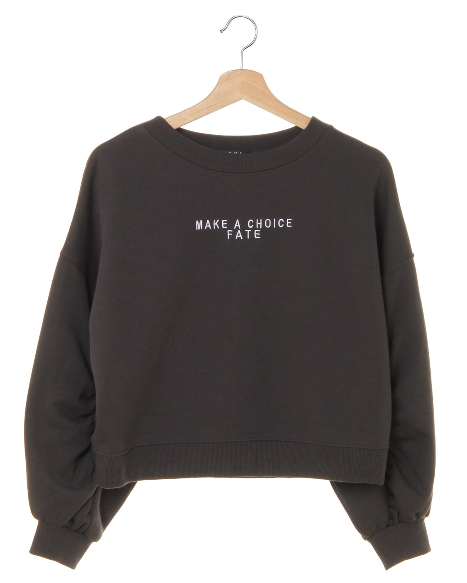 ベーシックなスウェット生地のトップスは、フロントのメッセージロゴがワンアクセントに。伸びが良く肌触り柔らかな素材は、裏毛が起毛仕様で暖かく保温性も抜群。袖部分にたっぷりと入れたタックが、ボリュームのある袖をキープし今年らしいシルエットを演出。ドロップショルダーとゆとりのあるシルエットなので、ロングシャツなど様々なレイヤードスタイルもすっきりキマります。