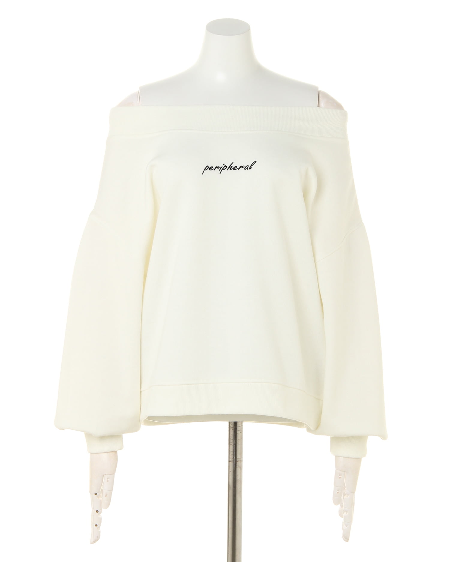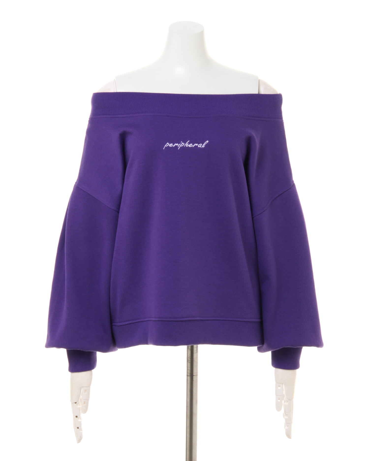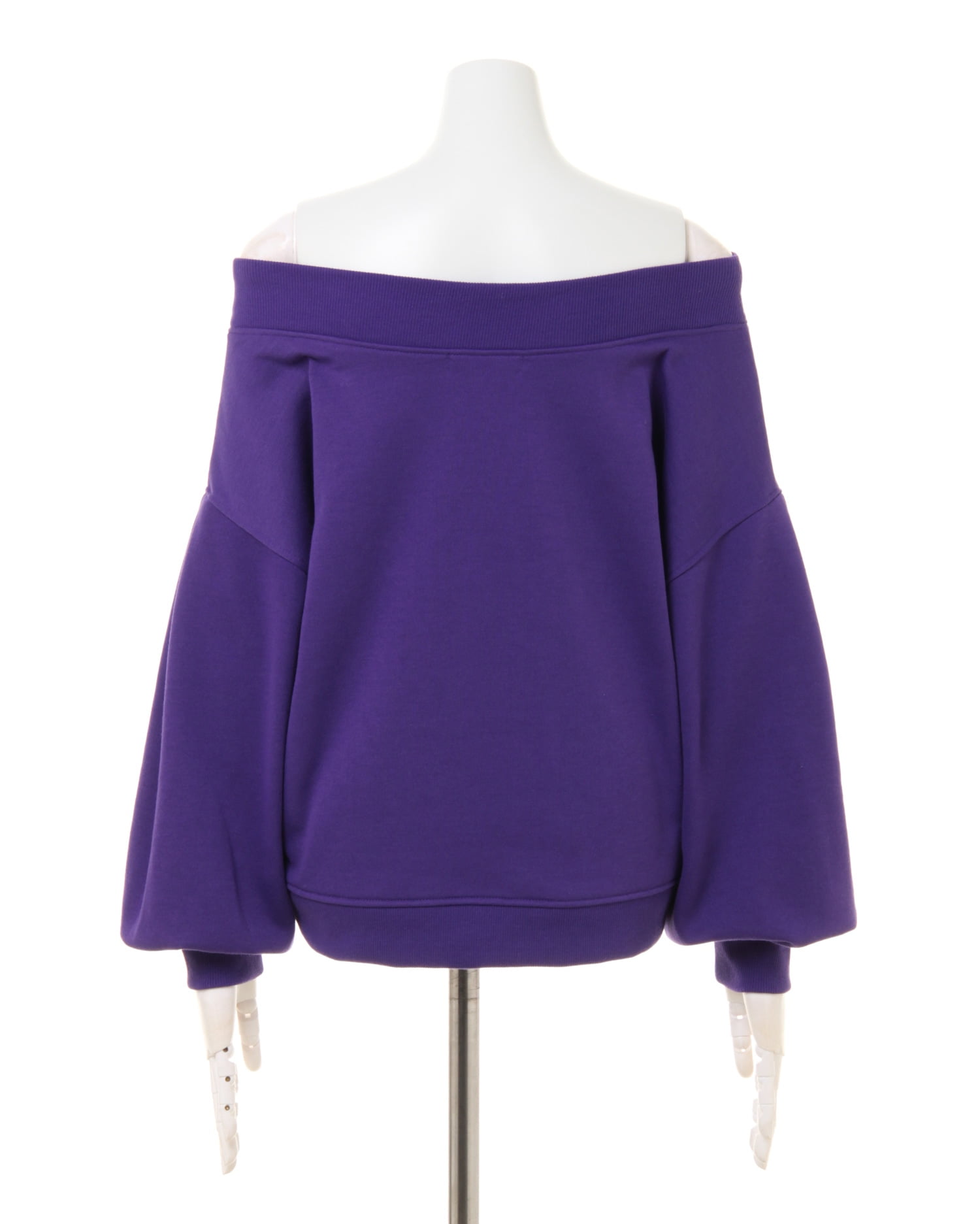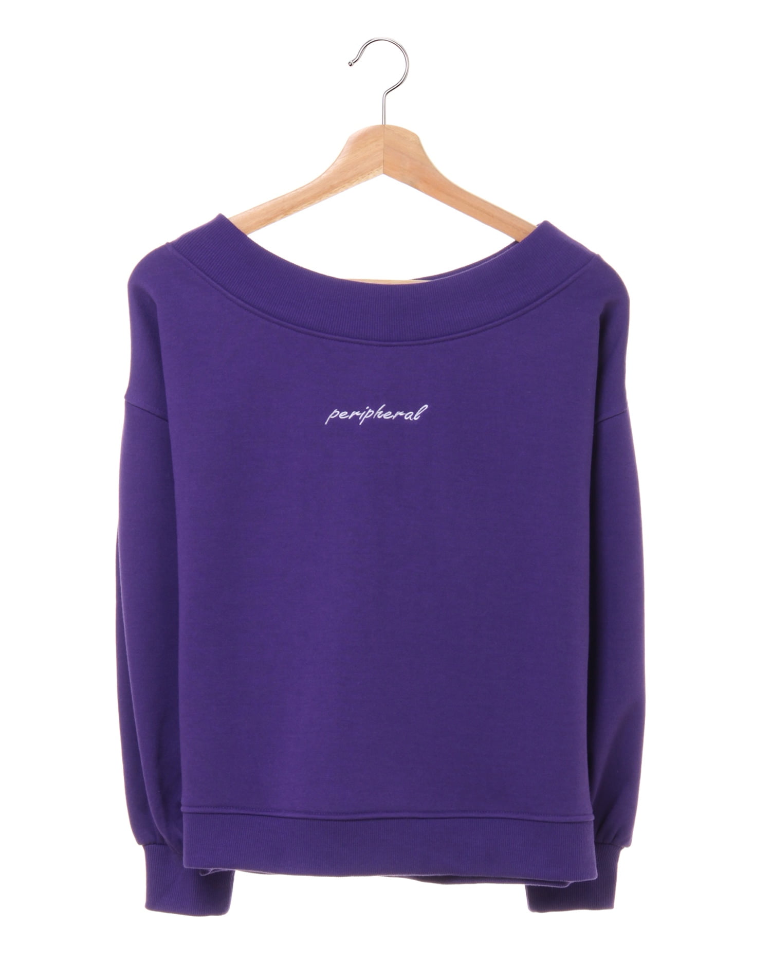 着回し力抜群のシンプルなスウェットをオフショルにした旬顔デザインのトップス。ゆったりめの身幅とボリューム袖がリラックスした快適な着心地に。ネックラインと袖口、裾の縦リブが着こなしにメリハリをプラス。フロントのロゴがワンポイントに。デコルテをきれいに見せるオフショル仕様はもちろん、シャツなどのレイヤードスタイルもオススメです。