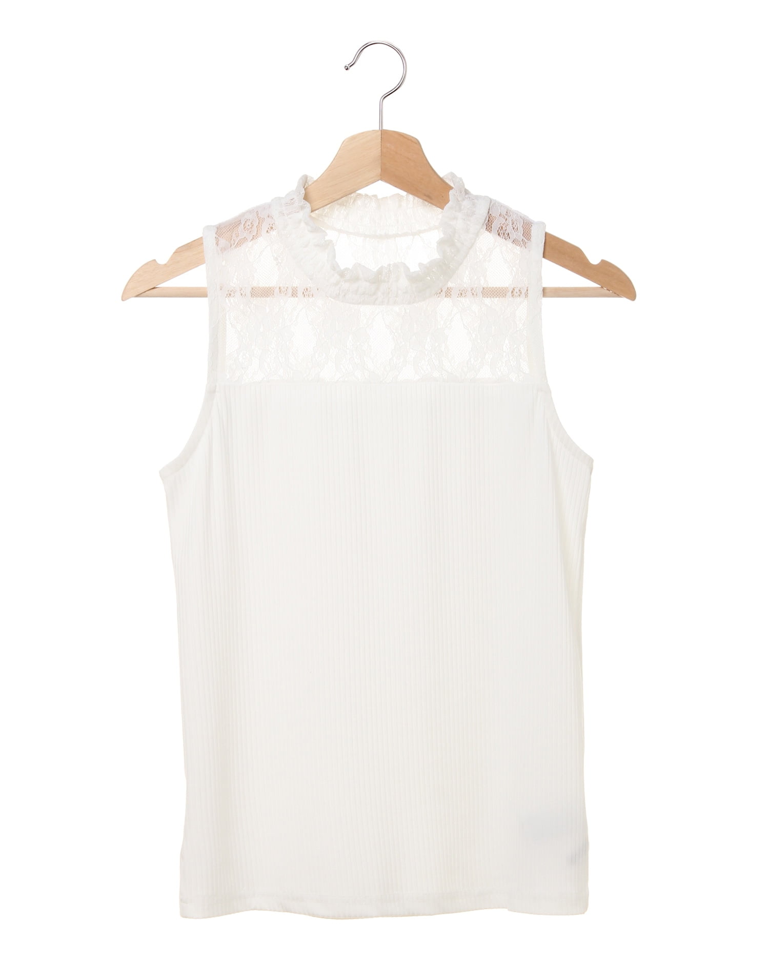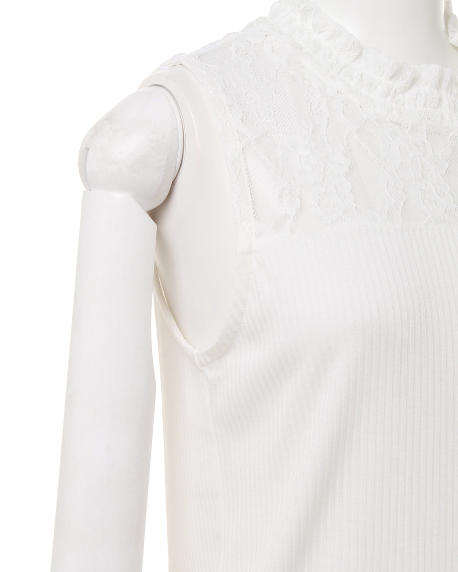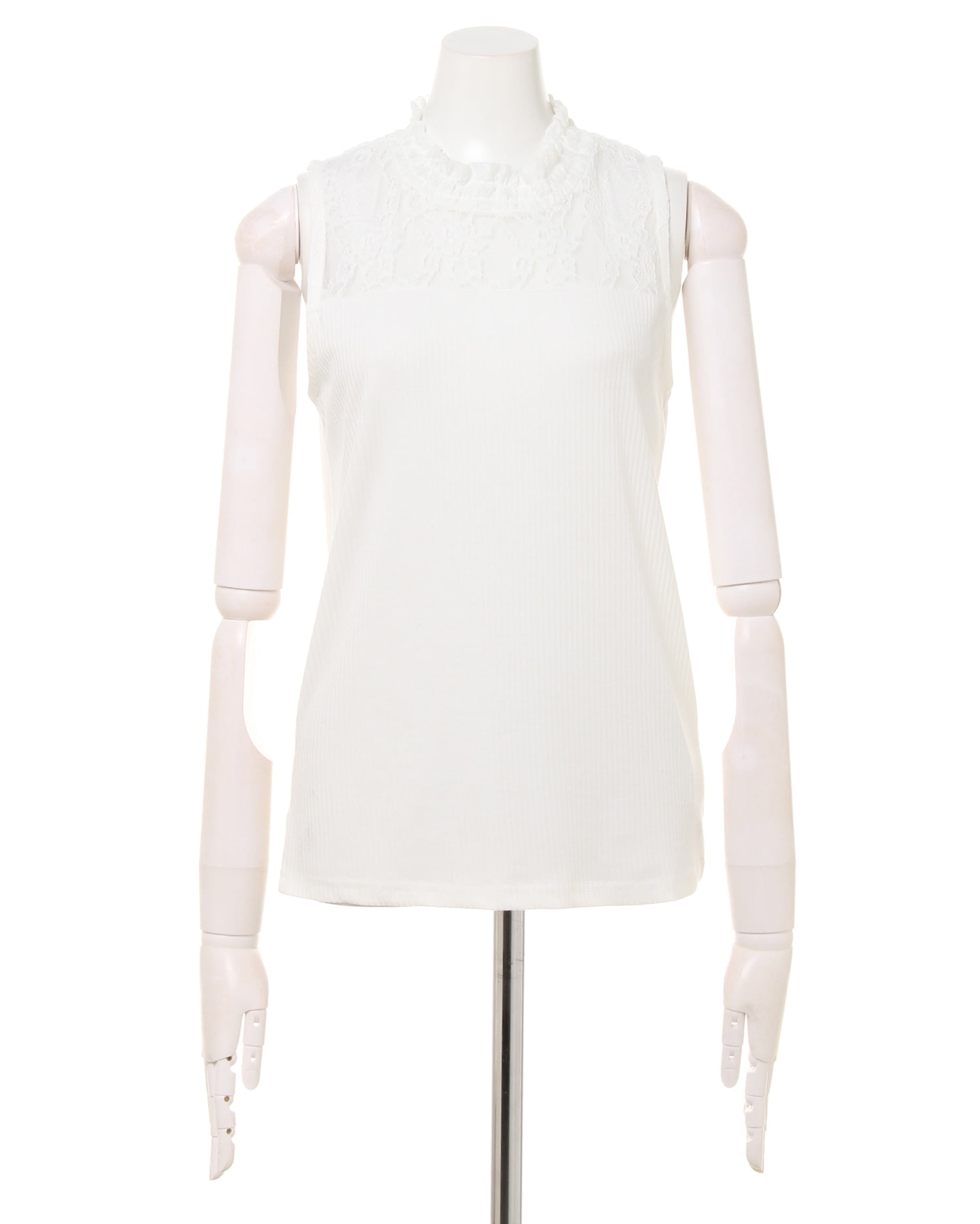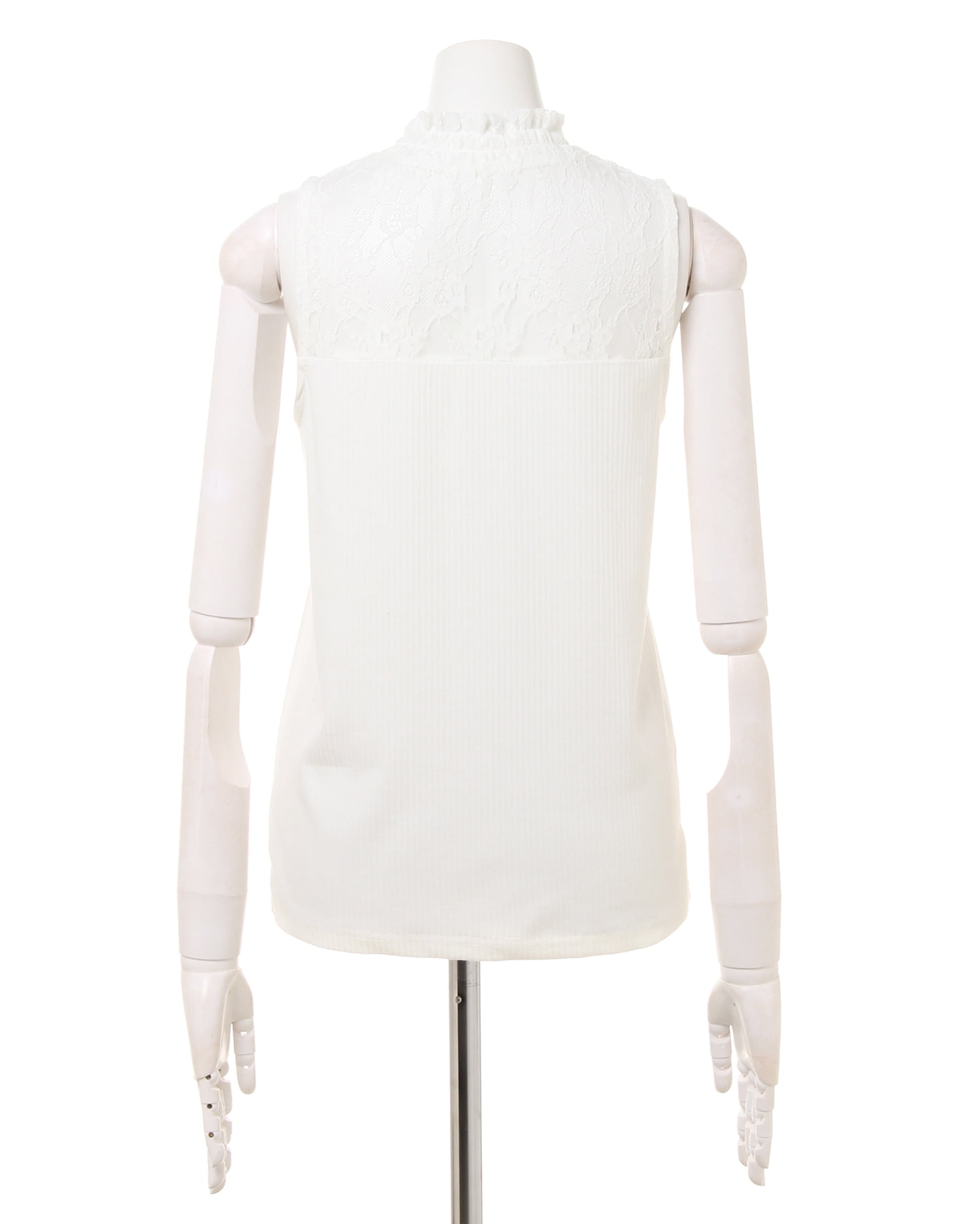ハイネックとヨーク部分に施した繊細なレースがフェミニンな雰囲気のあるノースリーブトップス。薄手でさらっとした素材は肌触り滑らかで、着心地の良い1枚です。細めの縦リブがボディラインにきれいに沿い、女性らしいシルエットを実現。身頃部分は若干透け感があるので、インナーを合せても◎。何枚あっても重宝するアイテムは、ジャケットインやレイヤードスタイルなど着回し力抜群です。