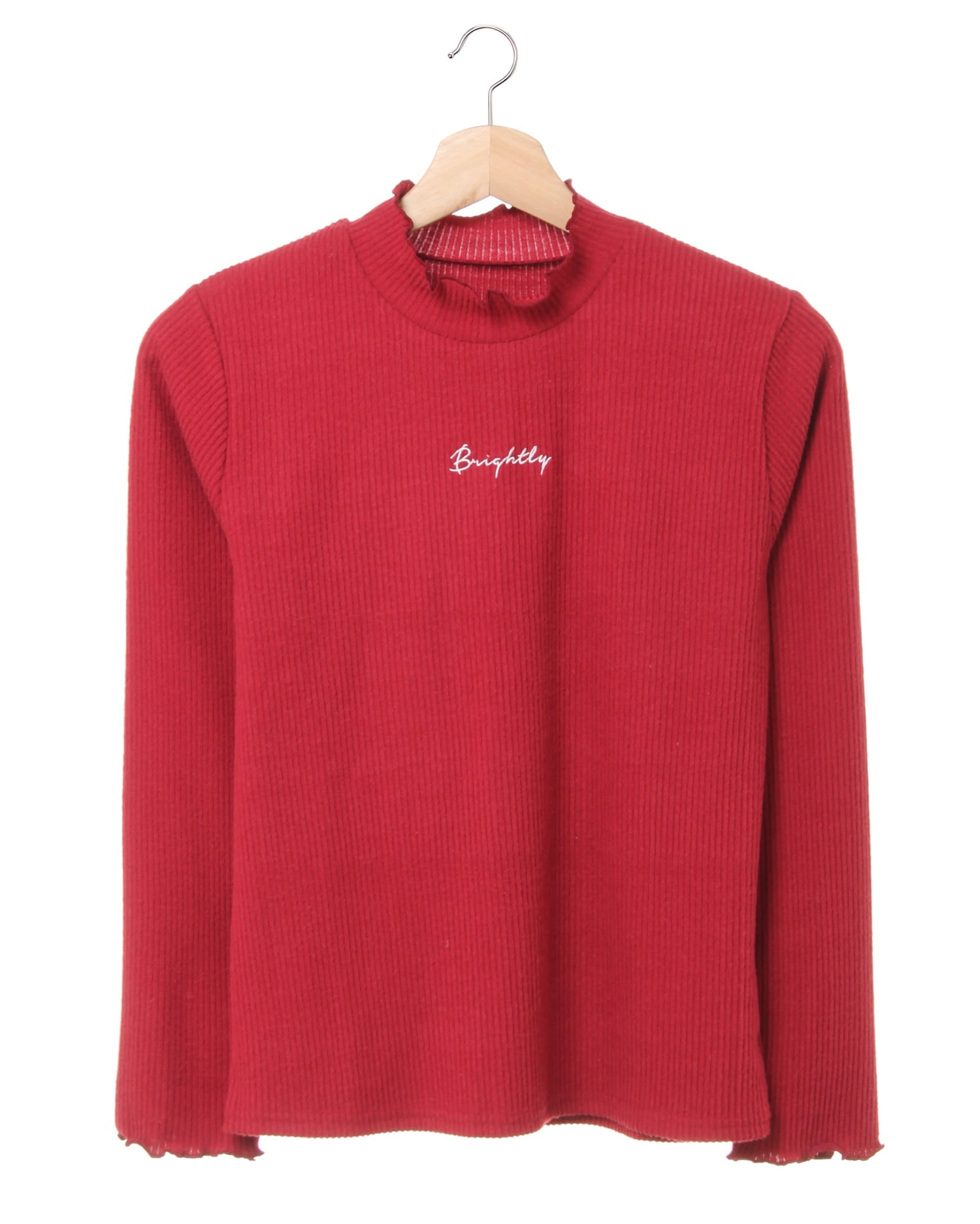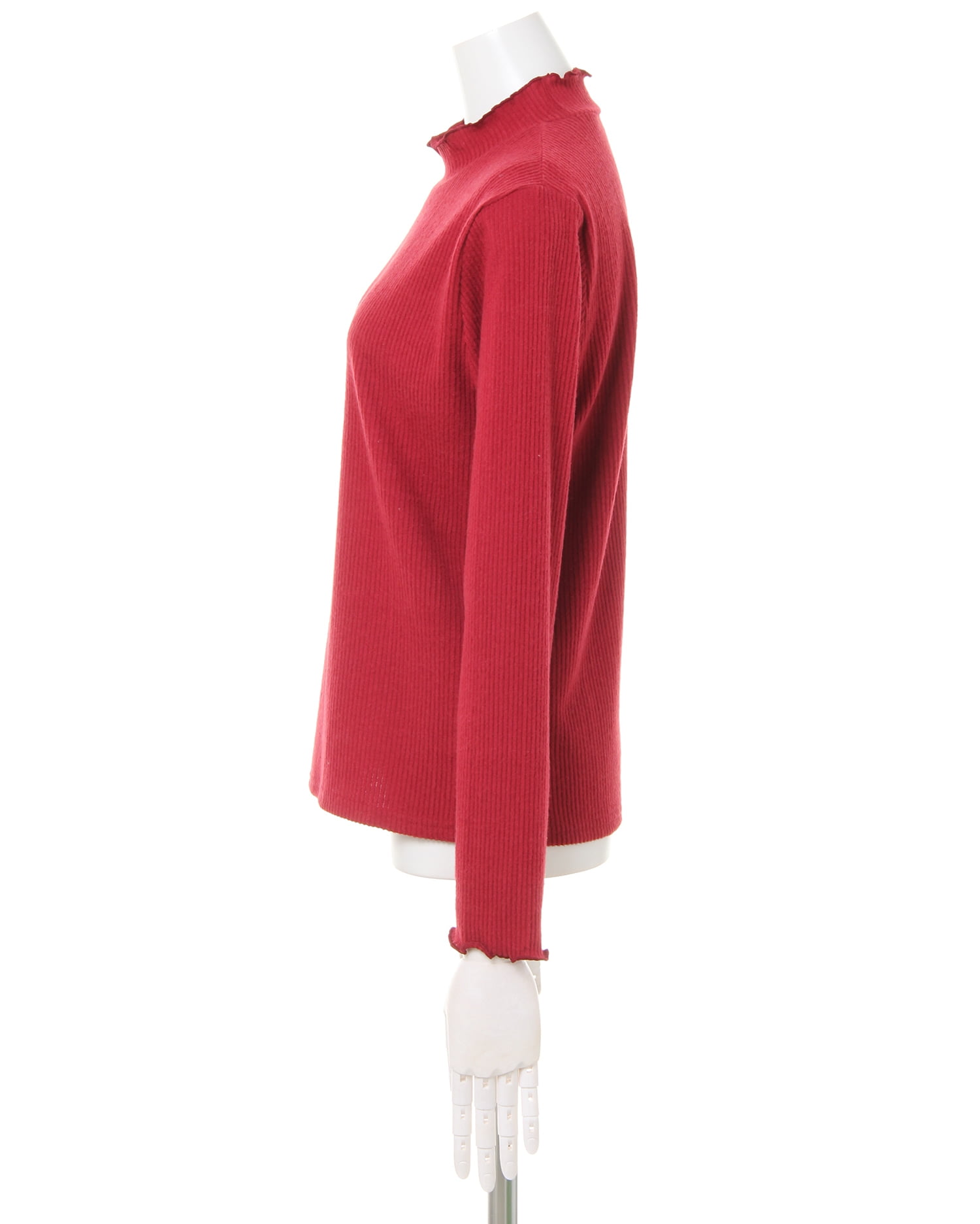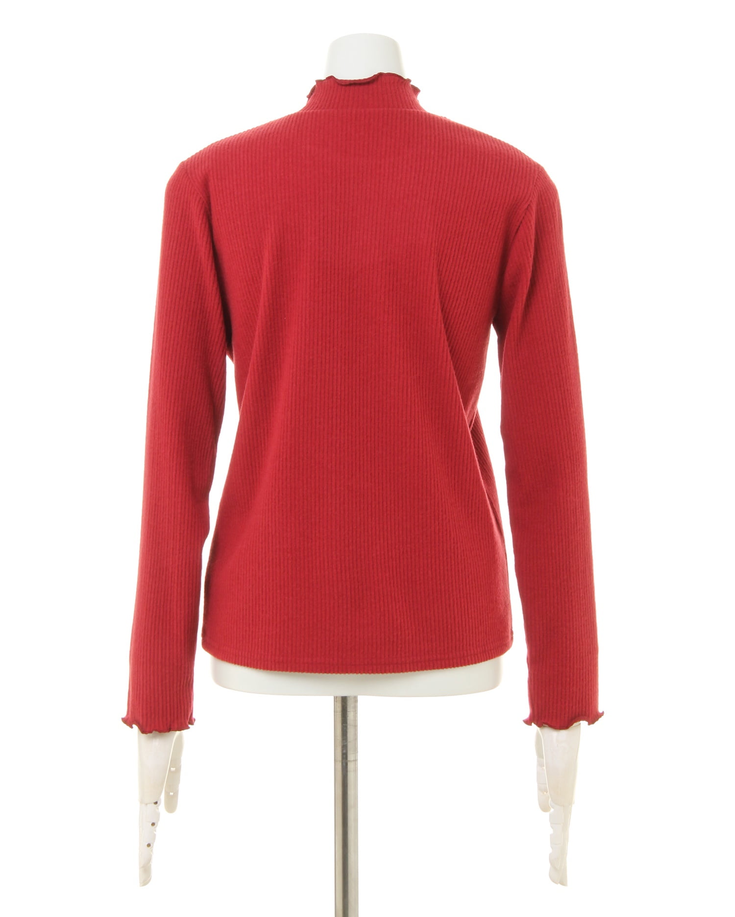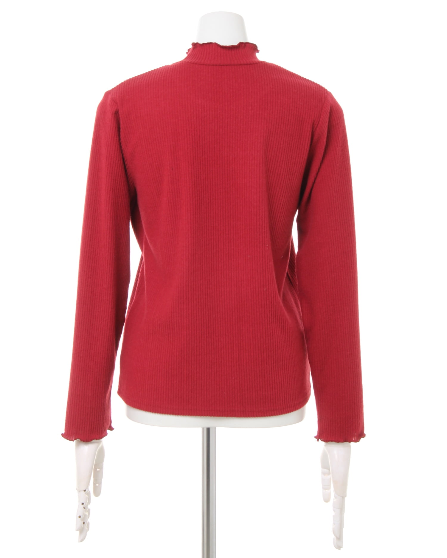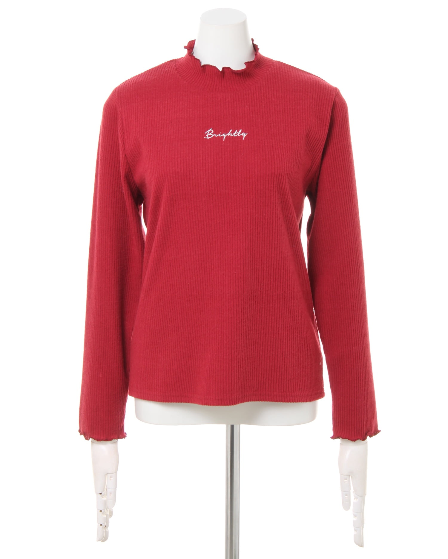 伸びのいい柔らかな素材で着心地抜群のベーシックなリブトップス。首元と袖部分のメローデザインがフェミニンな雰囲気をプラスします。細めの縦リブがボディラインにきれいにフィットし、女性らしいシルエットを演出。起毛仕様で暖かな仕上がりです。フロントのロゴがアクセントに。シンプルで合わせやすくデイリーに重宝する1枚は、程よい裾丈でインスタイルもすっきりキマります。