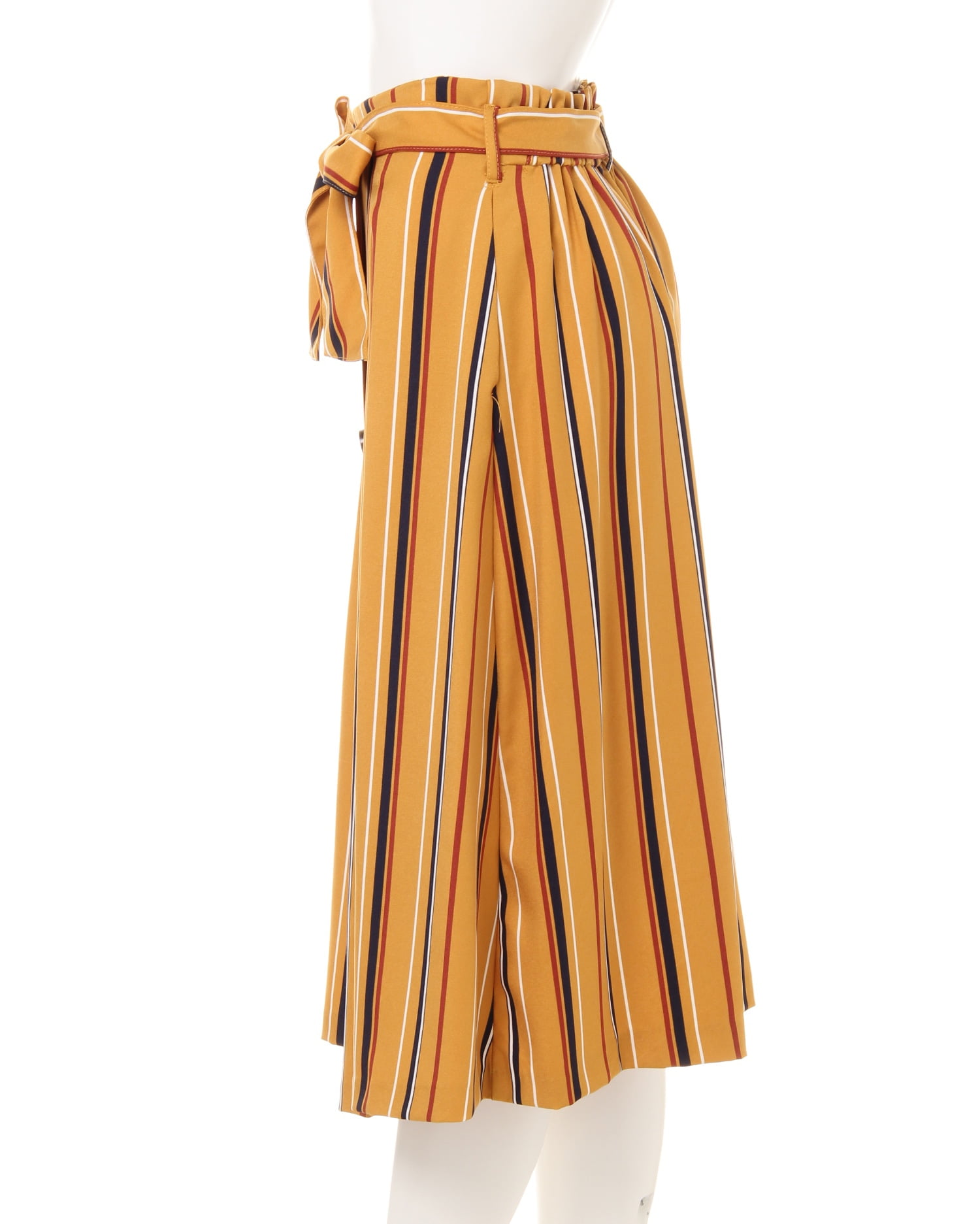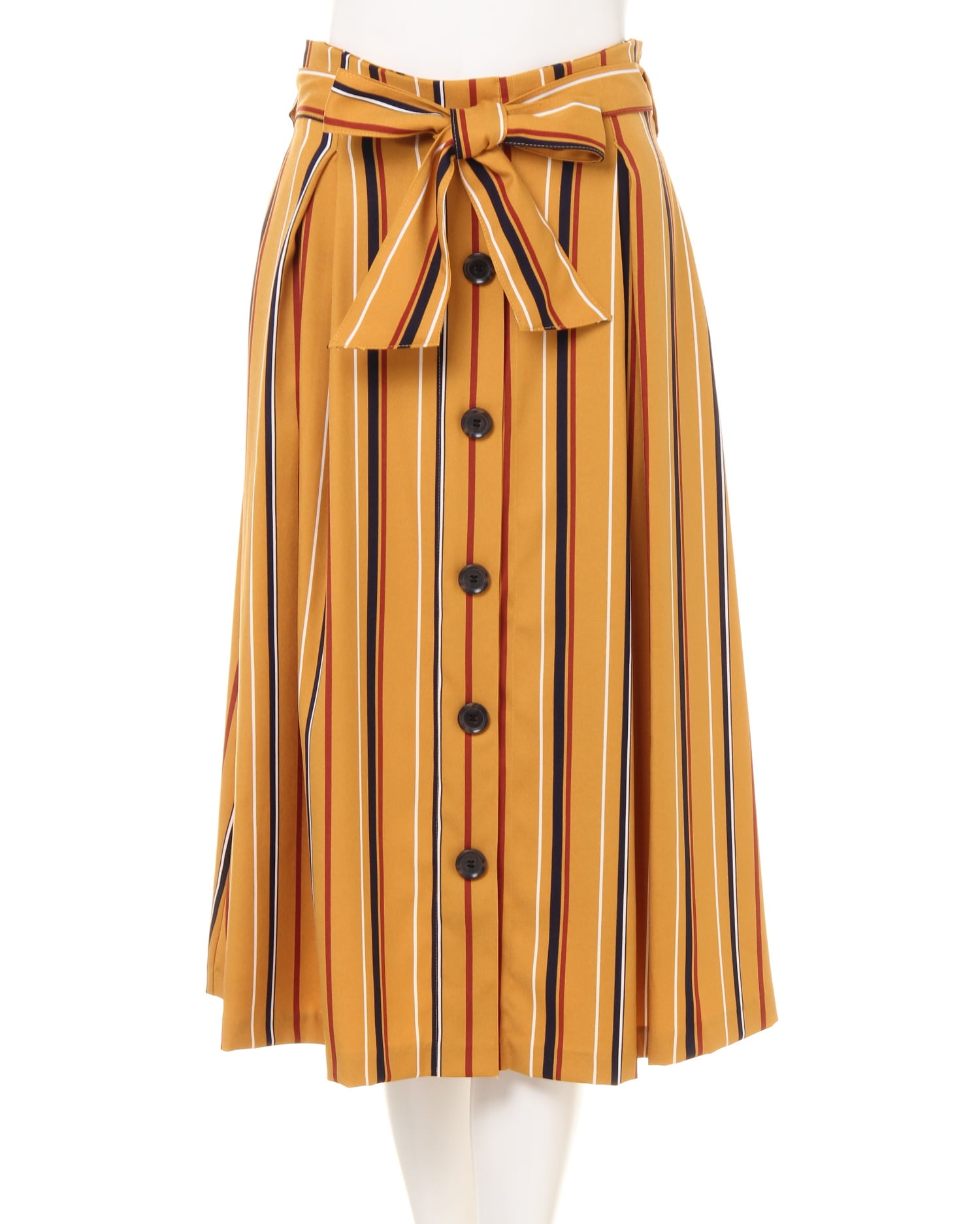 ふわりと揺れるフレアシルエットとフロントのボタンデザインがクラシカルな雰囲気のミディスカート。今季トレンドのマルチストライプ柄は、コーデに取り入れるだけで女性らしさを格上げしてくれます。光沢のある生地やタック使いが上品さをプラス。さらりとした素材は肌触り良く、柔らかで伸びもあるので足さばきも軽快です。ウエスト後ろ部分にはゴムが入っているので、着脱も楽チン。共布のサッシュベルトでウエストマークすればトップスインスタイルも決まります。