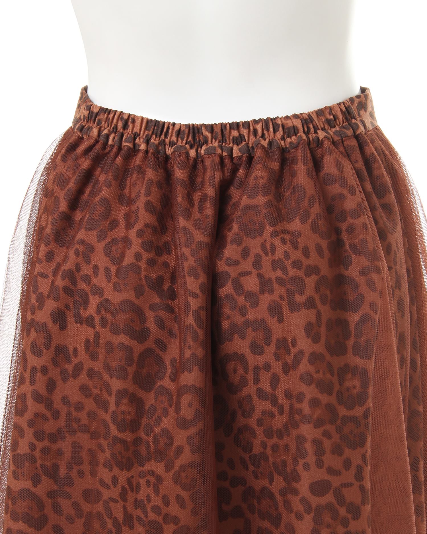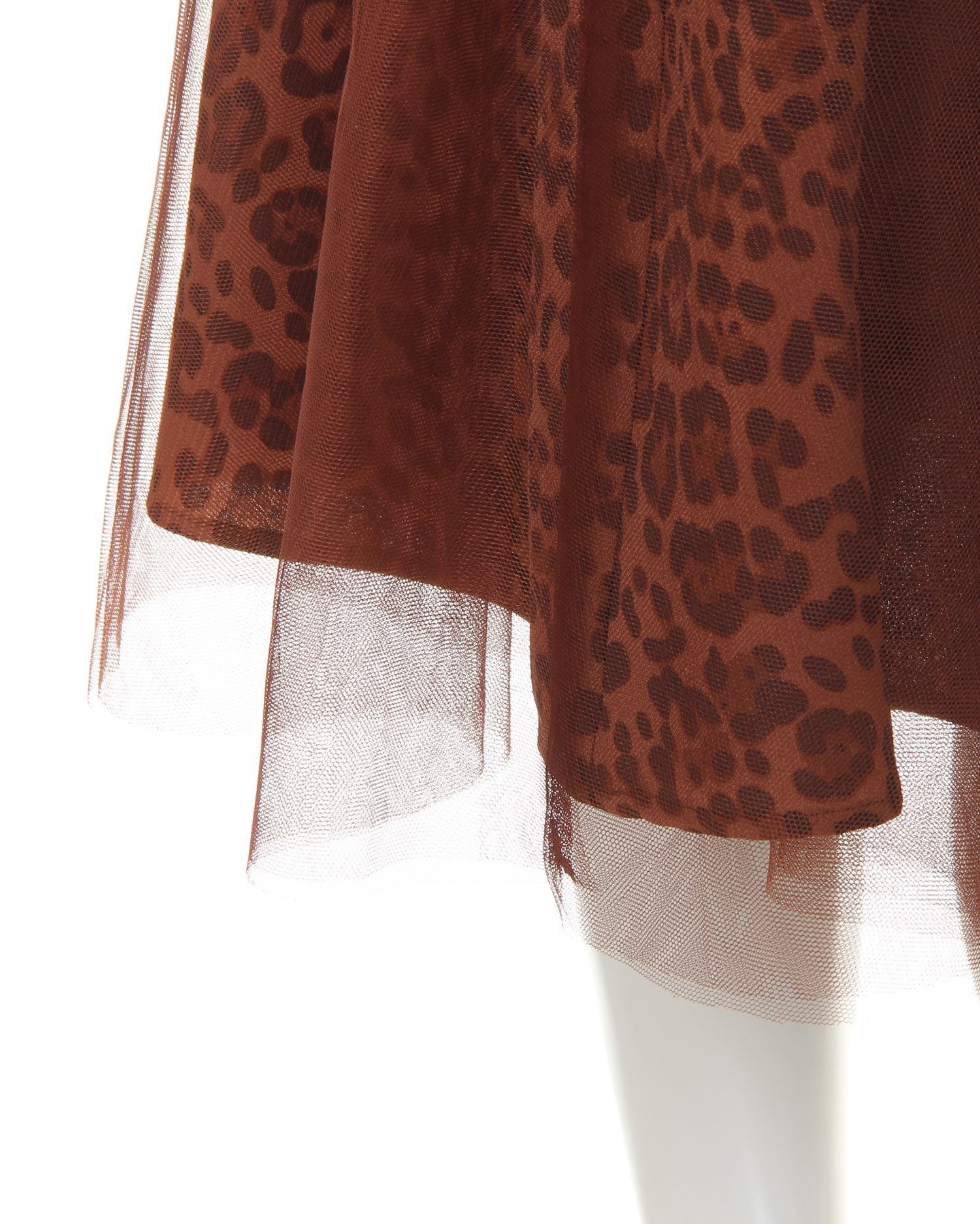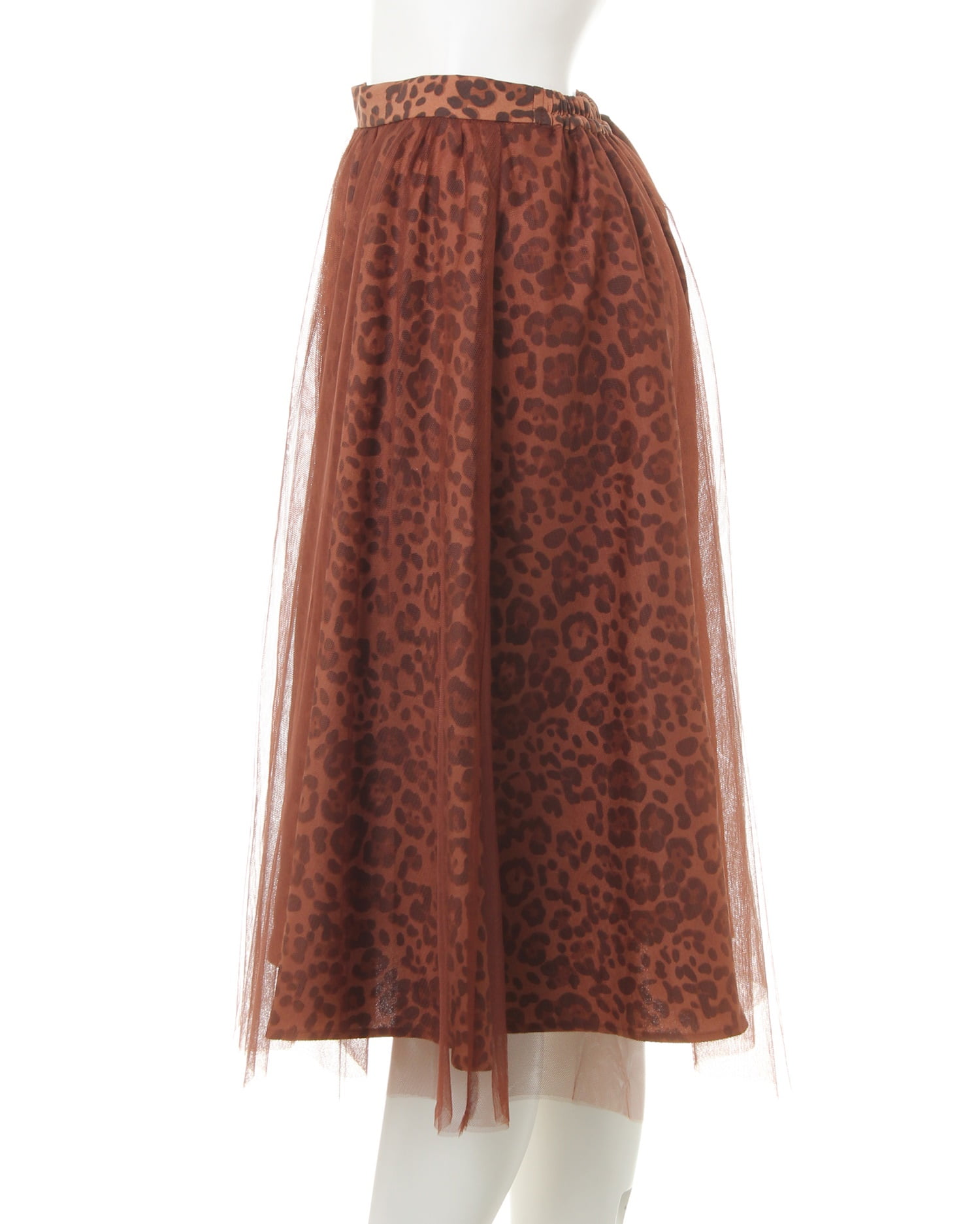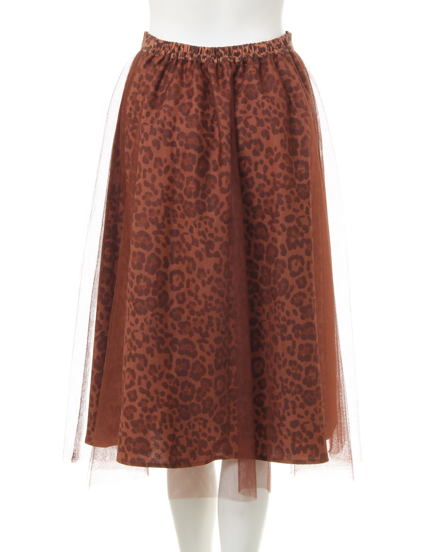 落ち着いたカラーのヒョウ柄スカートとチュールをドッキングさせた新鮮デザインのスカート。透け感のあるチュールとの組み合わせがエアリー感漂う、デザイン性の高い1枚です。ふんわりしたボリュームが体型を自然にカバーし、スタイルアップ効果も期待出来ます。ミディ丈は着こなしをバランス良くまとめてくれる優秀アイテム。ウエストは締め付けが少ないゴム仕様。着脱もスムーズです。