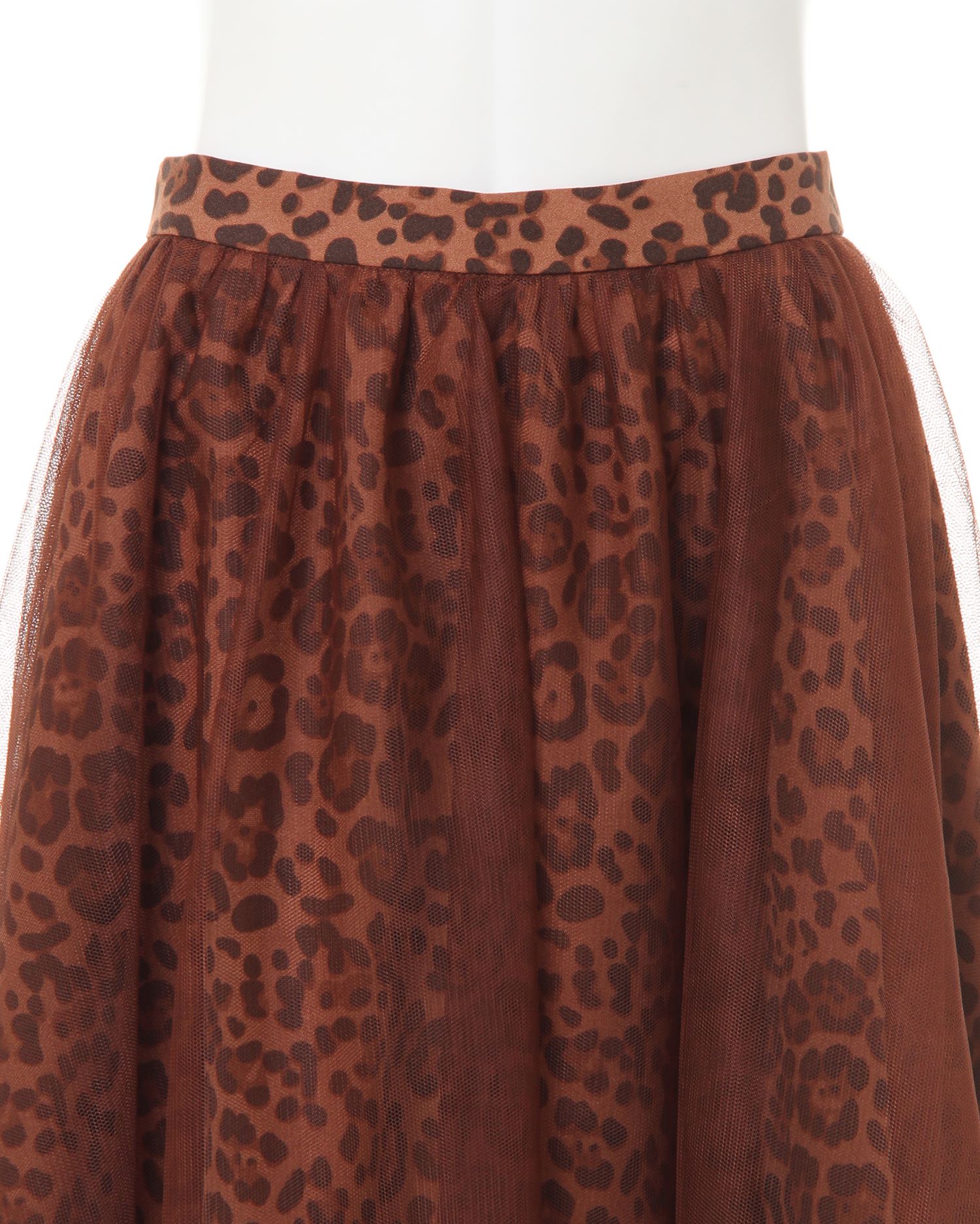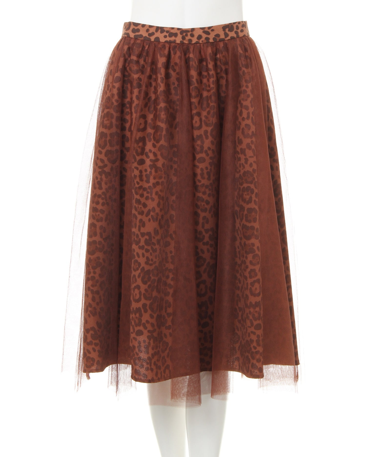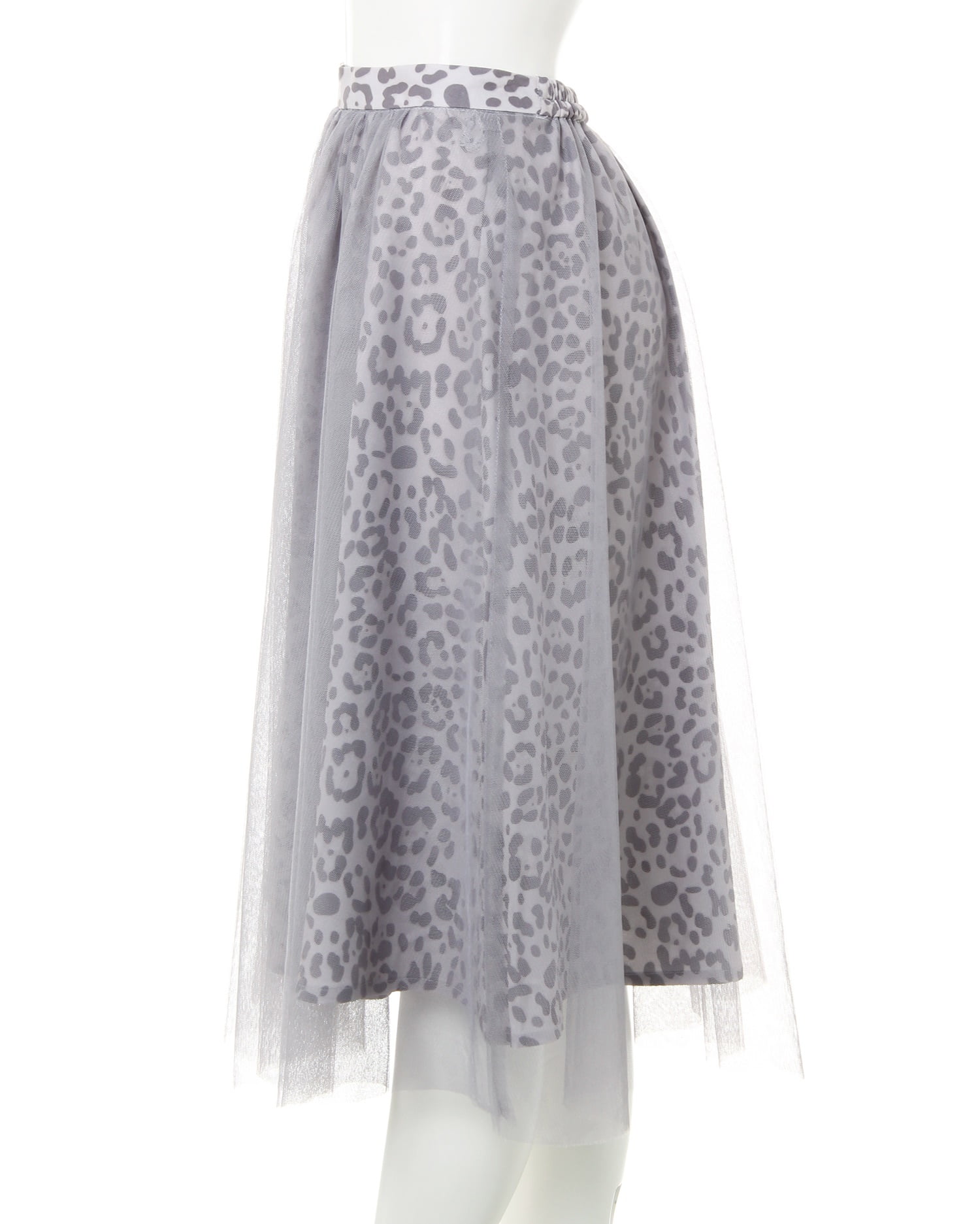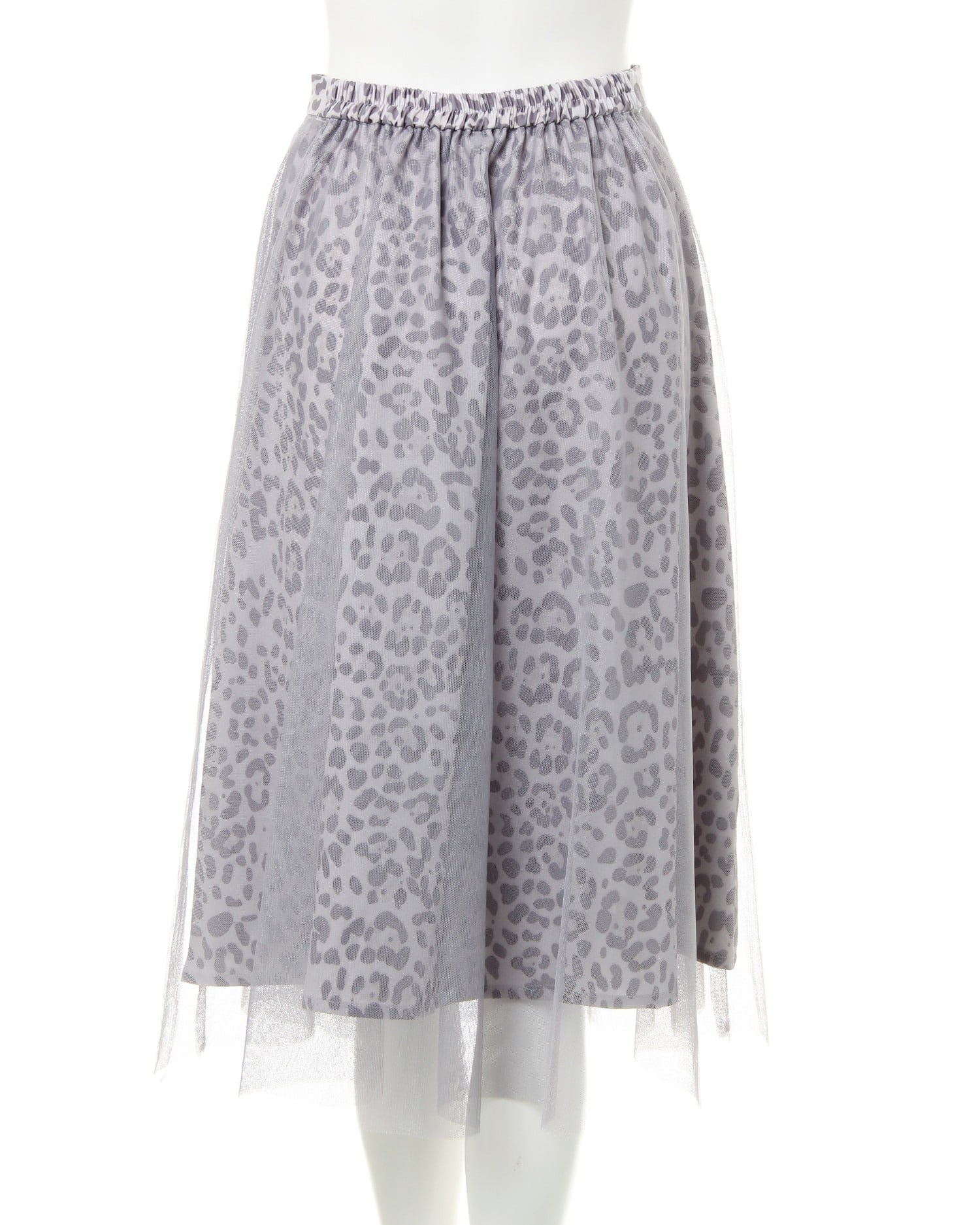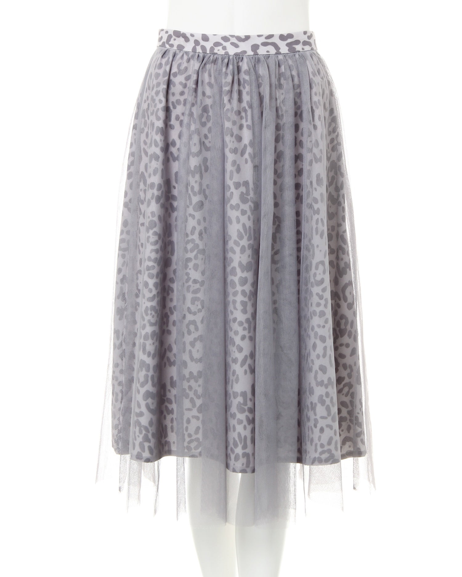 落ち着いたカラーのヒョウ柄スカートとチュールをドッキングさせた新鮮デザインのスカート。透け感のあるチュールとの組み合わせがエアリー感漂う、デザイン性の高い1枚です。ふんわりしたボリュームが体型を自然にカバーし、スタイルアップ効果も期待出来ます。ミディ丈は着こなしをバランス良くまとめてくれる優秀アイテム。ウエストは締め付けが少ないゴム仕様。着脱もスムーズです。