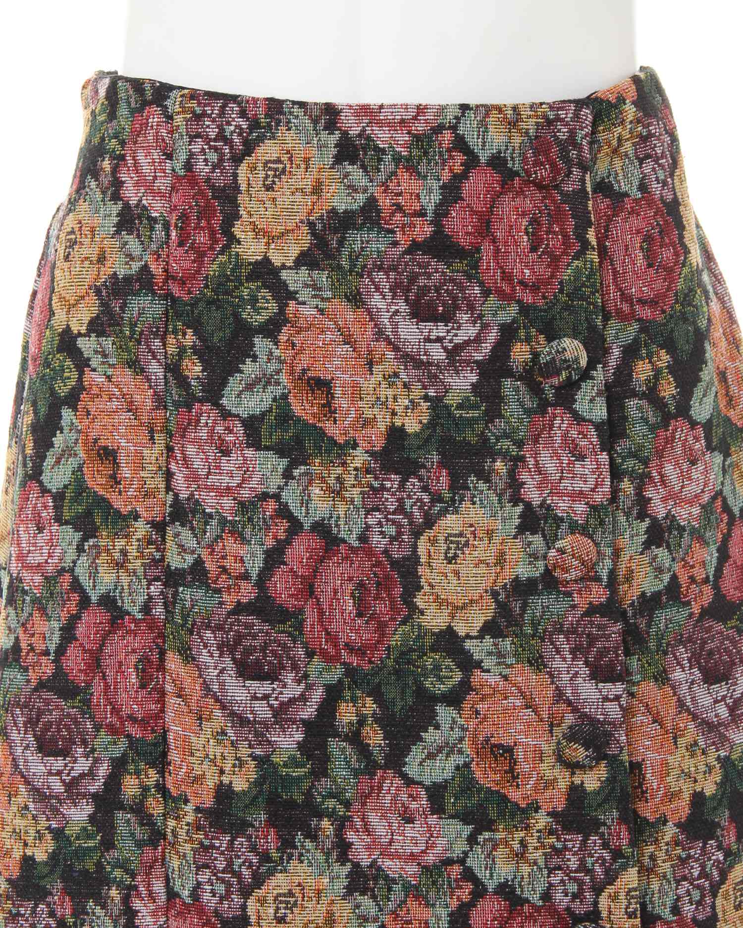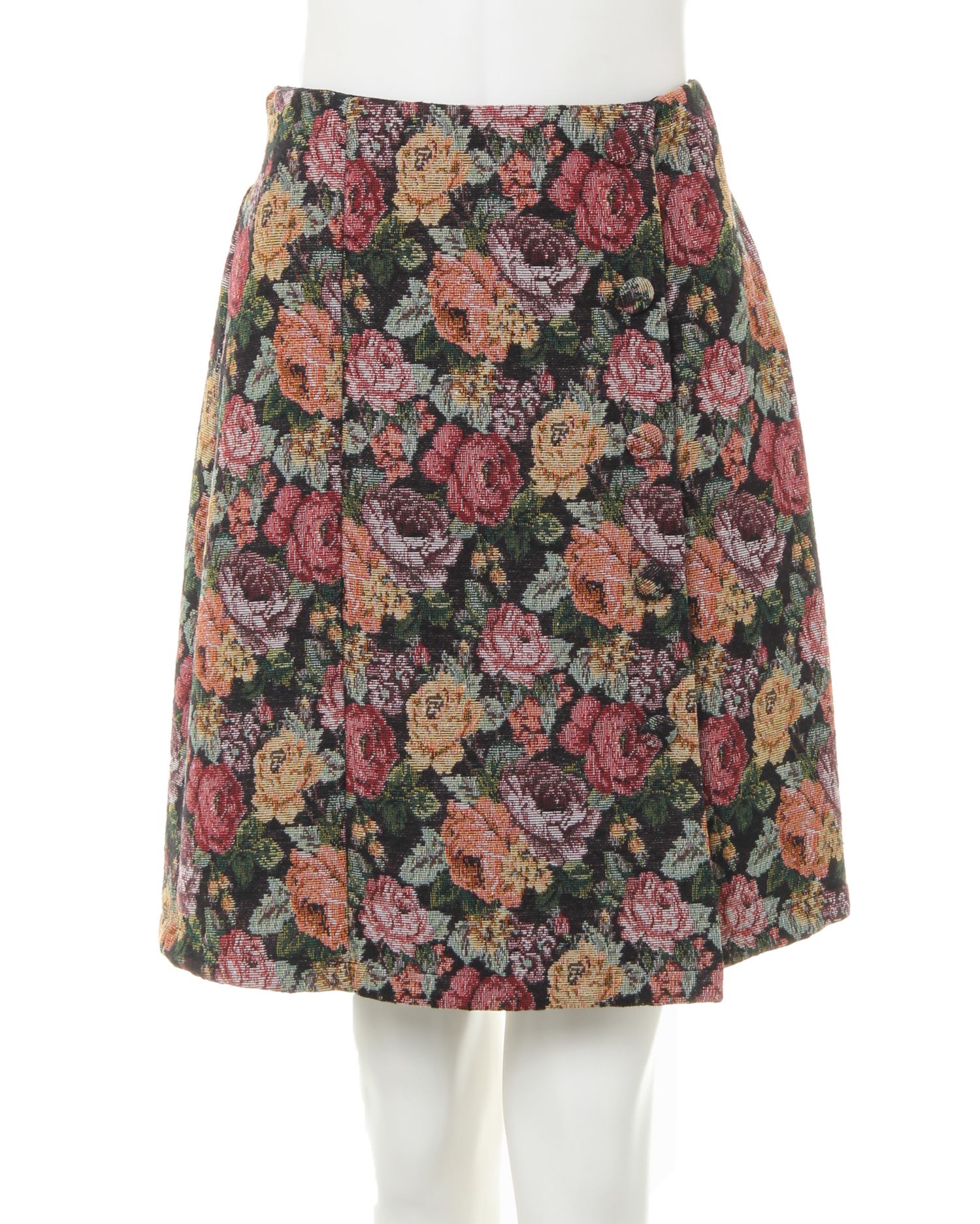 立体的なフラワーを大きく配置したゴブラン柄がコーデのアクセントになる台形スカート。裾にかけて程よく広がるシルエットで、レッグラインをきれいに見せてくれる効果も期待出来ます。どんなトップスとも好バランスで着こなしをまとめてくれるので、1枚あると重宝します。後ろウエストはゴム仕様なので着脱もスムーズ。滑らかな裏地付きで肌なじみが良く、穿き心地がいいのもポイントです。