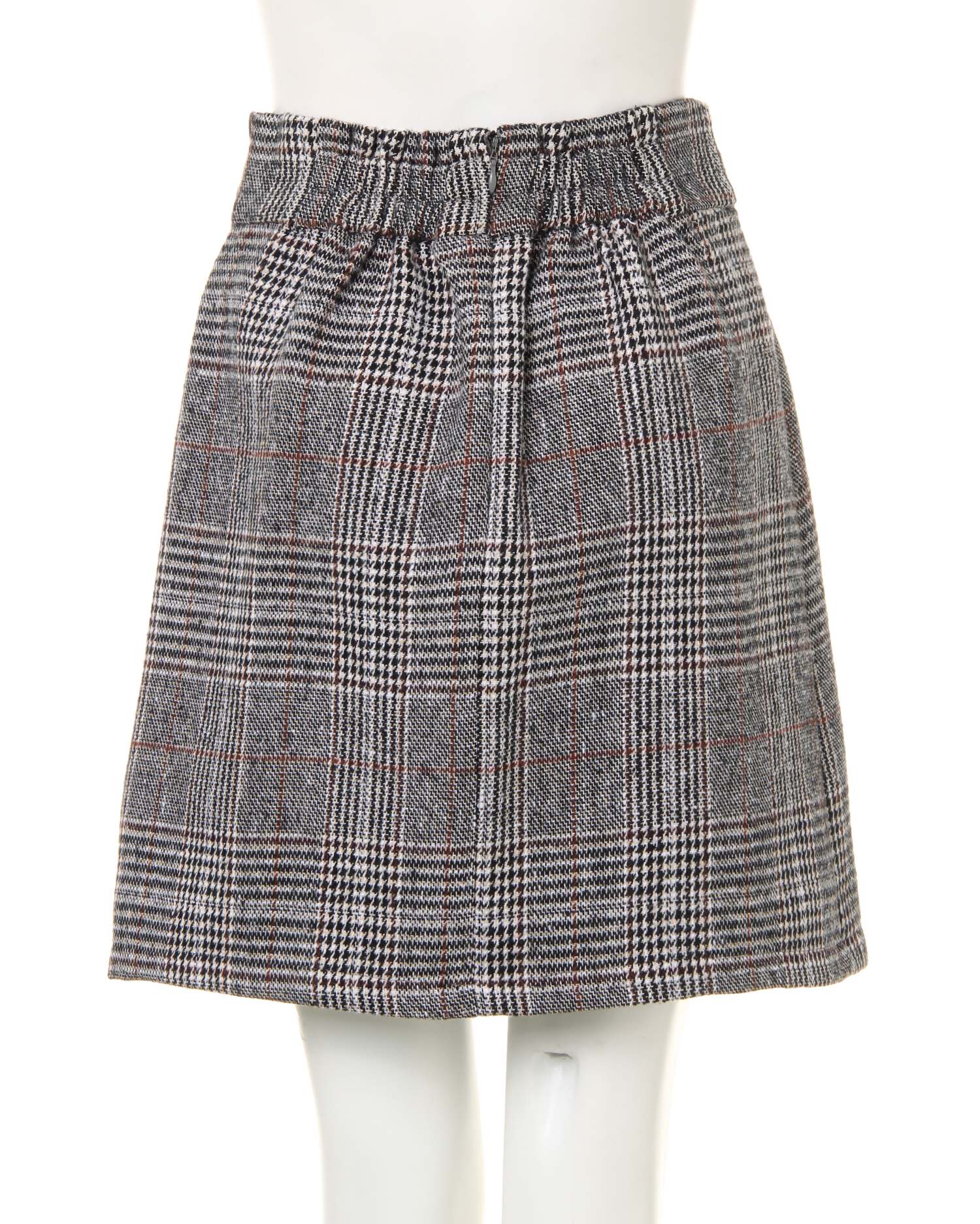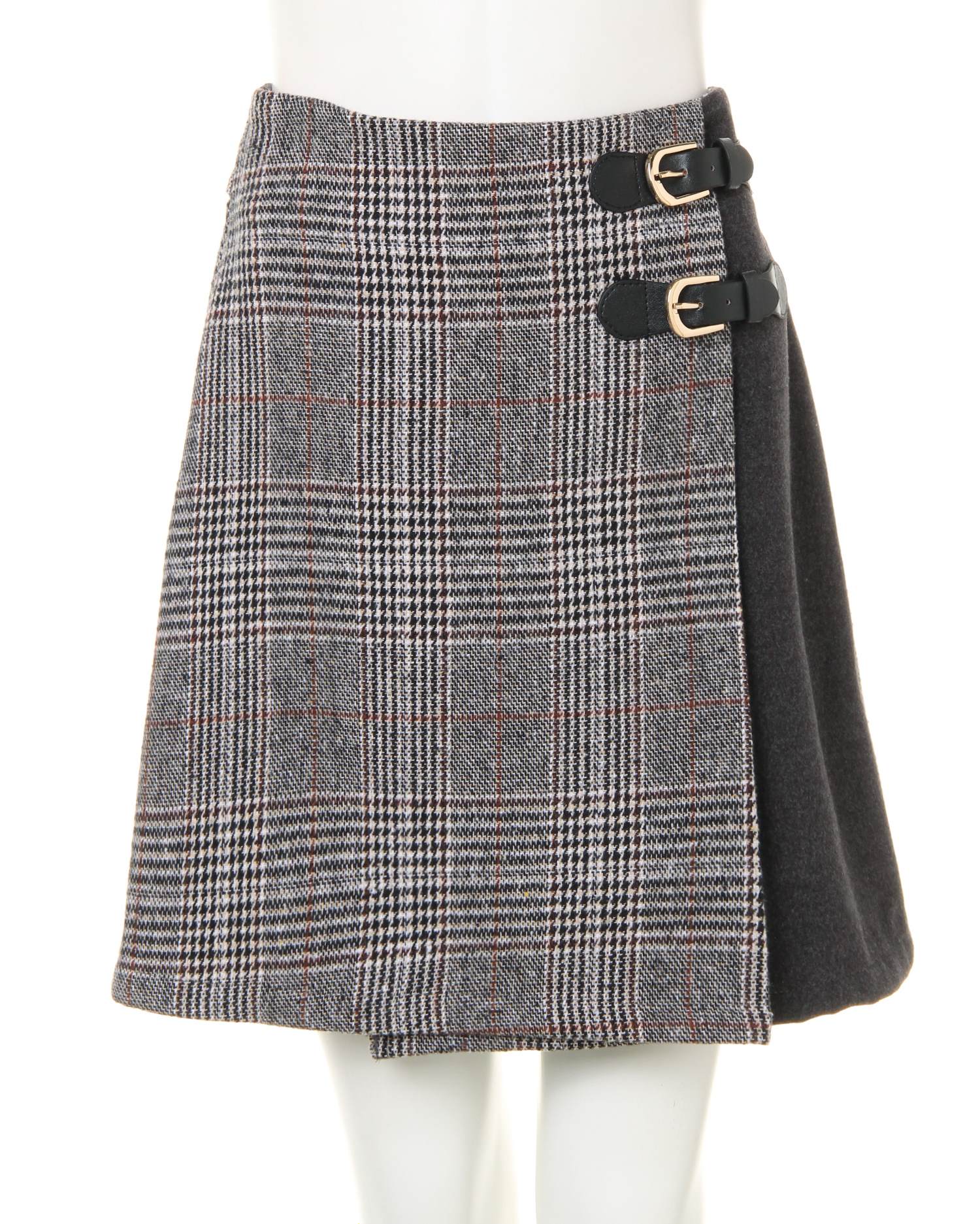 トラディショナルなグレンチェックと無地のカラーコントラストがスタイリッシュなスカートです。下半身をコンパクトに見せてくれる台形シルエットでデザイン性だけでなく、スタイルアップ効果も◎。フロントサイドにあしらったベルトがアクセントになっています。巻きスカートのようなデザインは動くたびに表情があり、こなれ感のある着こなしに。