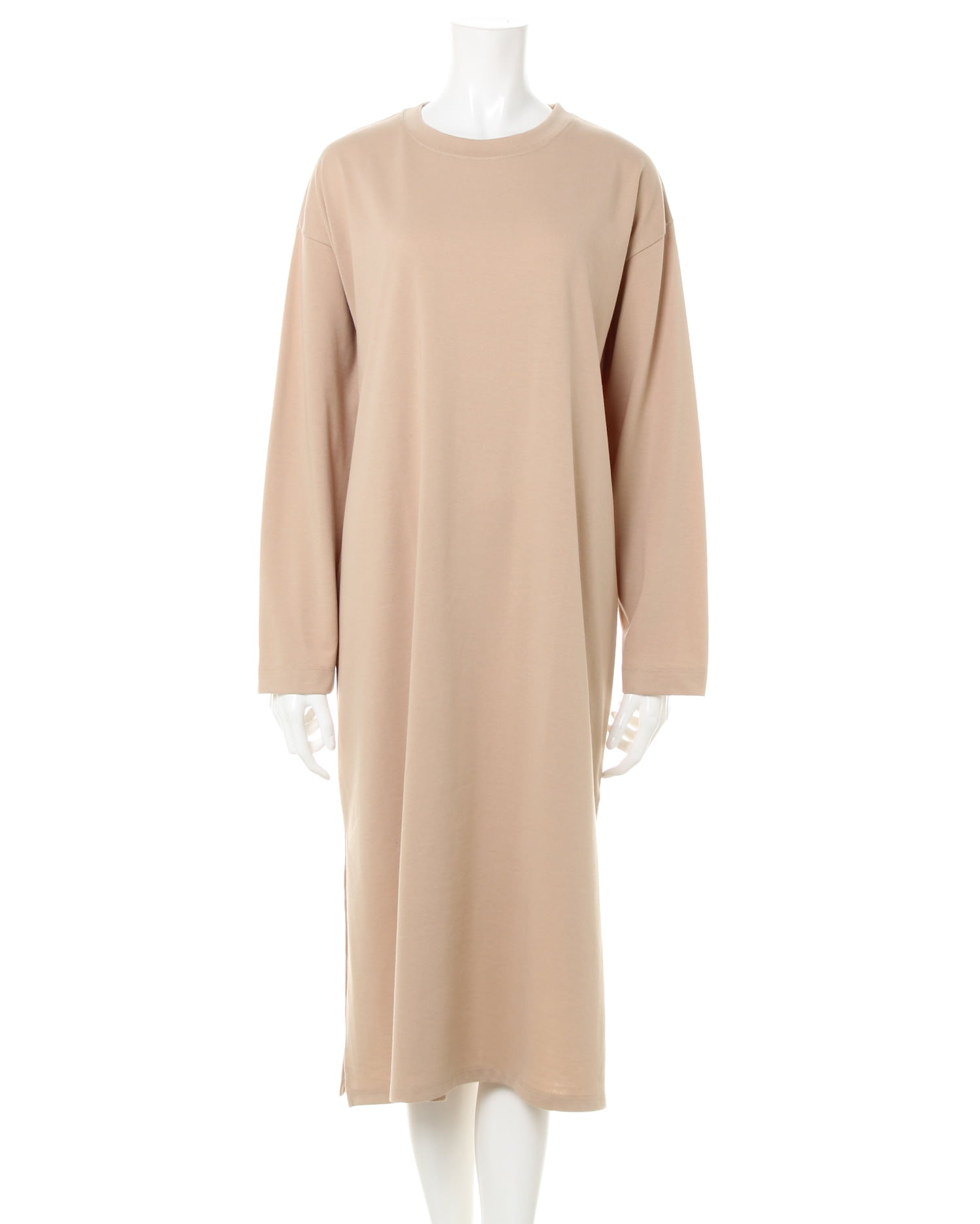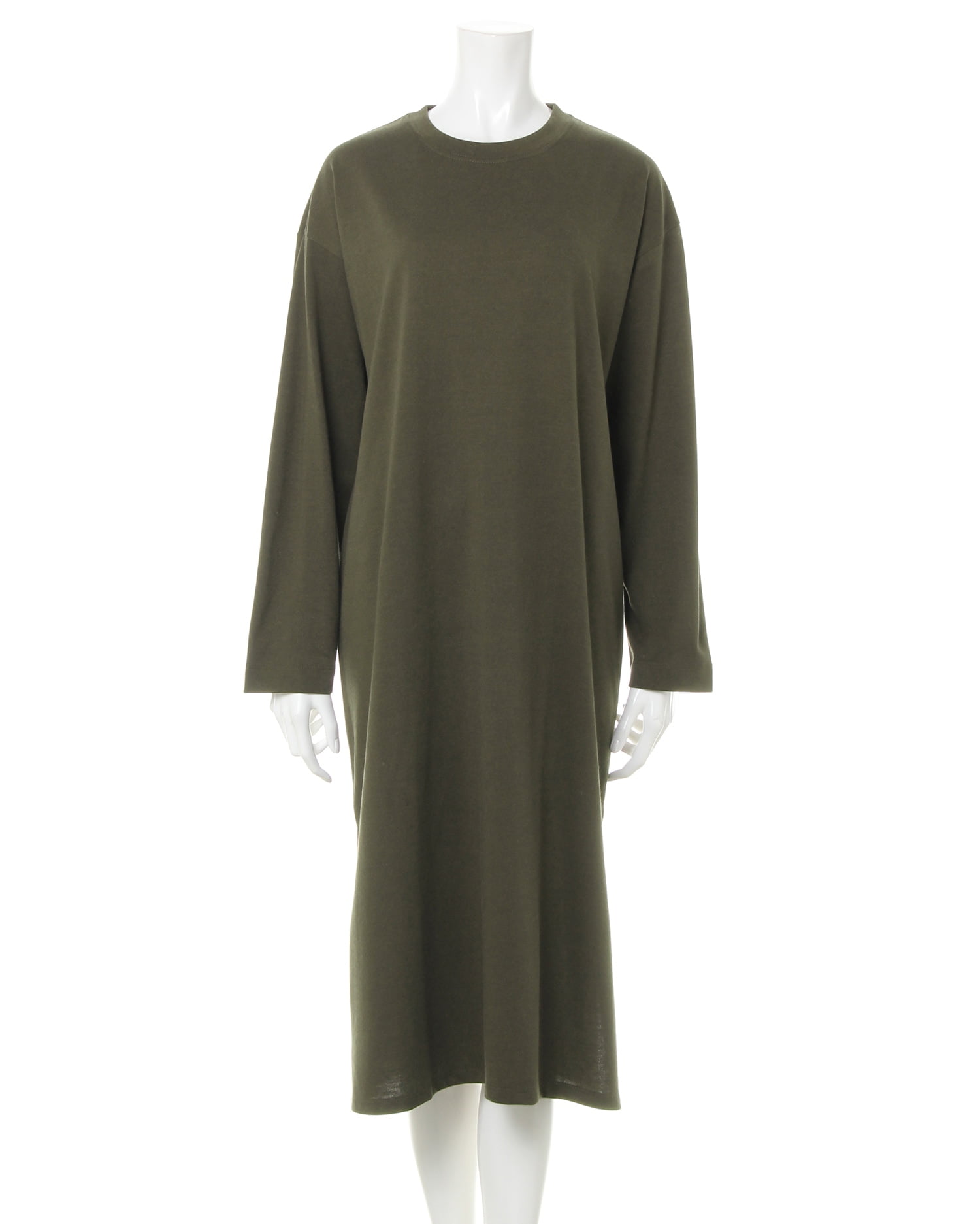 着るだけでリラックスしたカジュアルスタイルが完成するワンピース。肉厚のカットソー生地で仕立てているのでシーズン長く着回せます。ベーシックなクルーネックとルーズなシルエットが魅力。程よいゆとりの身頃は、シャツなどを合わせた着こなしも可能です。軽やかに広がる裾のドレープがフェミニン。裾サイドにはスリットを入れているので、すっきり見えるのもポイントです。