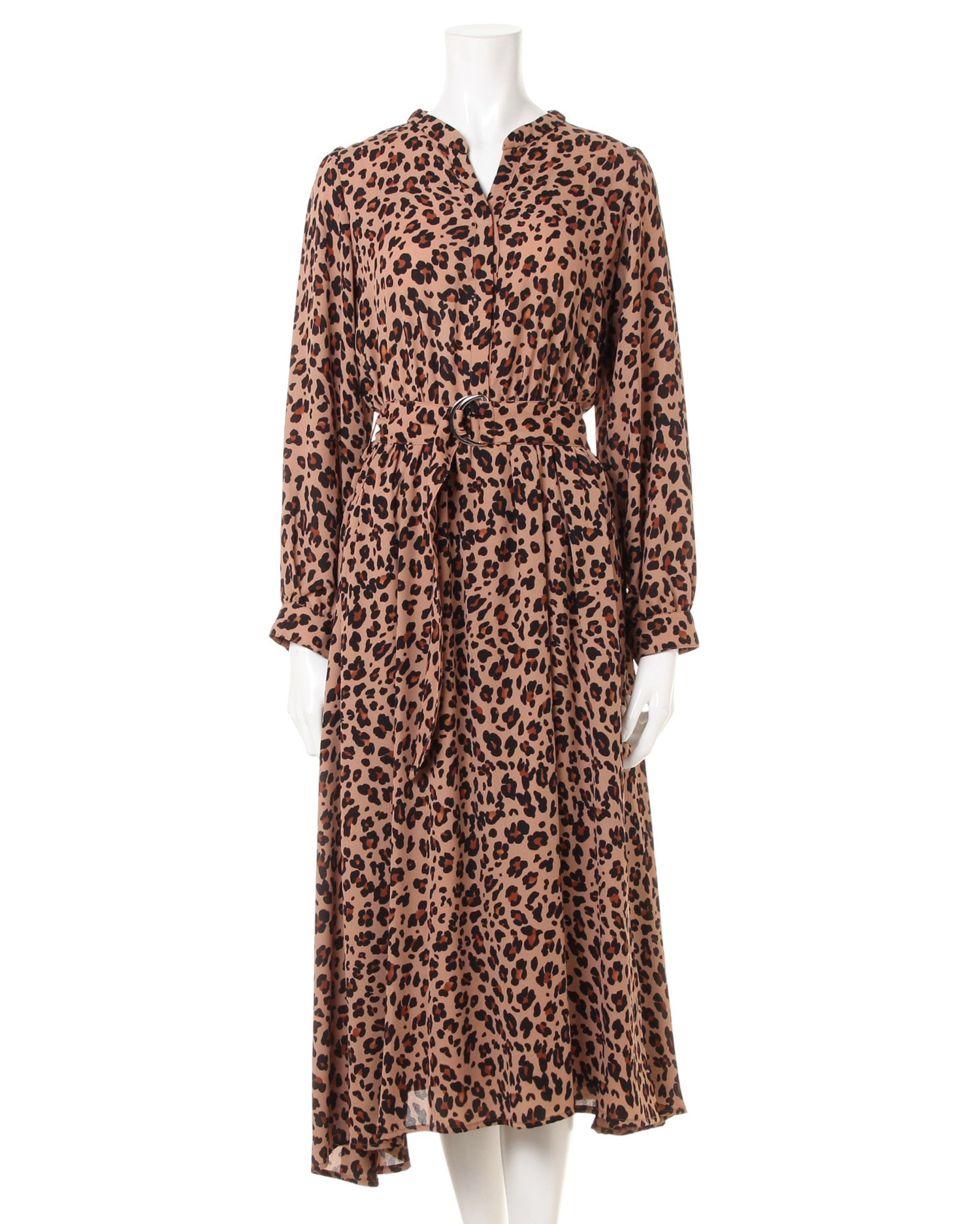 存在感たっぷりのヒョウ柄ワンピースは、トーンダウンしがちなコーデのアクセントにもなる万能な1枚。ノーカラーの襟元がナチュラルな抜け感をプラス。ふんわり揺れる軽やかなフレアシルエットがフェミニンな雰囲気を演出します。付属のサッシュベルトで締めればメリハリスタイルの完成。パンプスやショートブーツなど様々なアイテムともバランス良く合わせられるひと品です。