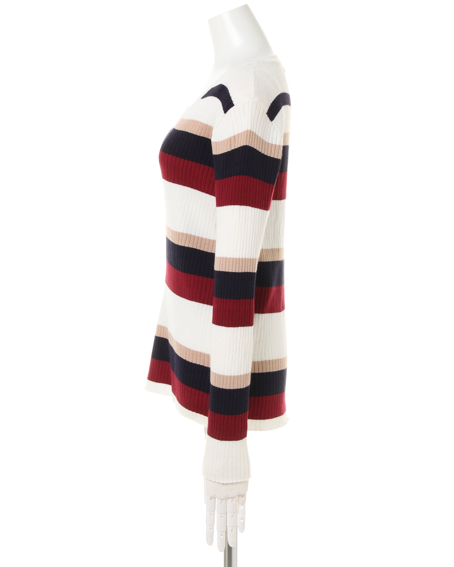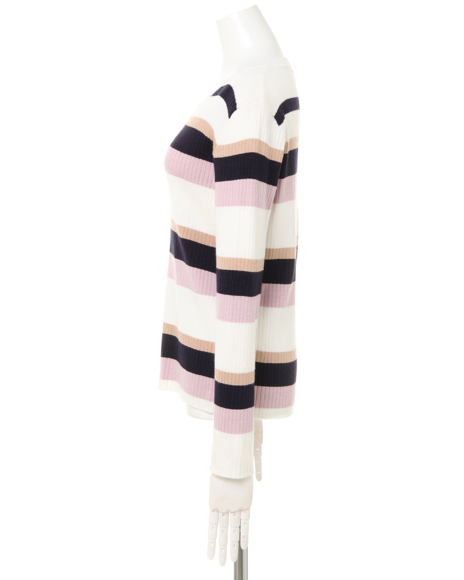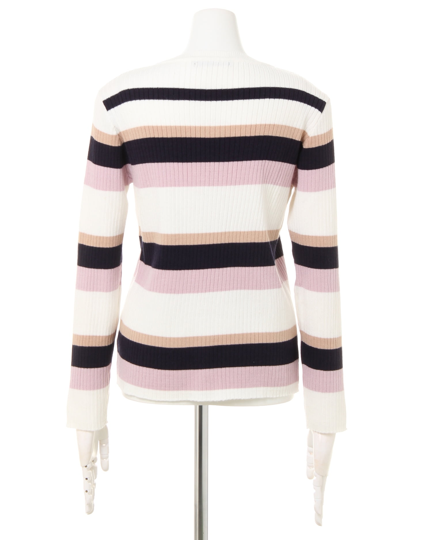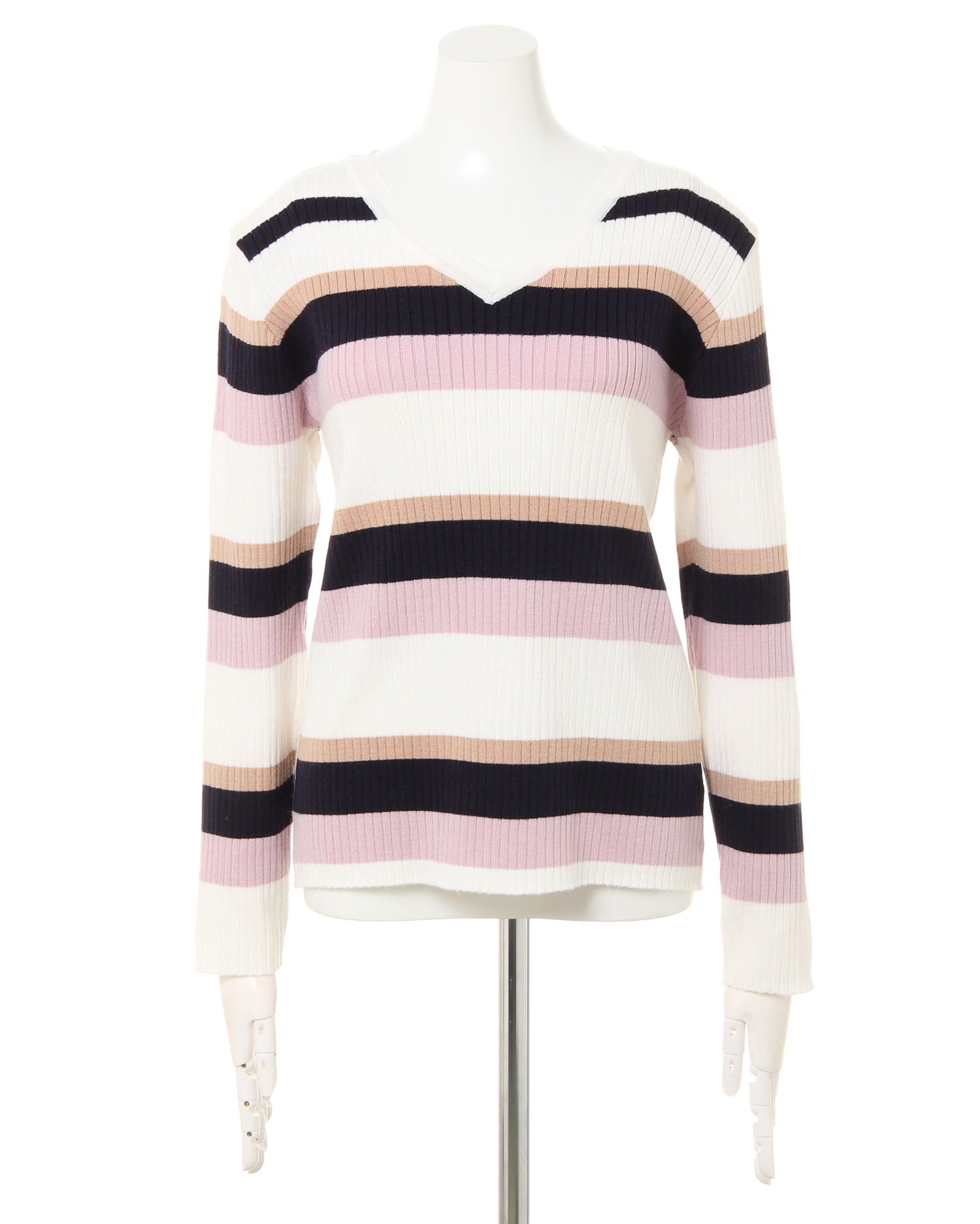 着るだけで大人カジュアルの装いに導いてくれるマルチボーダーニットです。ピッチの異なる配色デザインが表情豊かな1枚。すっきりと開いたVネックがデコルテラインをきれいに見せ、顔周りを明るくします。伸びが良く柔らかな縦リブ素材がボディラインに沿い、コンパクトなシルエットに。自然とスタイルアップ効果も狙えます。ジャケットなどのレイヤー使いや1枚で主役級の着こなしも◎。デイリーに活躍してくれる優秀アイテムです。