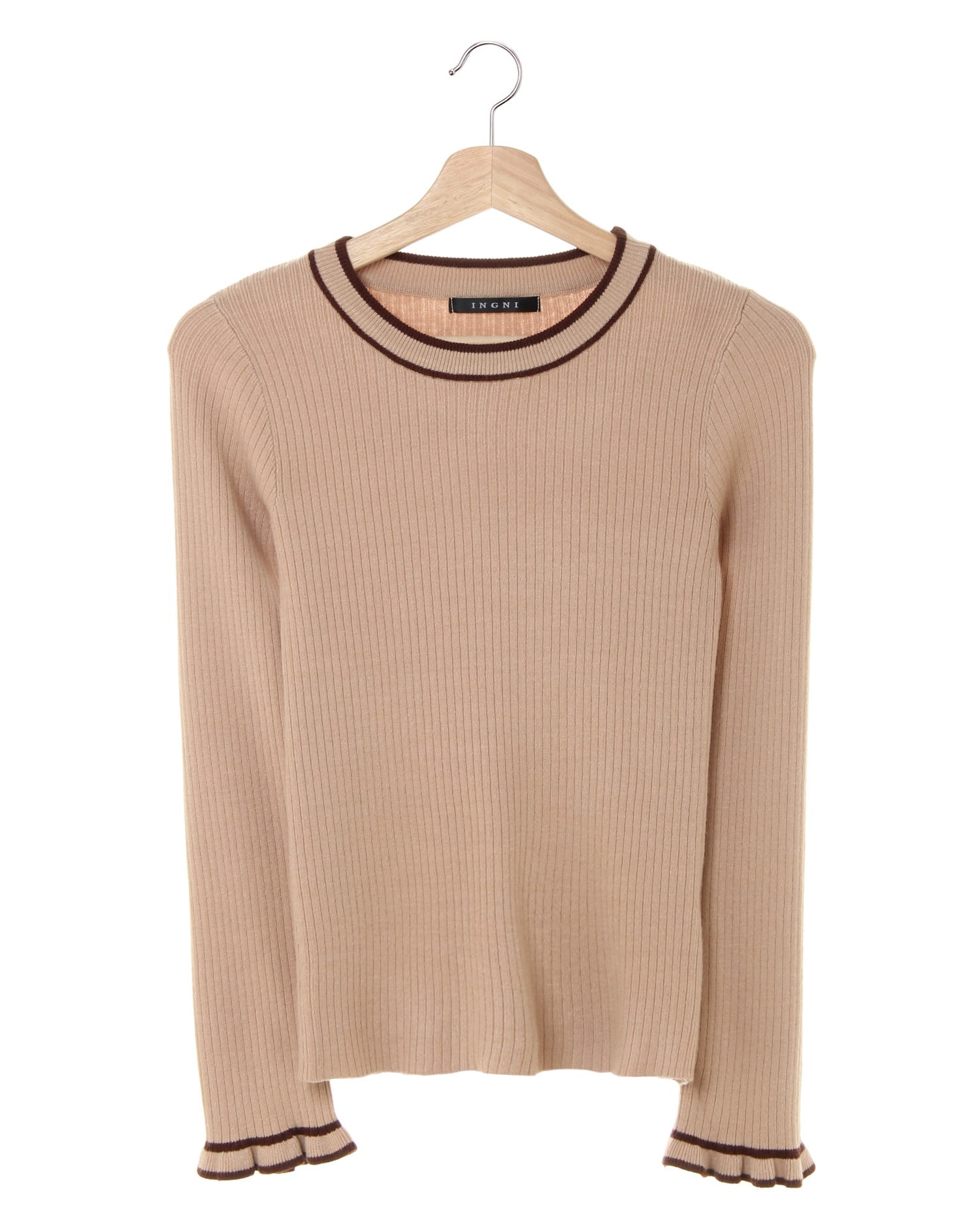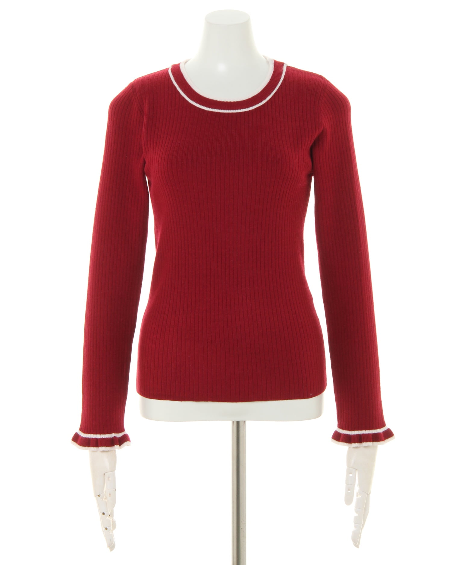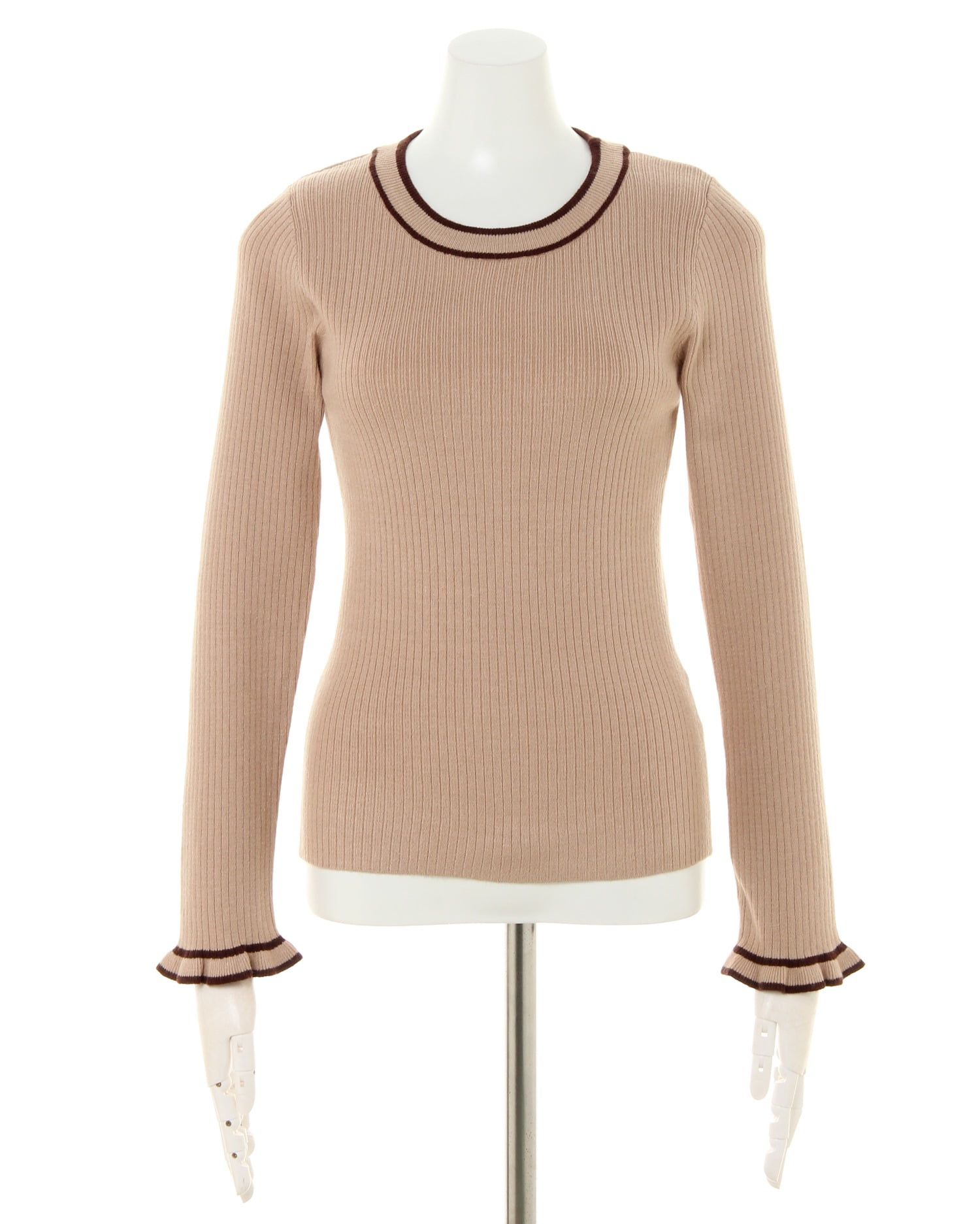 コンパクトなシルエットでバランス良く着こなせる薄手のニット。首元と袖口にあしらったライン使いがスタイリッシュなアクセントになっています。ボディに沿うラインで、インスタイルにもオススメ。袖口はフェミニンなフリルになっています。シンプルながらも上品な印象のアイテムは、オンオフ問わずに活躍。デイリーに1枚は欲しい万能アイテムです。