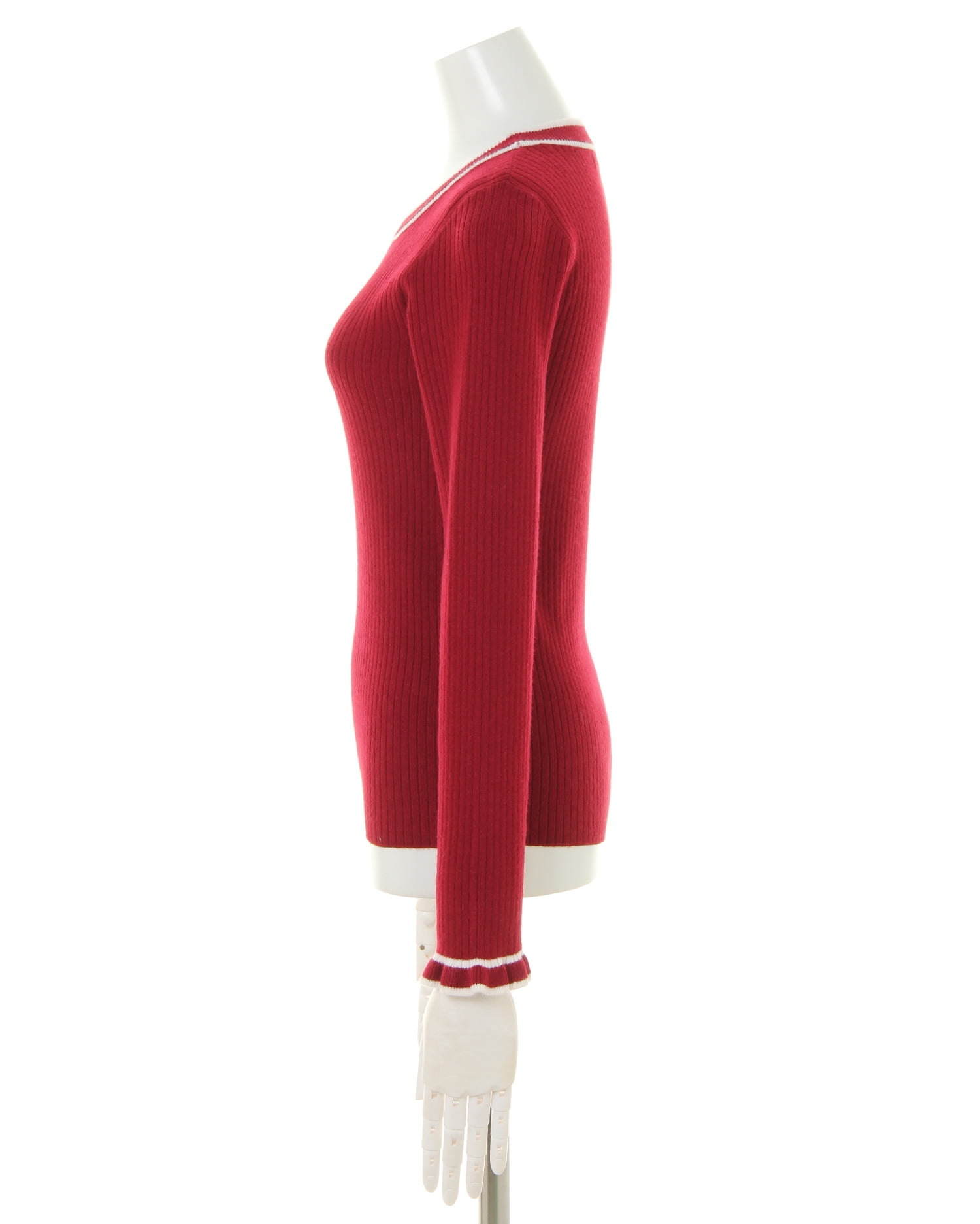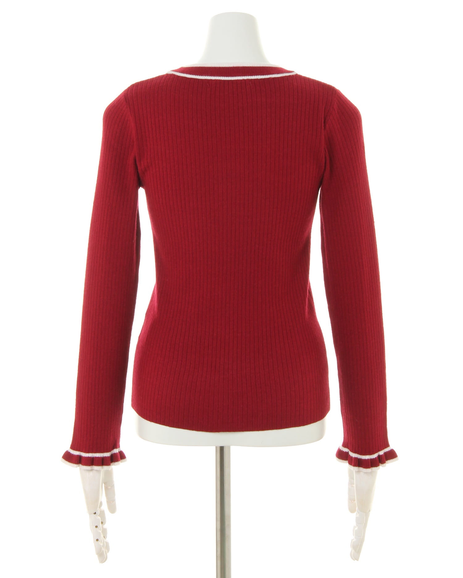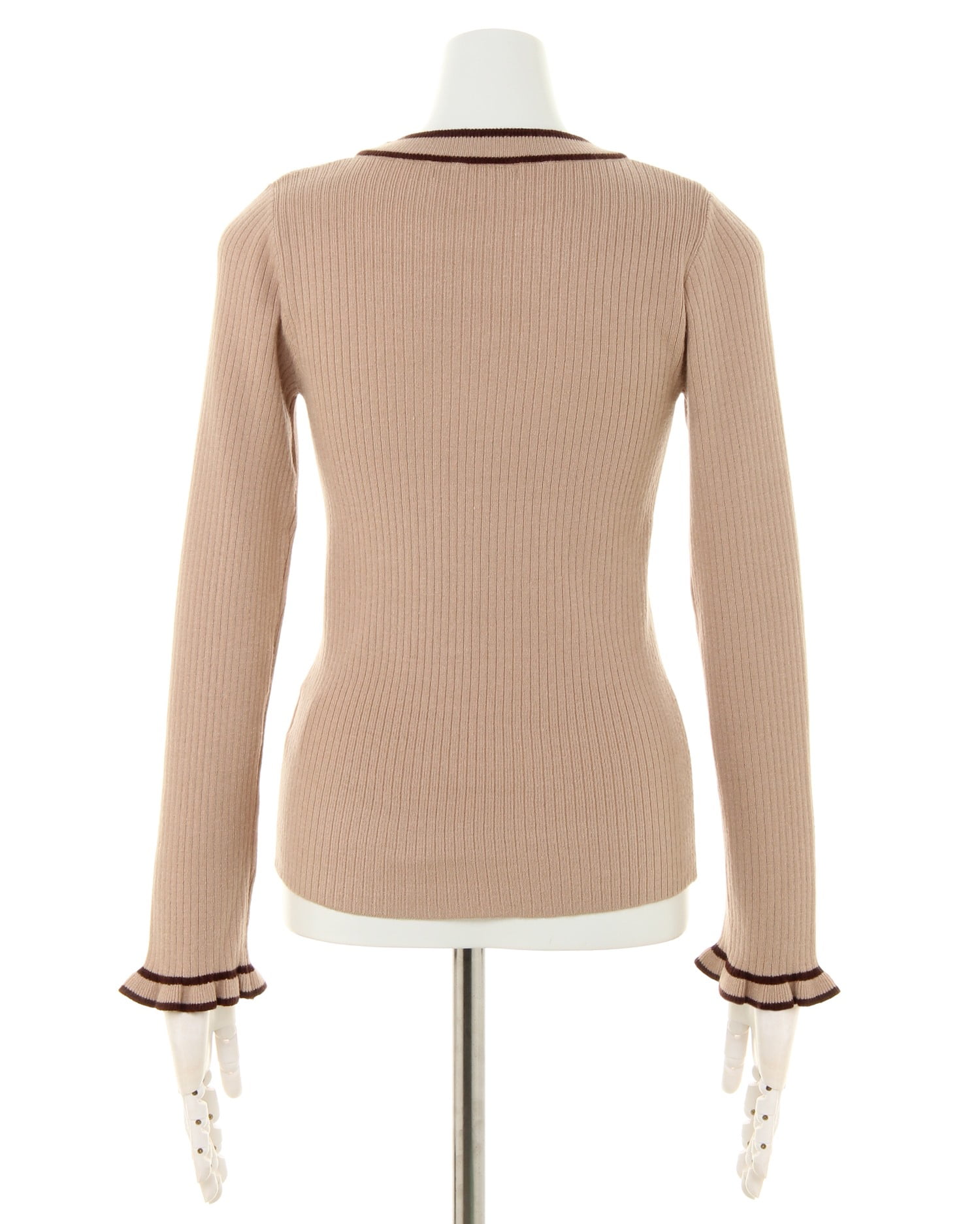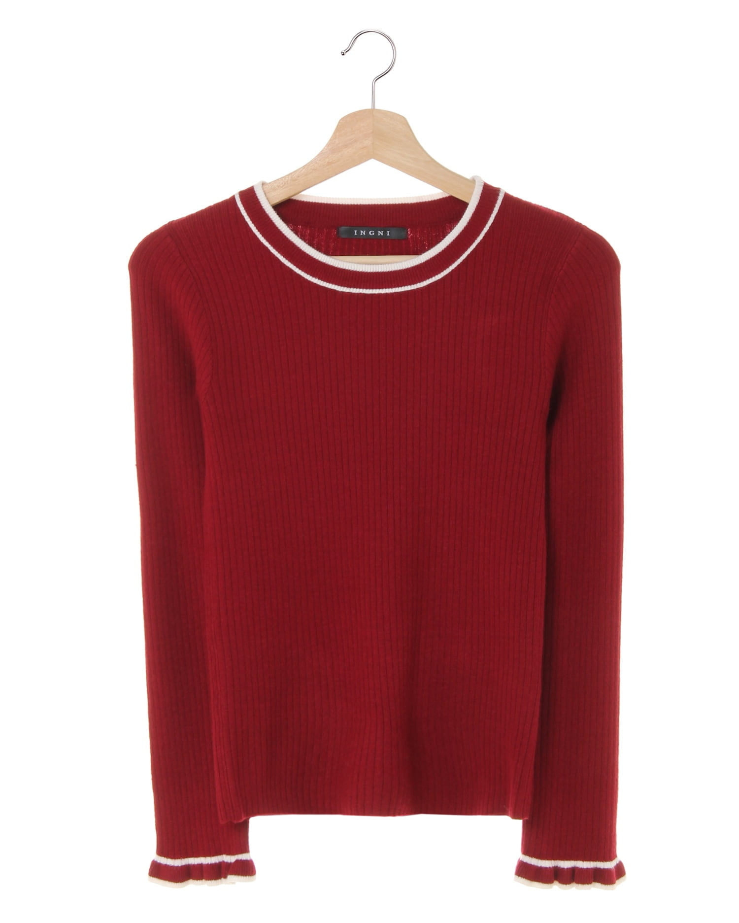 コンパクトなシルエットでバランス良く着こなせる薄手のニット。首元と袖口にあしらったライン使いがスタイリッシュなアクセントになっています。ボディに沿うラインで、インスタイルにもオススメ。袖口はフェミニンなフリルになっています。シンプルながらも上品な印象のアイテムは、オンオフ問わずに活躍。デイリーに1枚は欲しい万能アイテムです。