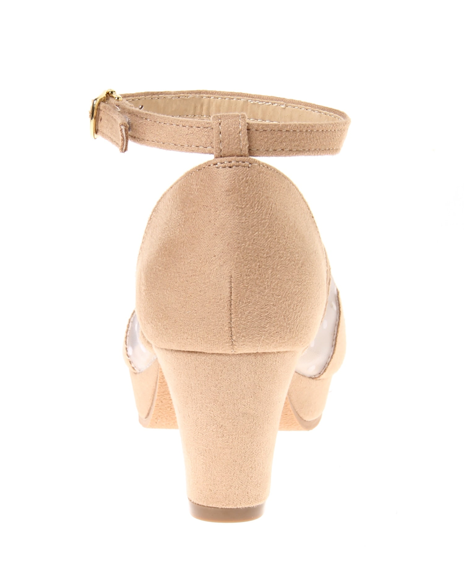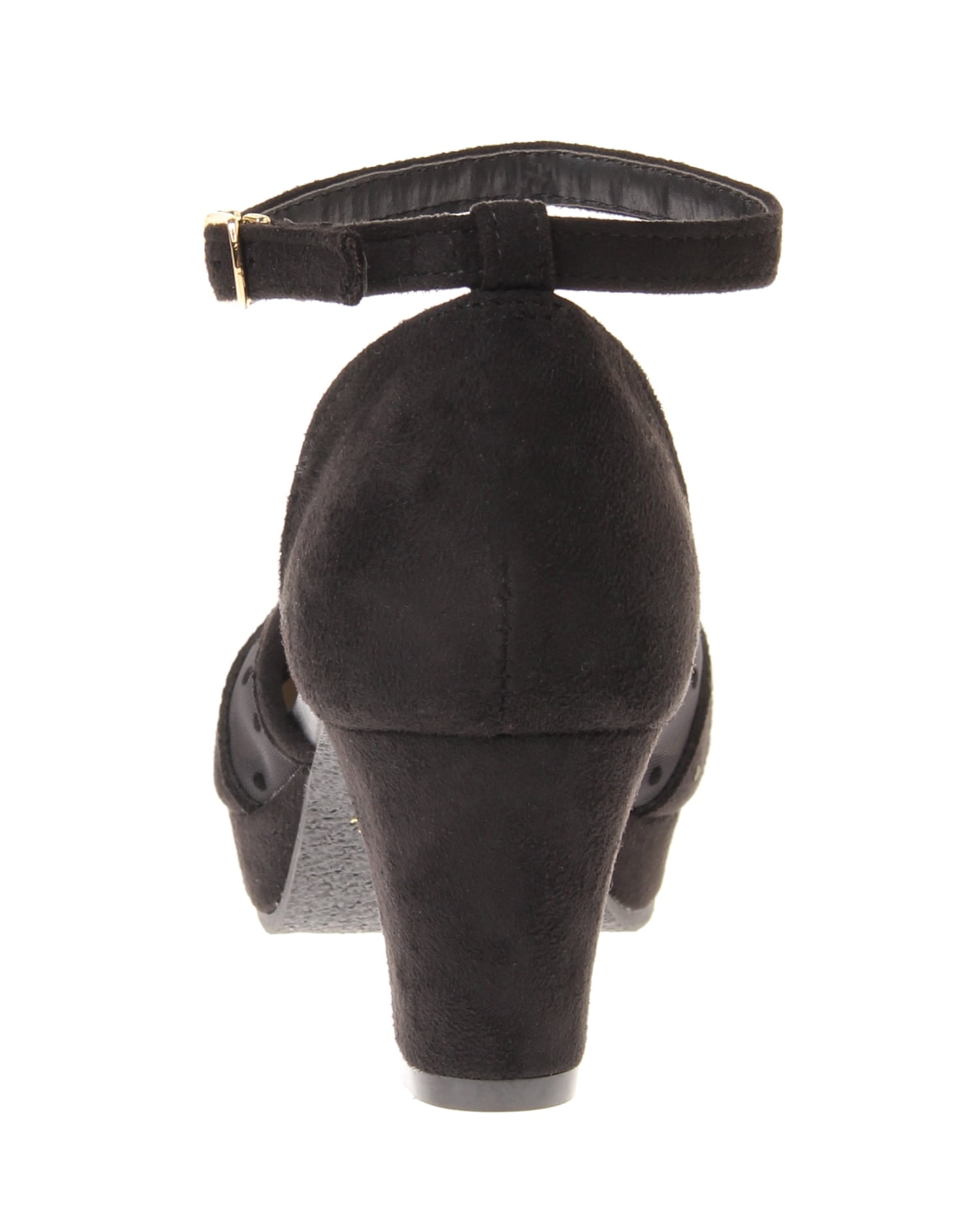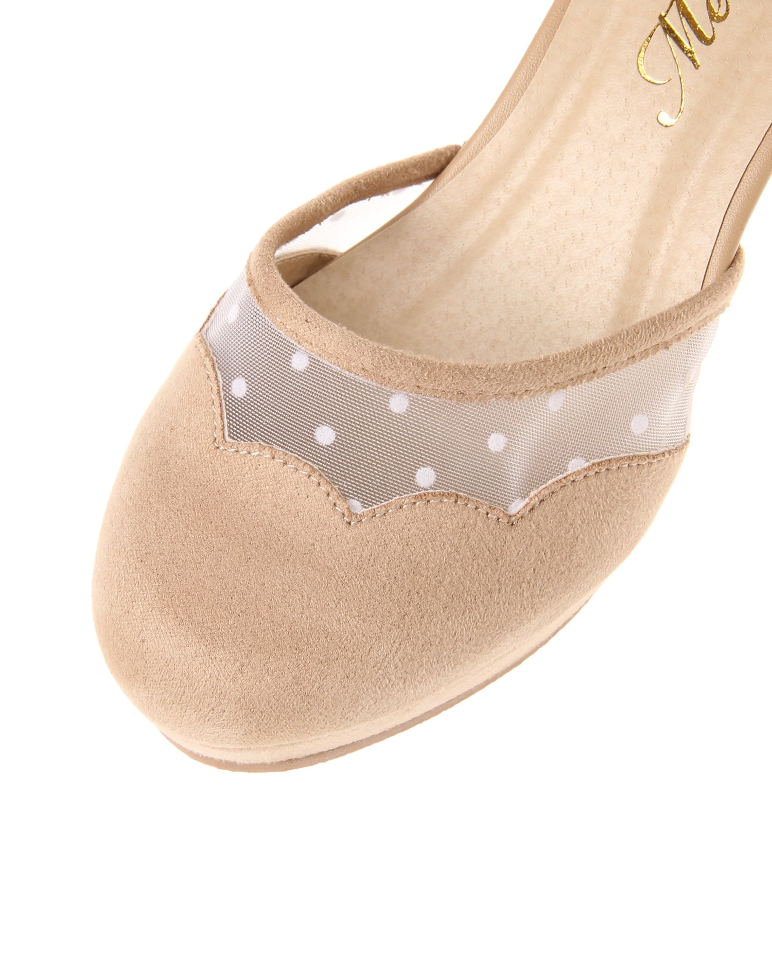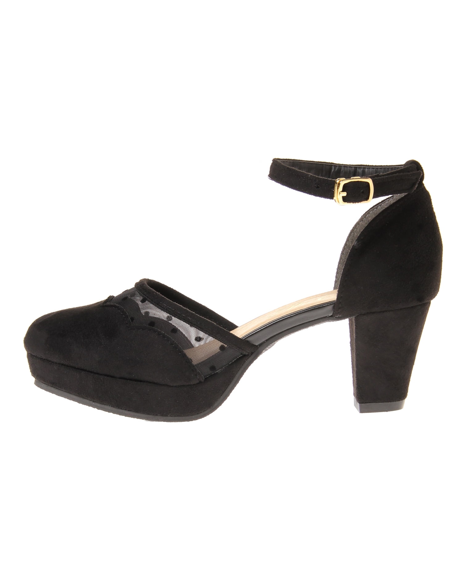 スウェードライクな素材で上品に仕上げたパンプスは脚長効果抜群のオススメアイテム。アッパー部分をスカラップとドットレースで仕上げたレディなデザインが魅力です。ストーム付きで高めのヒールも安定感があり、長時間履いても疲れにくくなっています。足首もストラップ付きでホールド感があります。スカートに合わせてとことんフェミニンはもちろん、パンツを合わせたスタイルも◎。